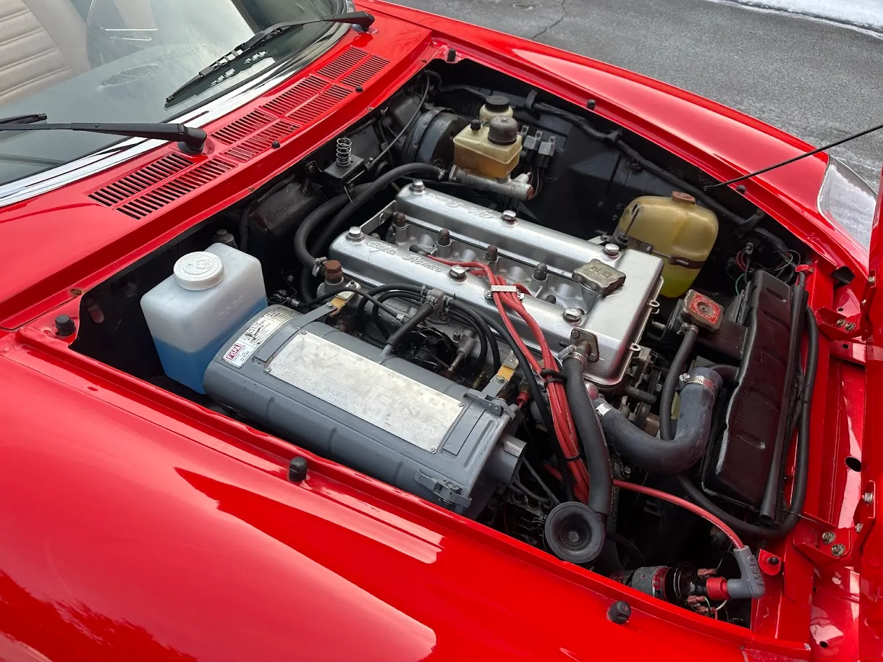 The rebuilt 2.0L twin-cam inline-four was factory rated at 111 horsepower and 116 lb-ft of torque and features SPICA mechanical fuel injection, a Darstan long-tube header, and a custom exhaust with a Magnaflow muffler. Service since 2024 included changing the oil and replacing a fuel line as well as the ignition coil and spark plugs. The factory catalytic converter has been removed.
