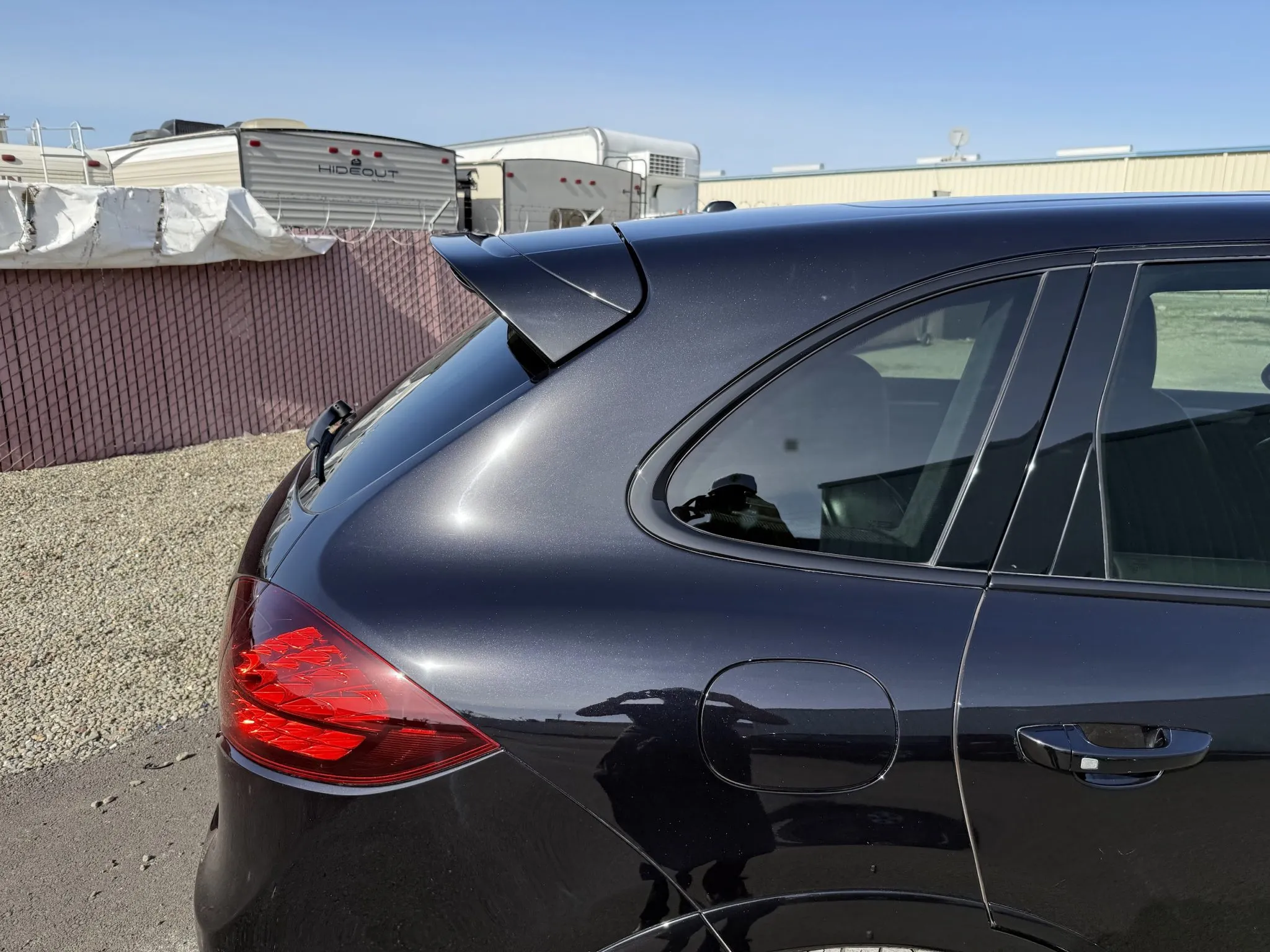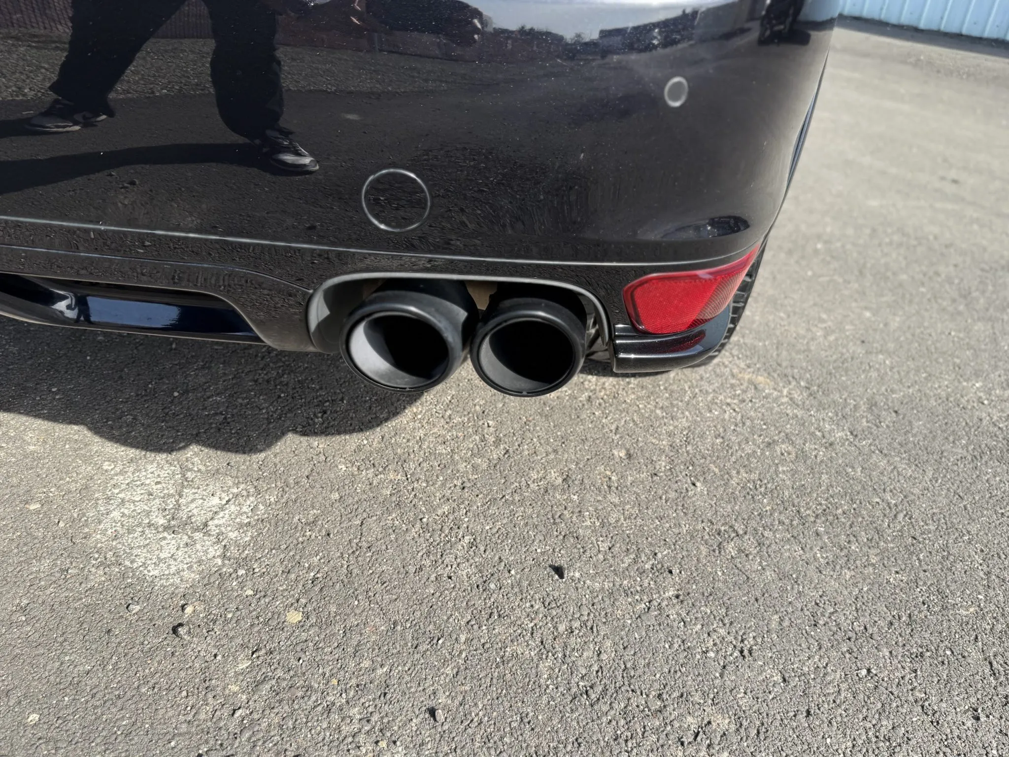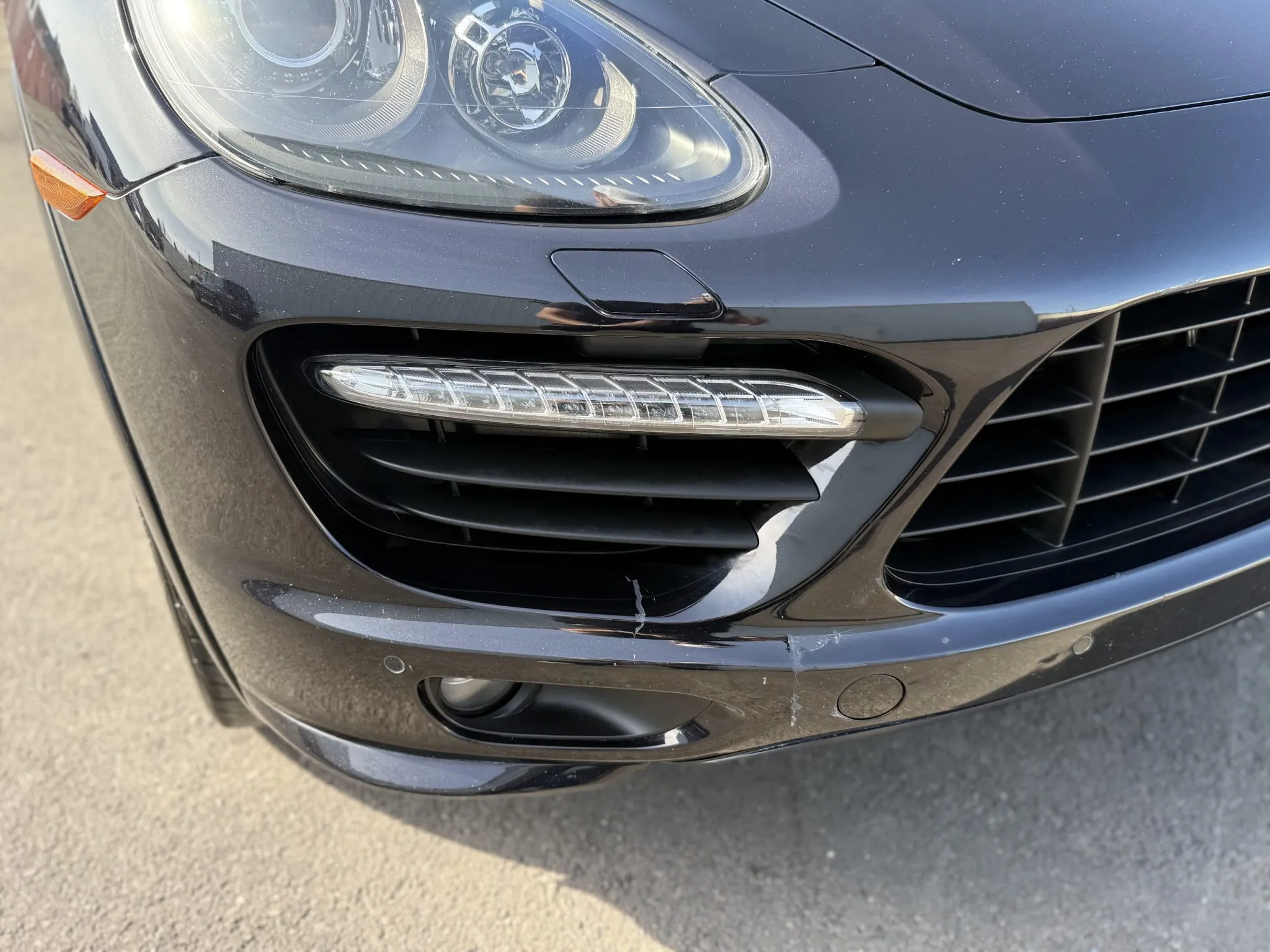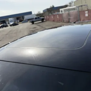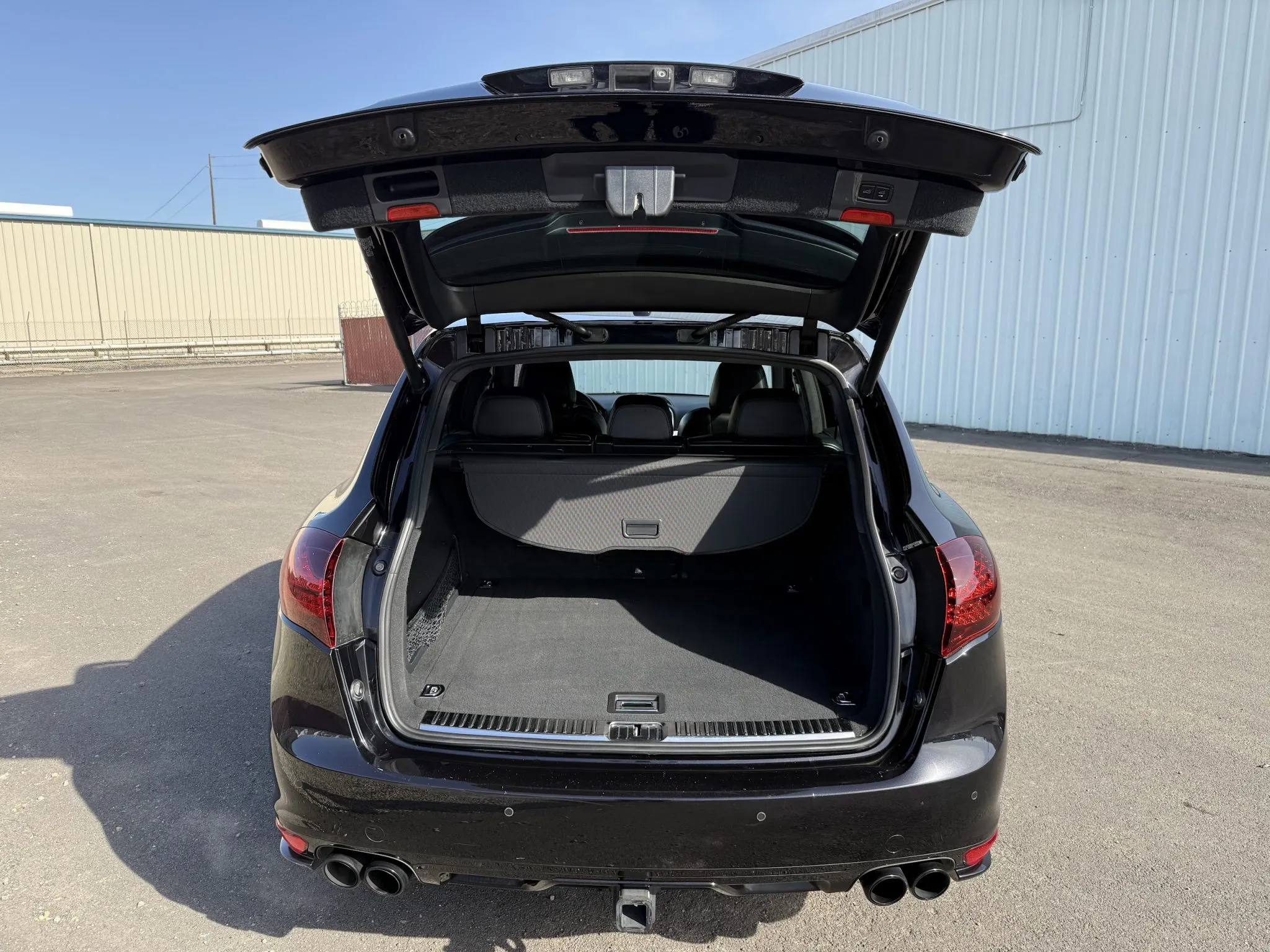 The body is finished in Jet Black Metallic and features a panoramic sunroof, a receiver hitch, xenon headlights, ParkAssist parking sensors, quad exhaust outlets, and LED taillights with tinted lenses. Wiper motor repairs are noted in the Carfax report in September 2024. The front bumper cover has peeling clearcoat, and other blemishes are pointed out in the photo gallery below.