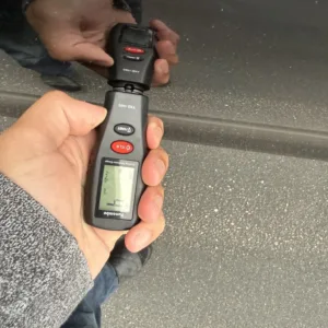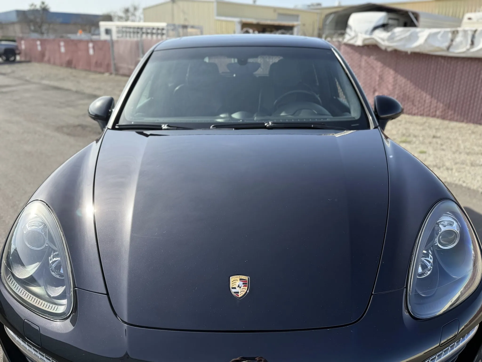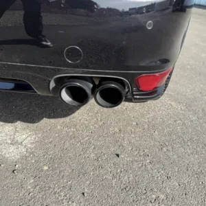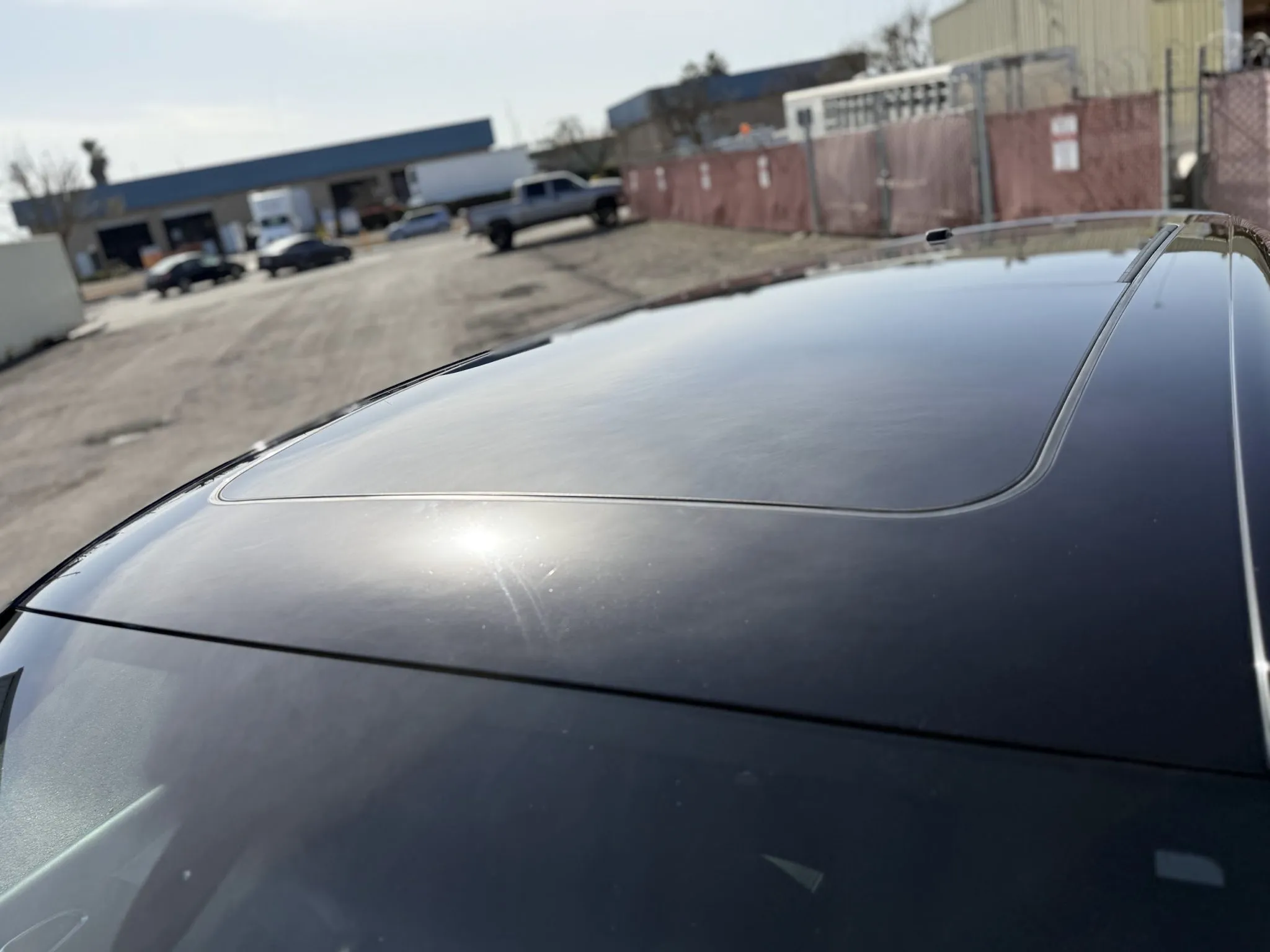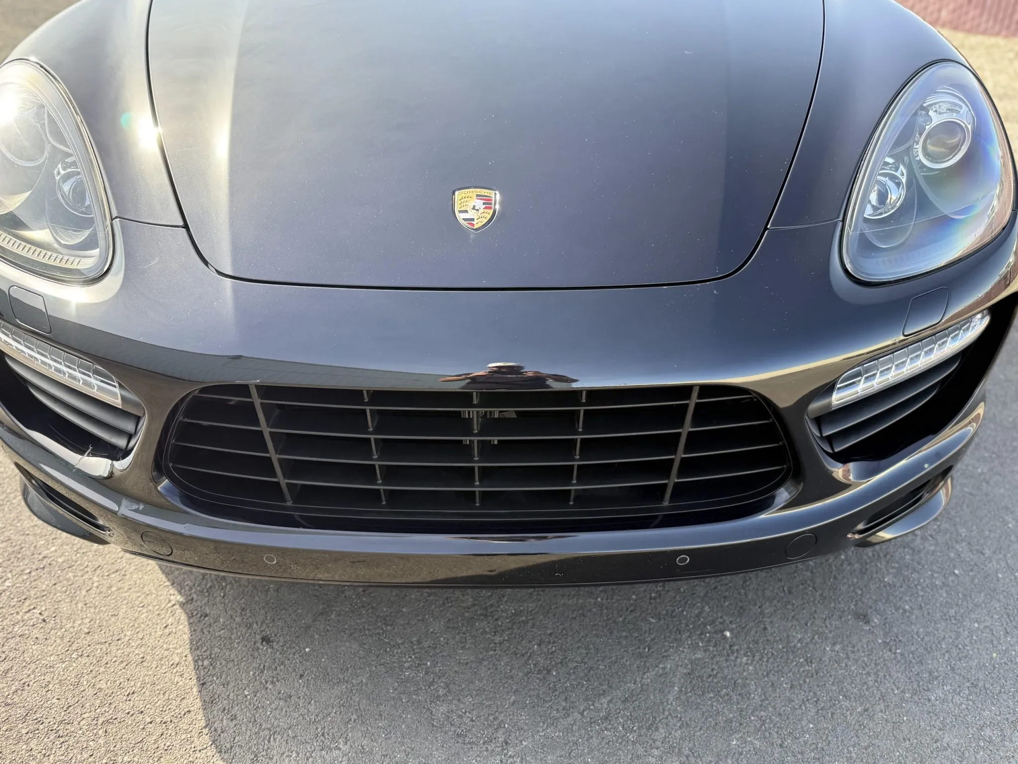 The body is finished in Jet Black Metallic and features a panoramic sunroof, a receiver hitch, xenon headlights, ParkAssist parking sensors, quad exhaust outlets, and LED taillights with tinted lenses. Wiper motor repairs are noted in the Carfax report in September 2024. The front bumper cover has peeling clearcoat, and other blemishes are pointed out in the photo gallery below.