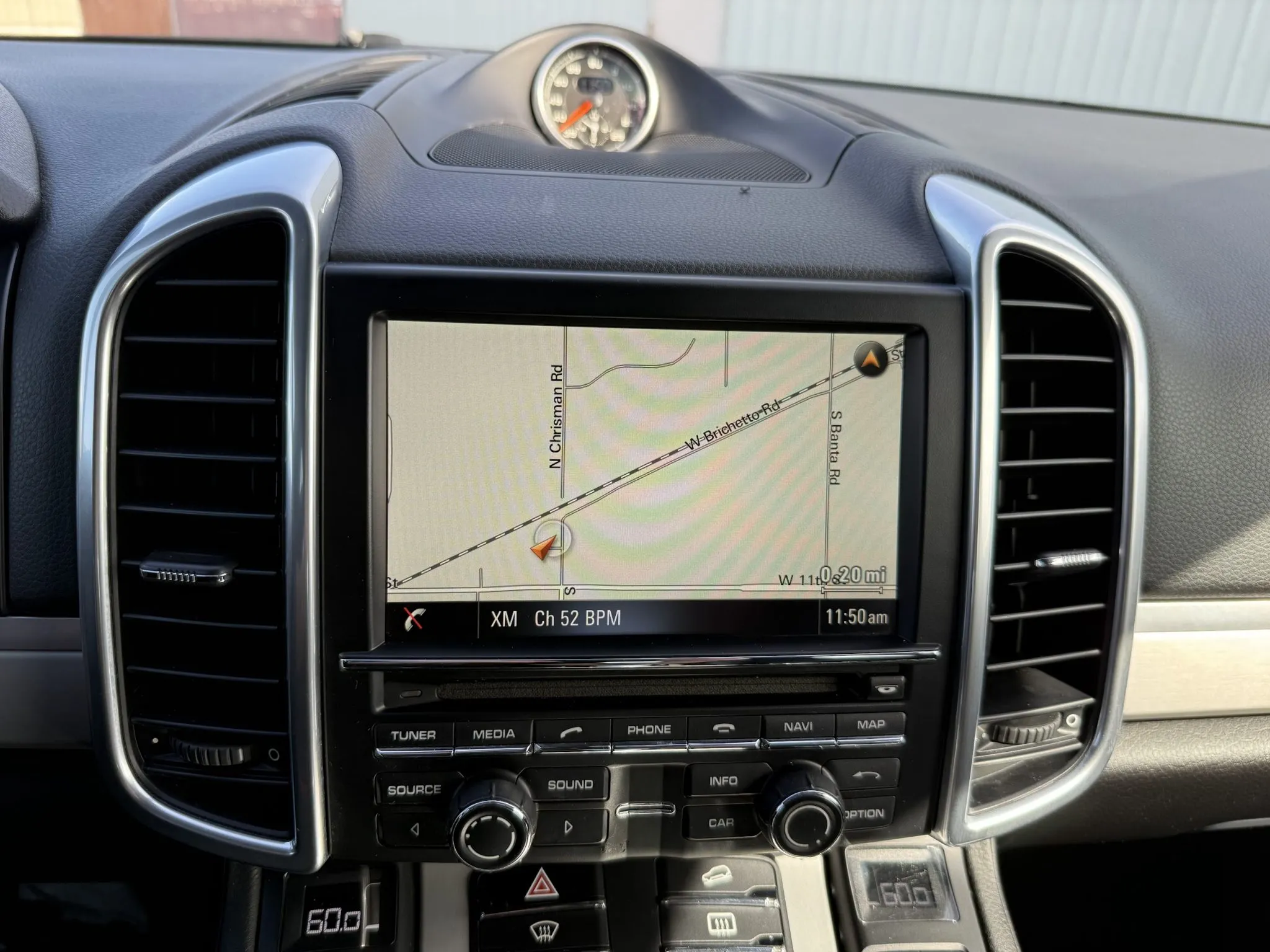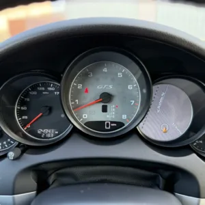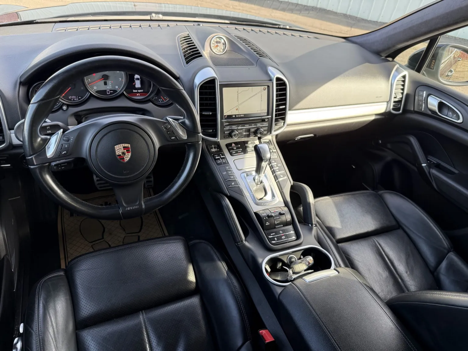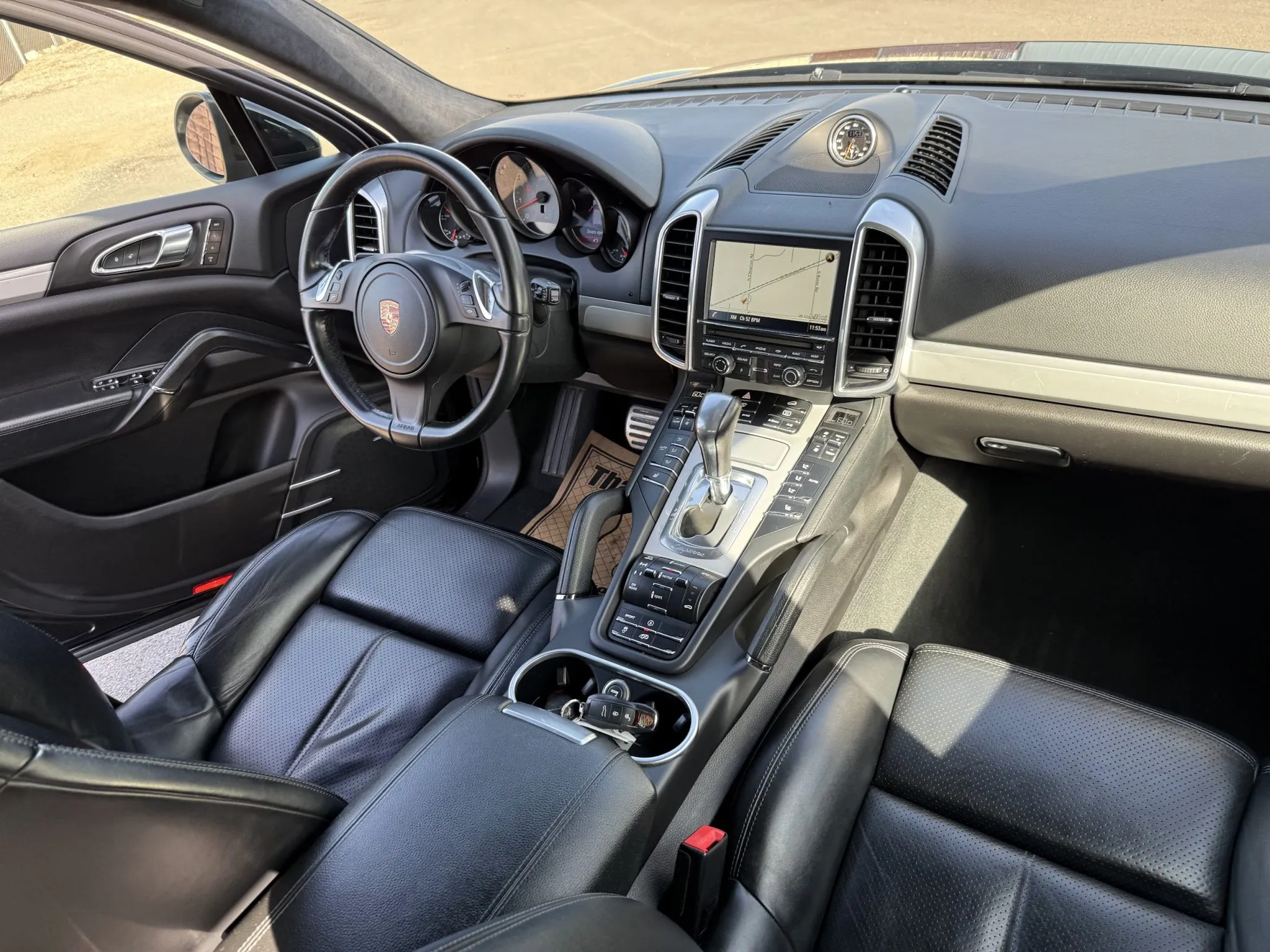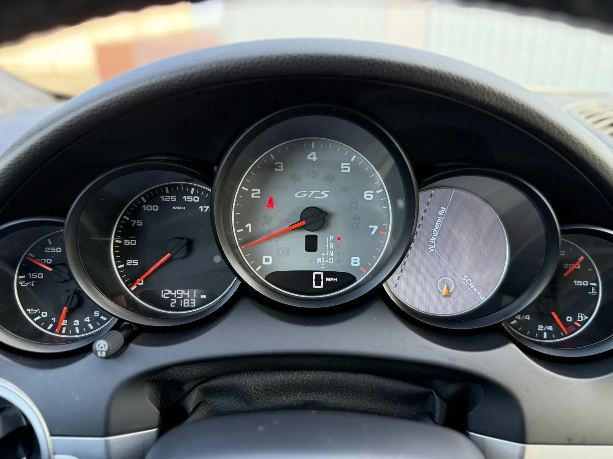 The leather-wrapped steering wheel is equipped with shift buttons and frames factory instrumentation. The Sport Chrono Package added a stopwatch atop the dashboard. The digital odometer indicates 125k miles.