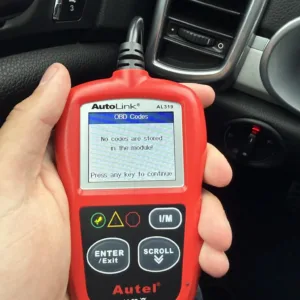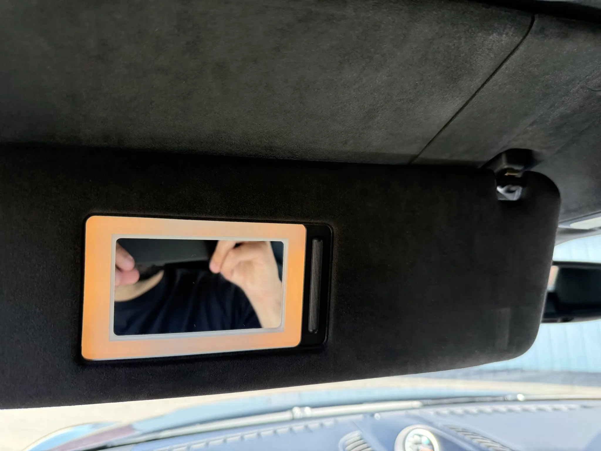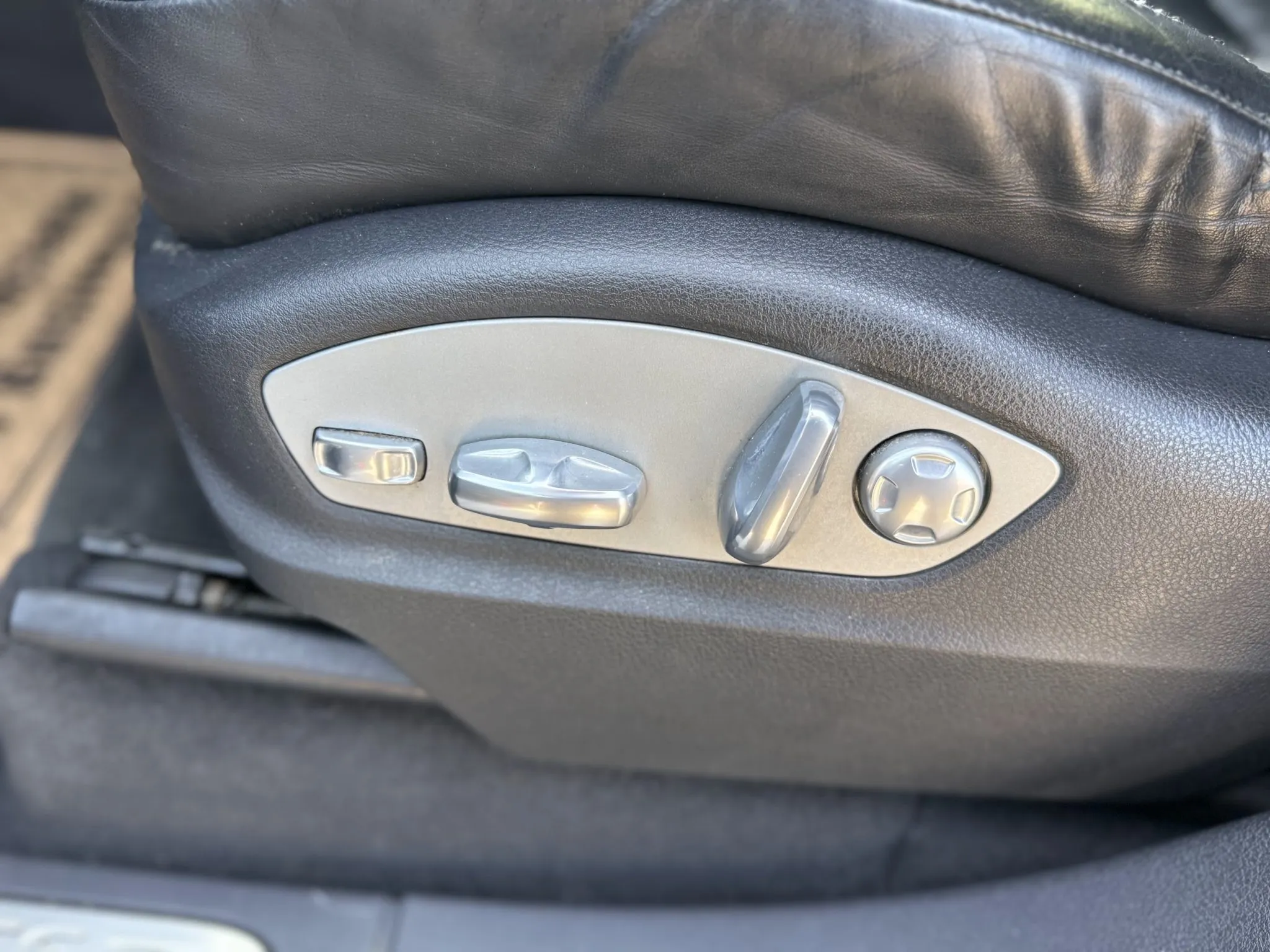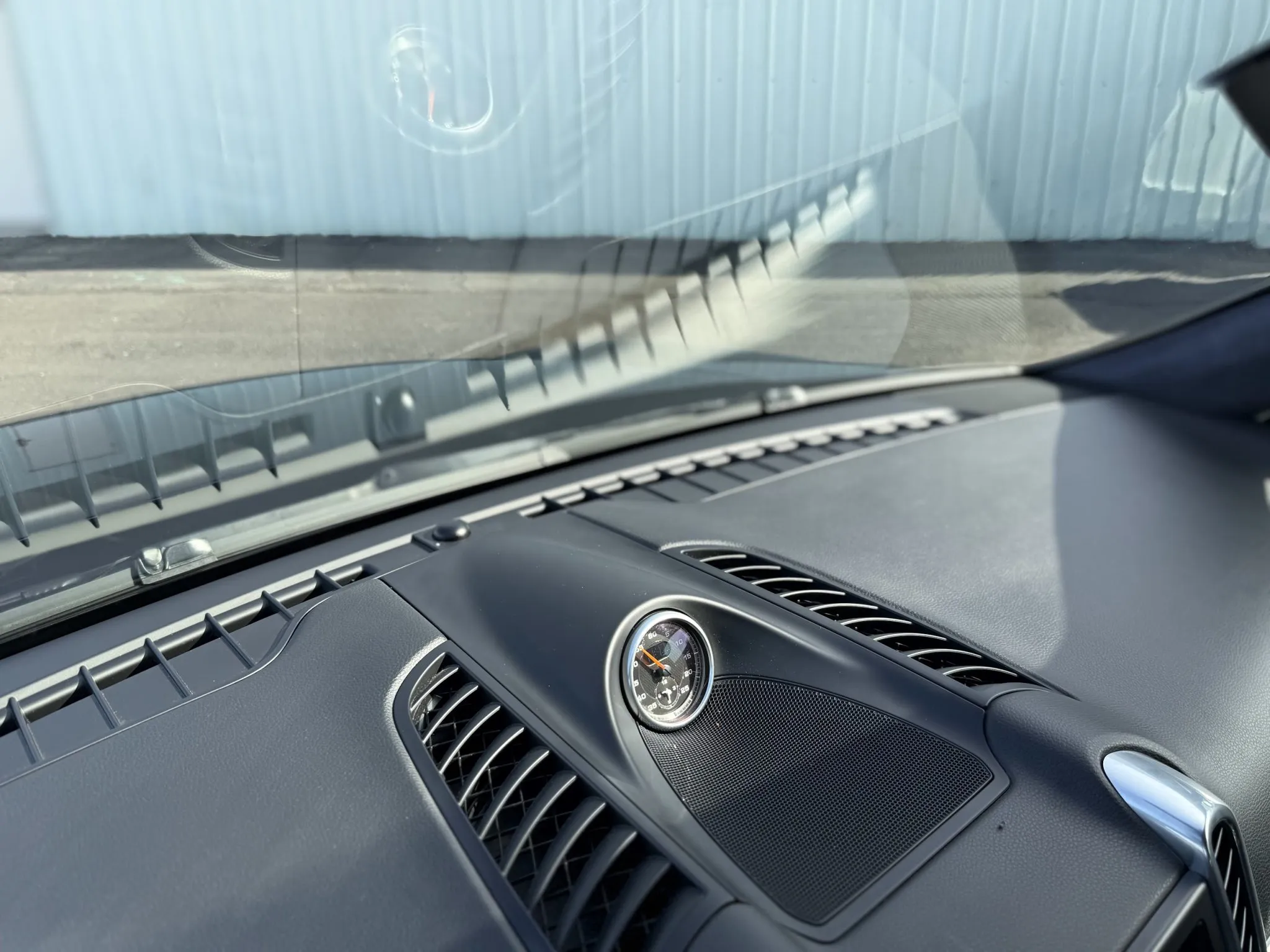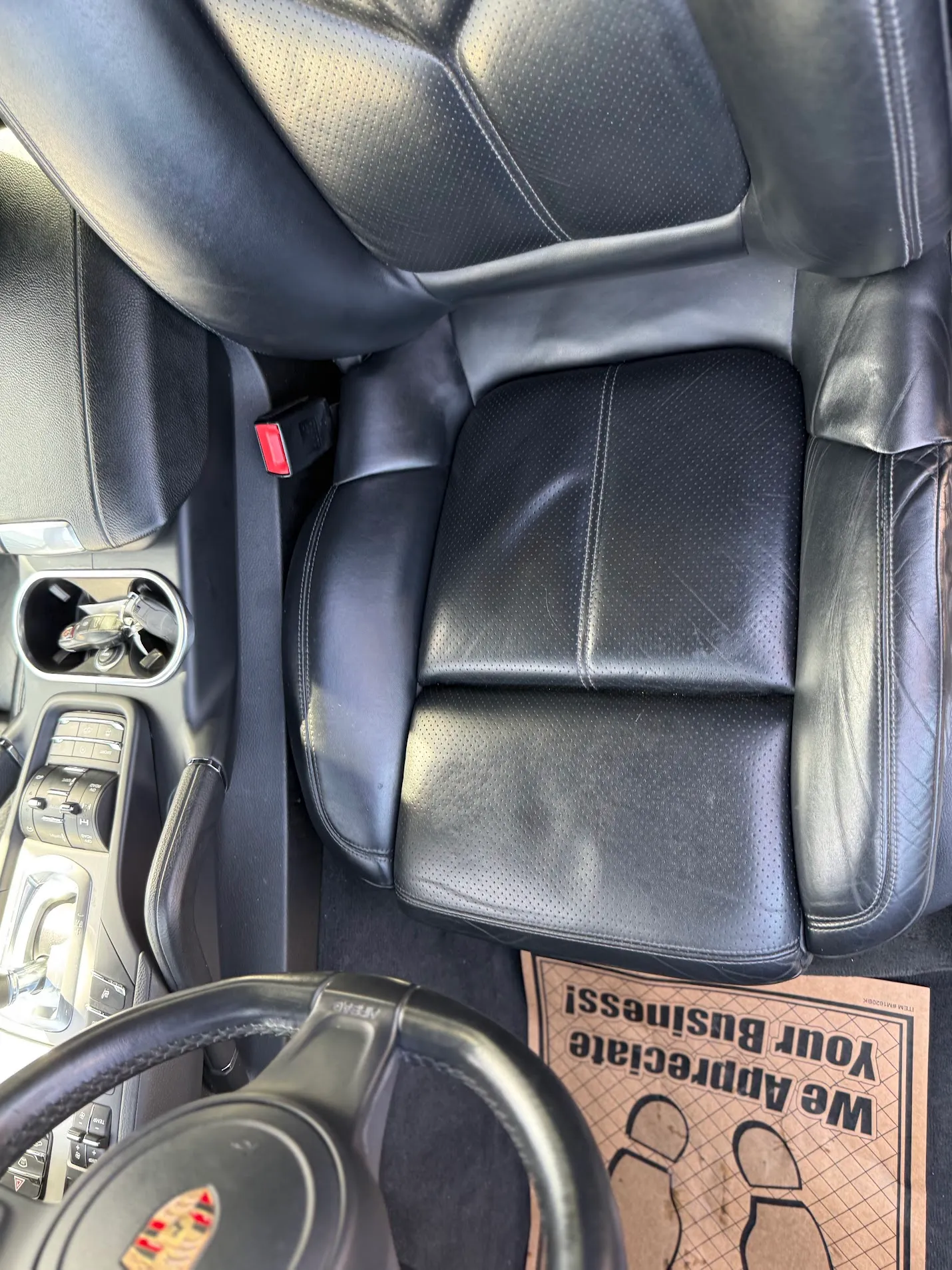 The leather-wrapped steering wheel is equipped with shift buttons and frames factory instrumentation. The Sport Chrono Package added a stopwatch atop the dashboard. The digital odometer indicates 125k miles.