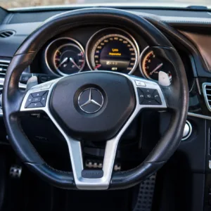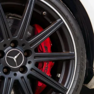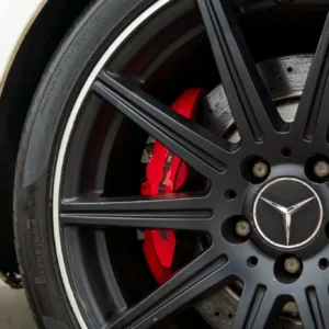 Black-finished 19″ AMG 10-spoke alloy wheels wear Pirelli P Zero tires that were fitted in June 2021. Stopping power is provided by AMG-branded calipers fitted over cross-drilled and slotted rotors at each corner. The car features an AMG Adaptive Sport Suspension with rear air springs and three driver-selectable modes.