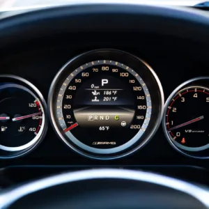 The AMG Performance steering wheel features paddle shifters and frames a 200-mph speedometer and a tachometer with a 6,400-rpm redline as well as gauges for coolant temperature and fuel level. The digital odometer indicates 54k miles.