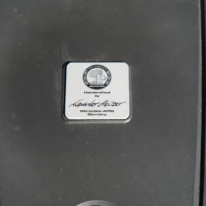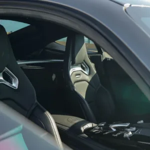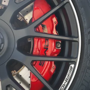 Black-finished 19″ and 20″ AMG forged multi-spoke wheels are mounted with Michelin Pilot Super Sport tires. The AMG Dynamic Plus Package specified firmer dampers, reprofiled steering, and increased negative front-wheel camber. Red-finished calipers are fitted over cross-drilled and slotted discs at all four corners.
