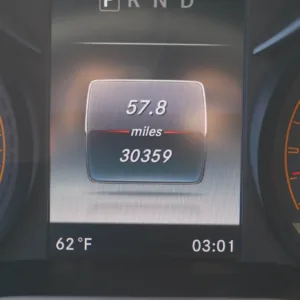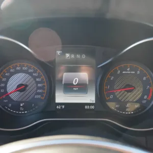 The microsuede-wrapped AMG Performance steering wheel is equipped with shift paddles and frames a 200-mph speedometer, a tachometer, and a central configurable digital display. The digital odometer indicates 30k miles, approximately 8k of which were added under current ownership.
