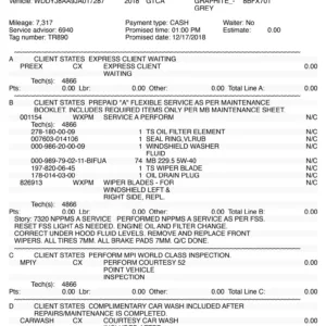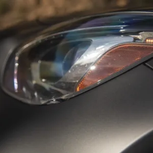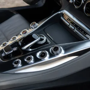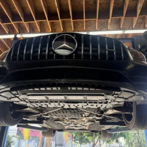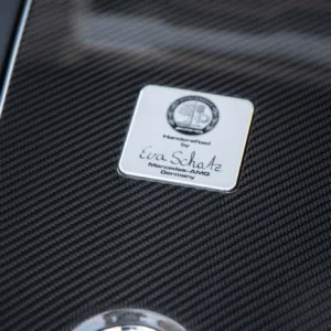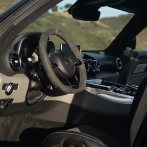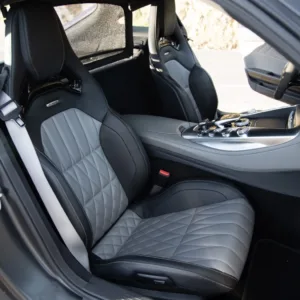 The car is finished in Graphite Gray Magno and features AMG “Edition 50” badging as well as a black chrome front splitter, fender vent strakes, side skirt inserts, and rear diffuser trim as part of the Edition 50 Package. Additional equipment includes a speed-activated rear spoiler, Parktronic, and LED headlights and taillights. A January 2023 entry in the Carfax report notes that the car received “minor damage” to the right front. The seller tells us this was the result of a scrape at the front that was repaired. Scratches and scuffs are visible on the right-rear wheel arch and underside of the front bumper, the left headlight lens is chipped, and there is a hole in the leading-edge of the front belly pan.