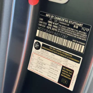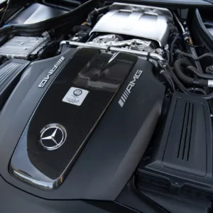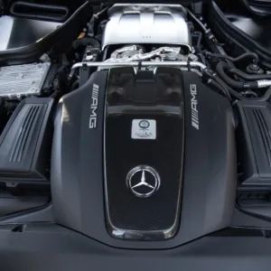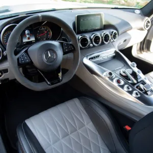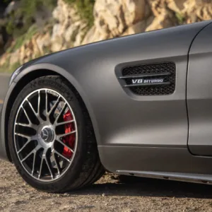 The 19″ and 20″ silver AMG forged cross-spoke wheels are mounted with Michelin Pilot Super Sport tires that show 2017 date codes. Red-finished calipers are fitted over cross-drilled and slotted discs at all four corners. The car came equipped from the factory with an AMG Adaptive Sport Suspension and rear-axle steering. The car features adaptive coilover suspension with driver-selectable modes.