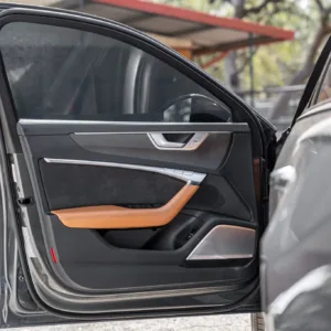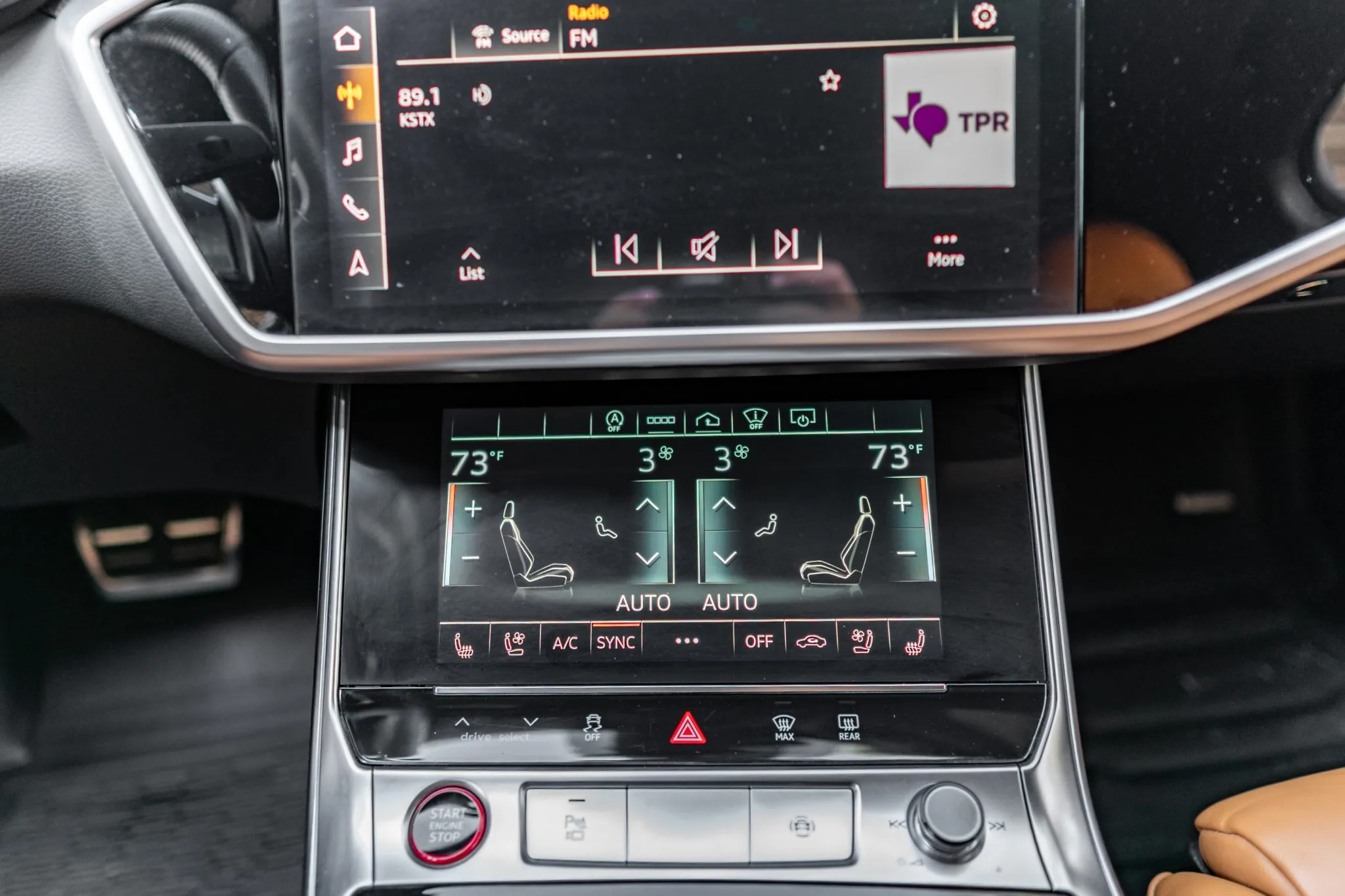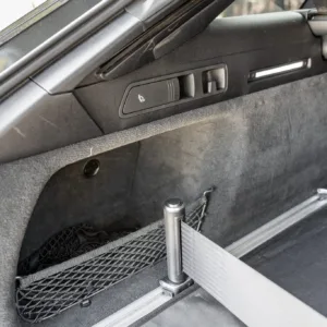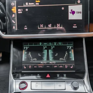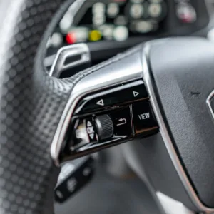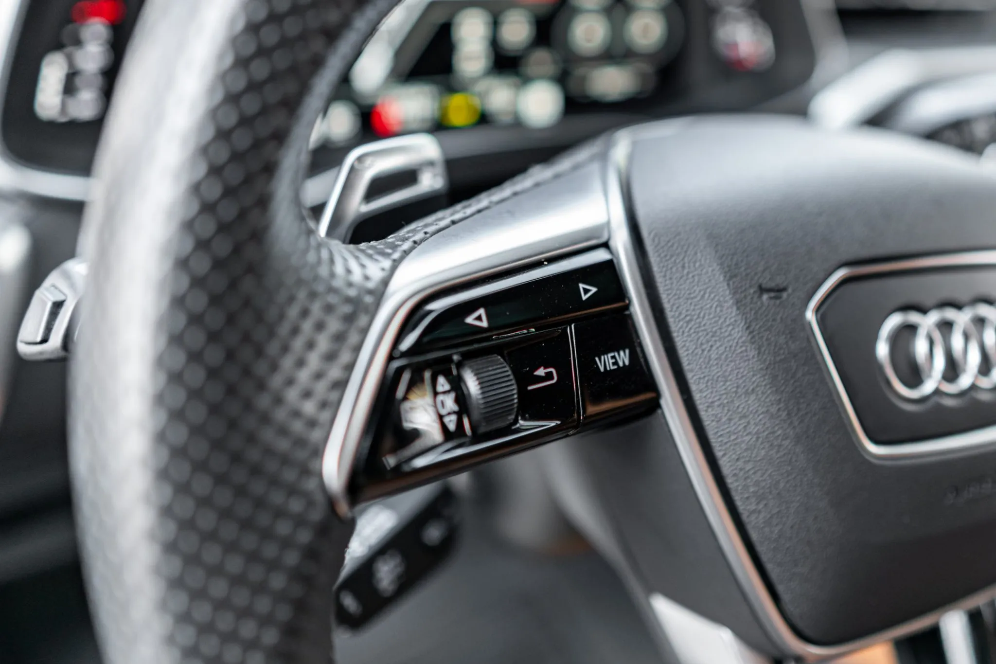 The heated leather-wrapped steering wheel is equipped with shift paddles, and it frames an Audi Virtual Cockpit Plus 12.3″ digital instrument cluster with a digital speedometer, a tachometer, and supplementary gauges. Additional display views show information such as tire pressure, torque, boost pressure, lap times, and G-force. The odometer indicates 24k miles, approximately 10k of which were added under current ownership.
