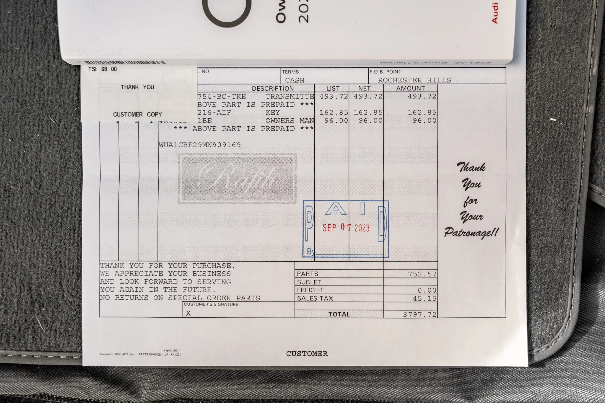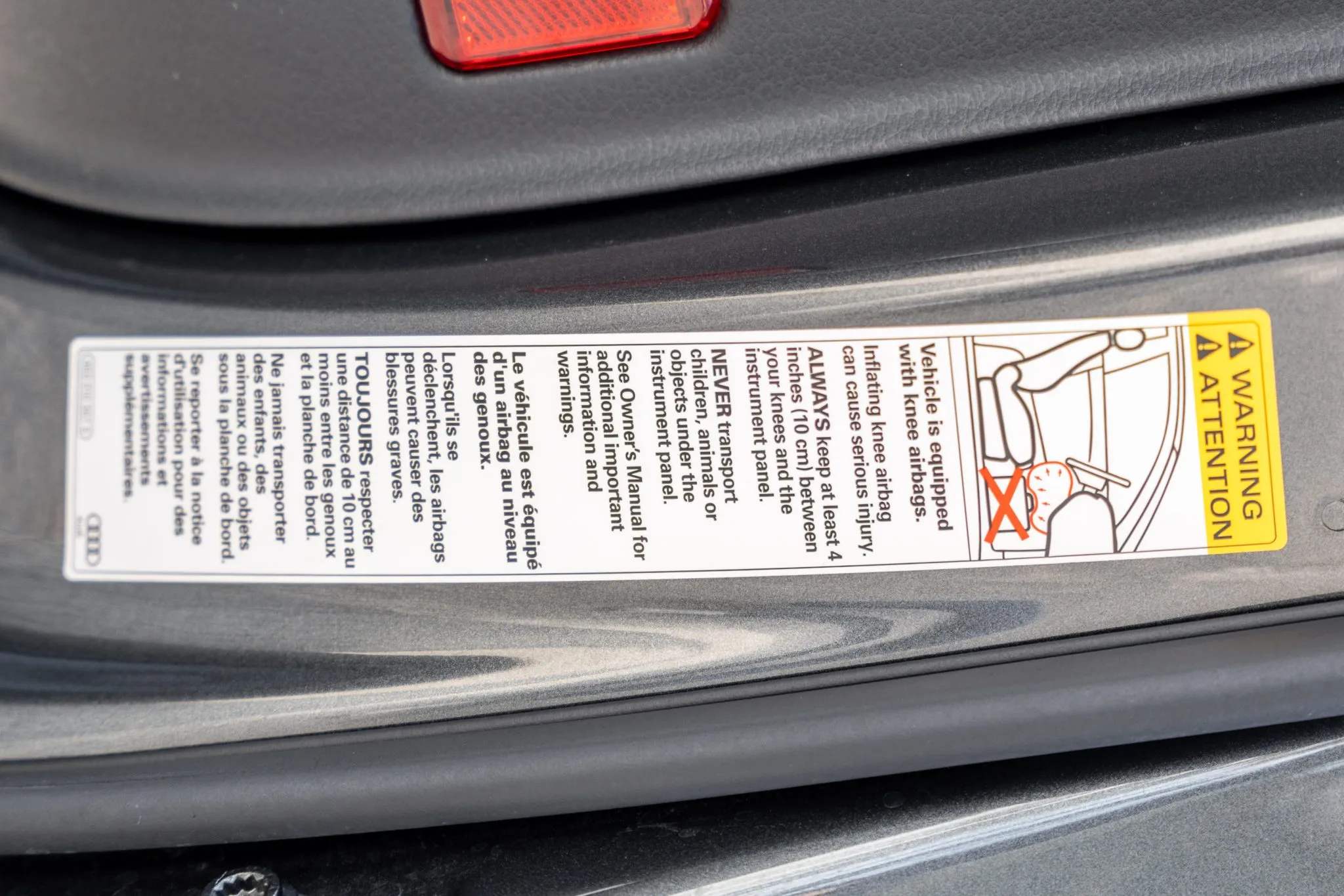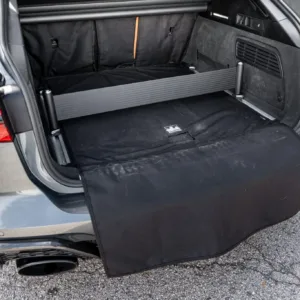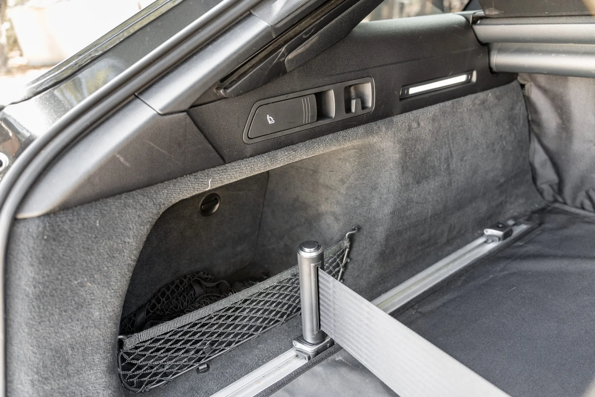 The heated leather-wrapped steering wheel is equipped with shift paddles, and it frames an Audi Virtual Cockpit Plus 12.3″ digital instrument cluster with a digital speedometer, a tachometer, and supplementary gauges. Additional display views show information such as tire pressure, torque, boost pressure, lap times, and G-force. The odometer indicates 24k miles, approximately 10k of which were added under current ownership.
