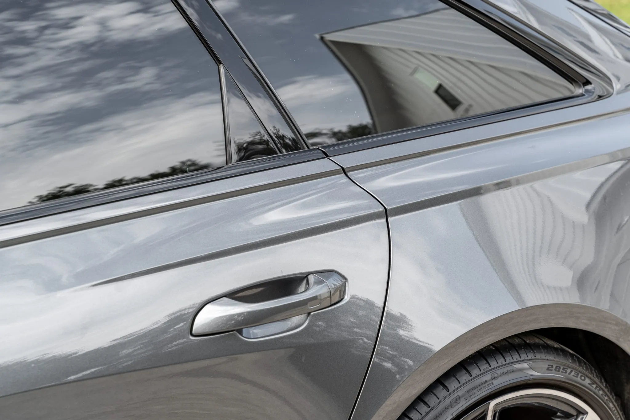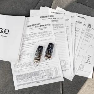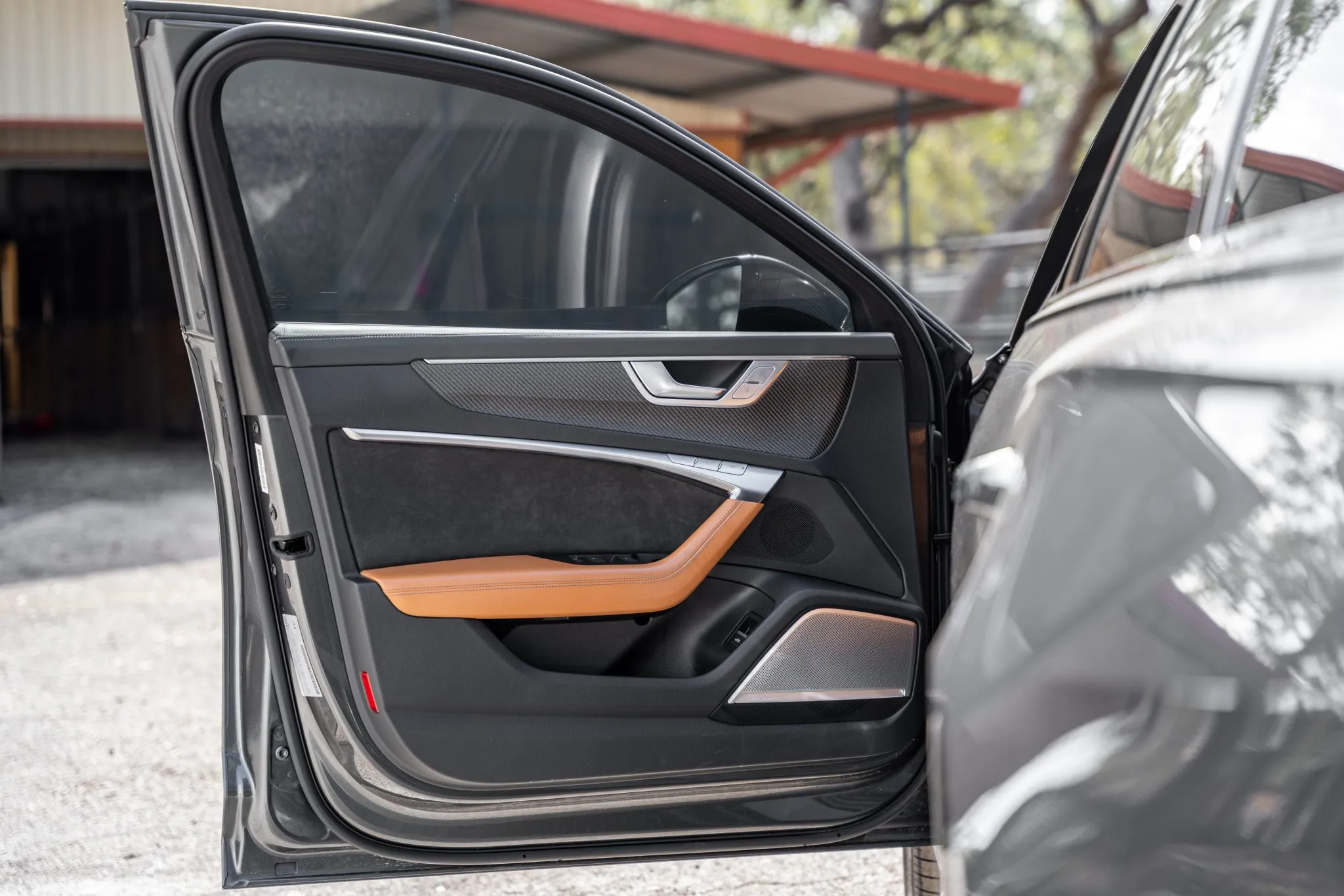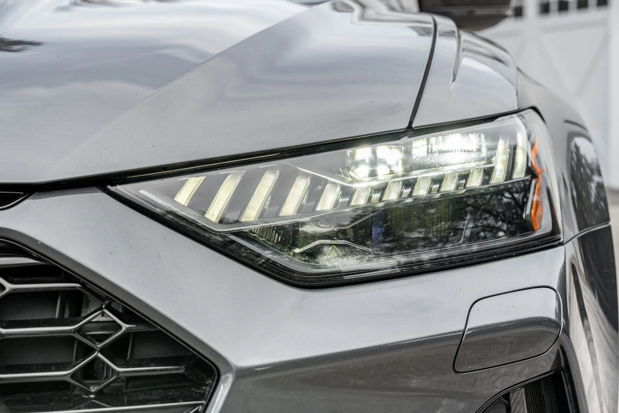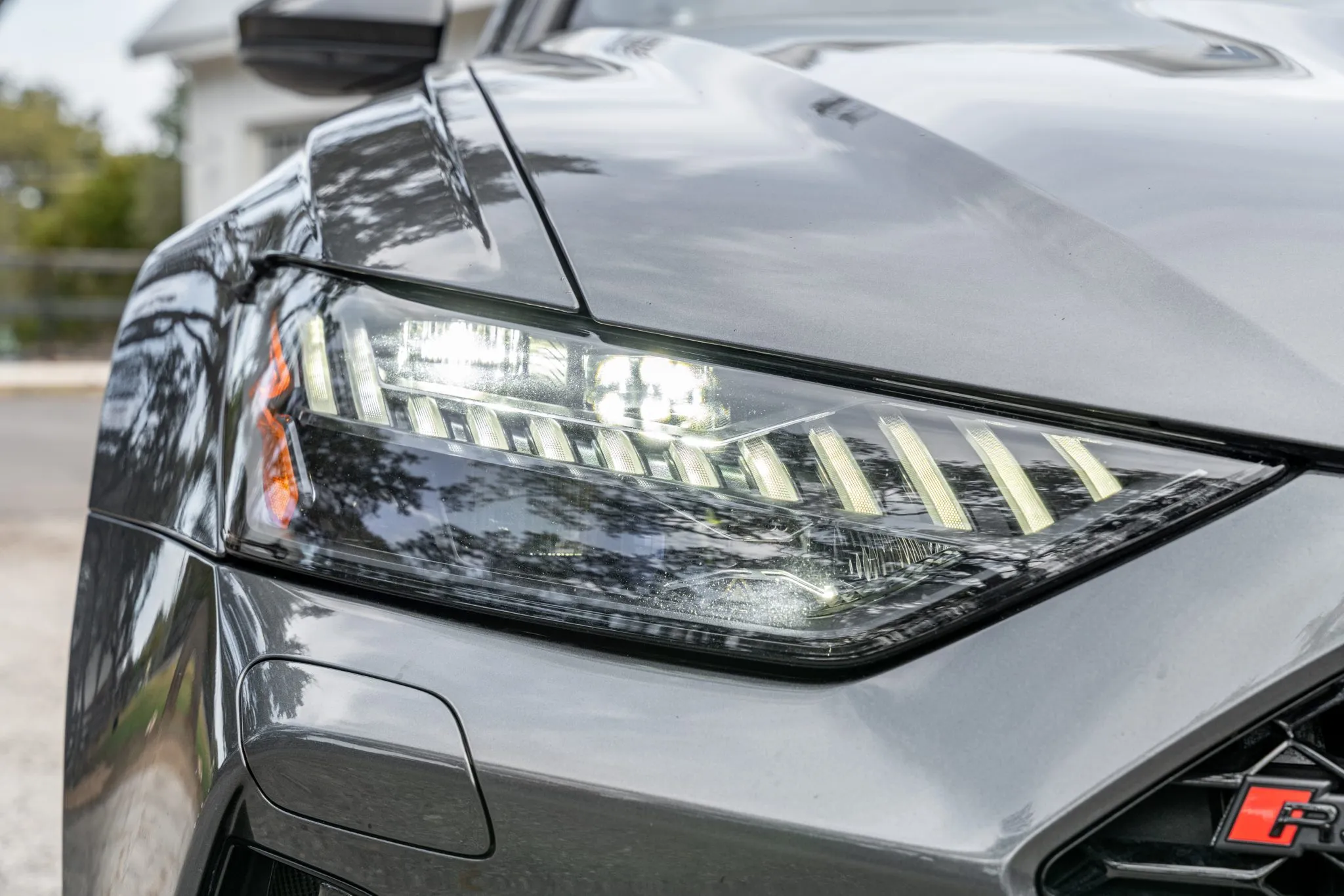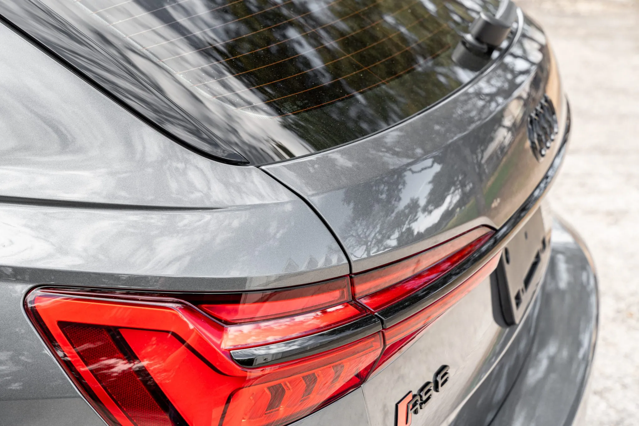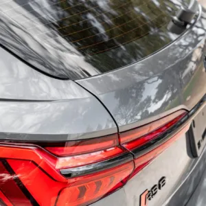 The car is finished in Daytona Gray Pearl Effect with black accents along with carbon-fiber trim as part of the Carbon Optic Exterior Package. Additional details include Matrix-Design LED headlights with Audi laser light and high beam assist as well as a sunroof, front and rear parking sensors, LED taillights, surround-view cameras, dual exhaust outlets, and a power-operated liftgate. A chip is located on the windshield, and a blemish on the paintwork is highlighted in the gallery. The rearview camera received a software update as part of a recall in February 2026.