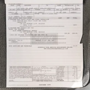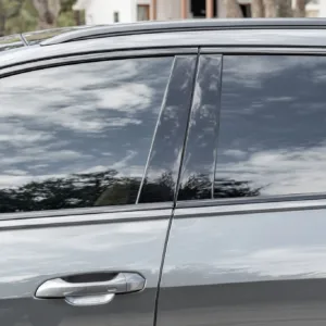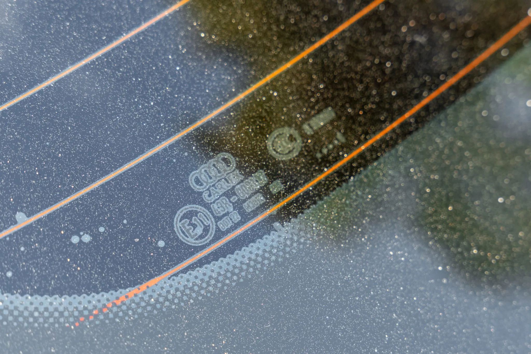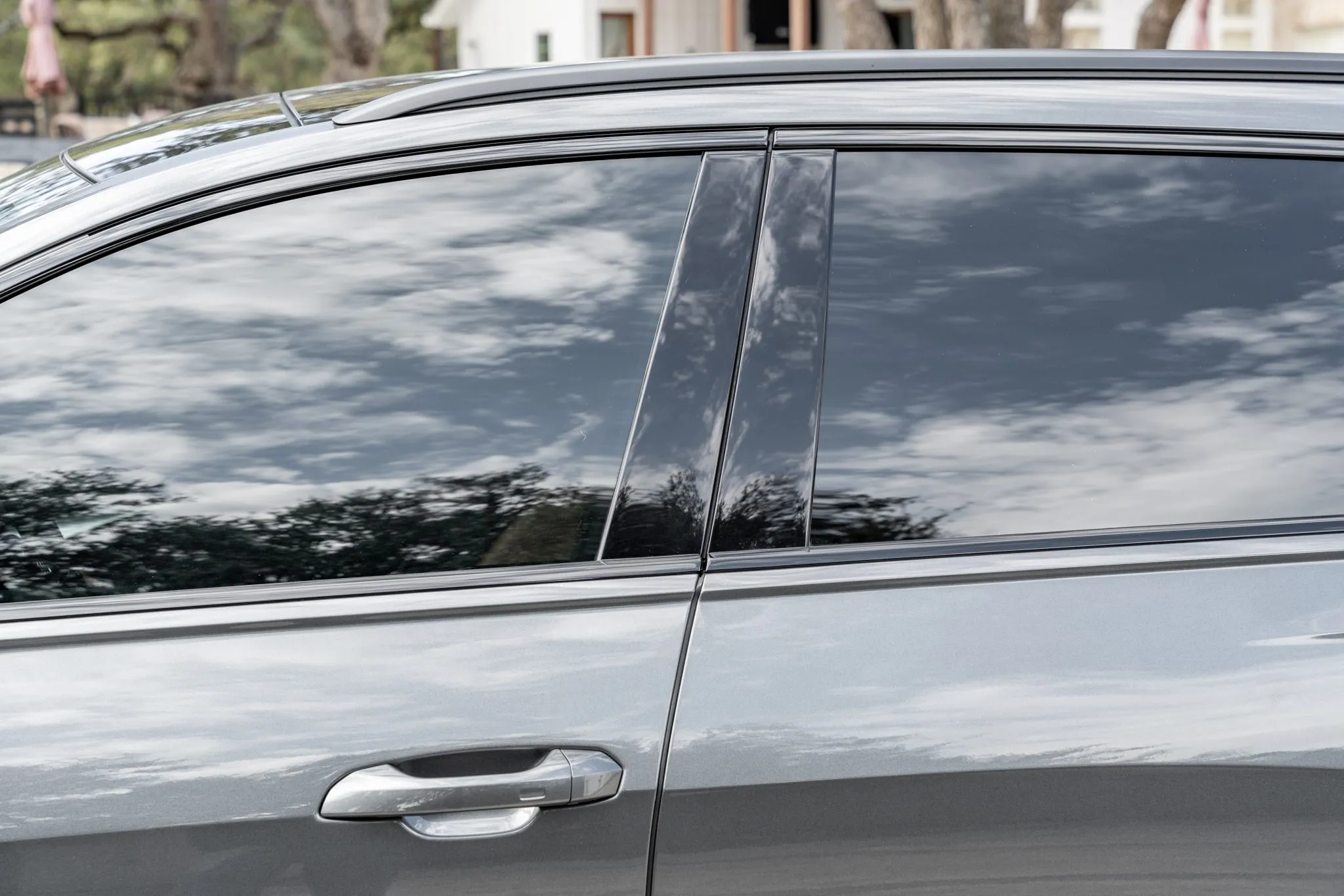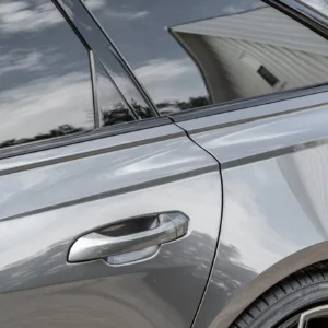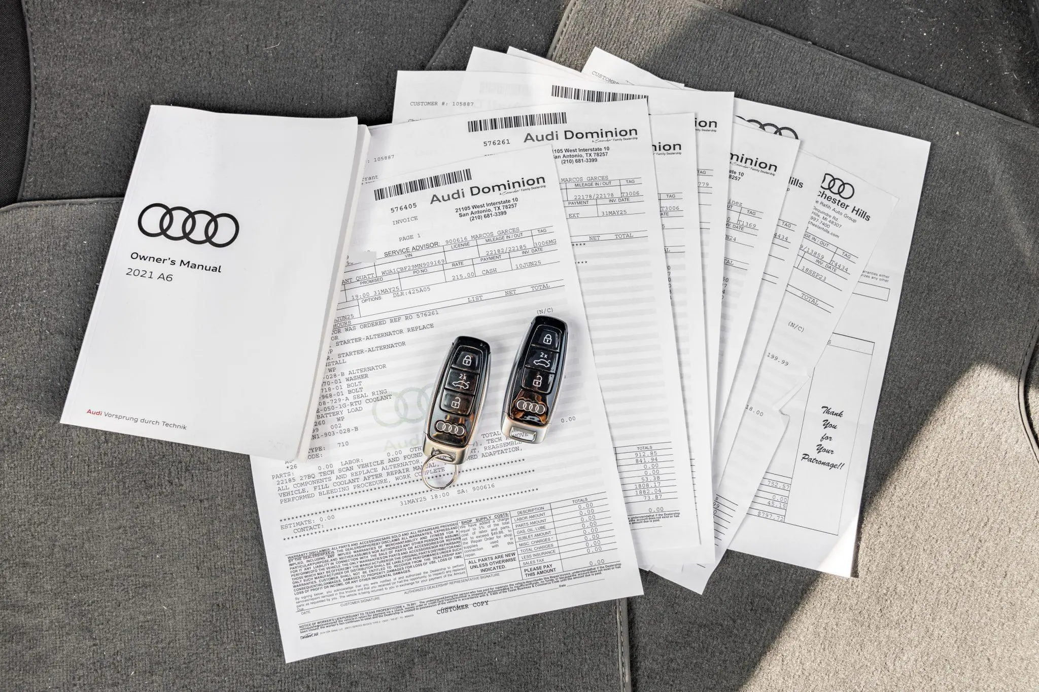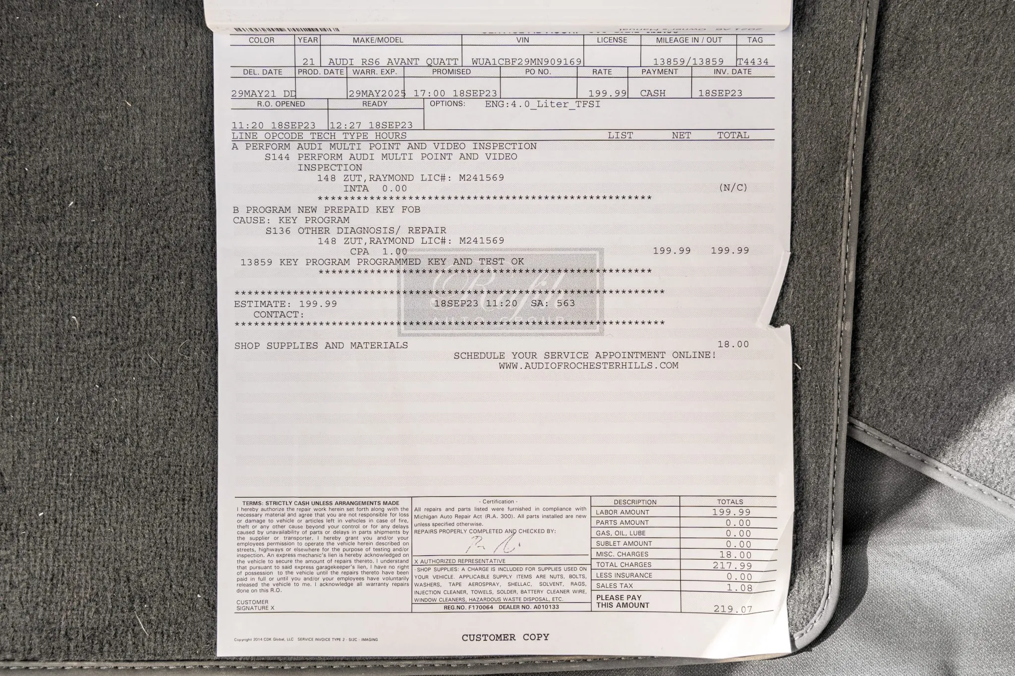 The car is finished in Daytona Gray Pearl Effect with black accents along with carbon-fiber trim as part of the Carbon Optic Exterior Package. Additional details include Matrix-Design LED headlights with Audi laser light and high beam assist as well as a sunroof, front and rear parking sensors, LED taillights, surround-view cameras, dual exhaust outlets, and a power-operated liftgate. A chip is located on the windshield, and a blemish on the paintwork is highlighted in the gallery. The rearview camera received a software update as part of a recall in February 2026.