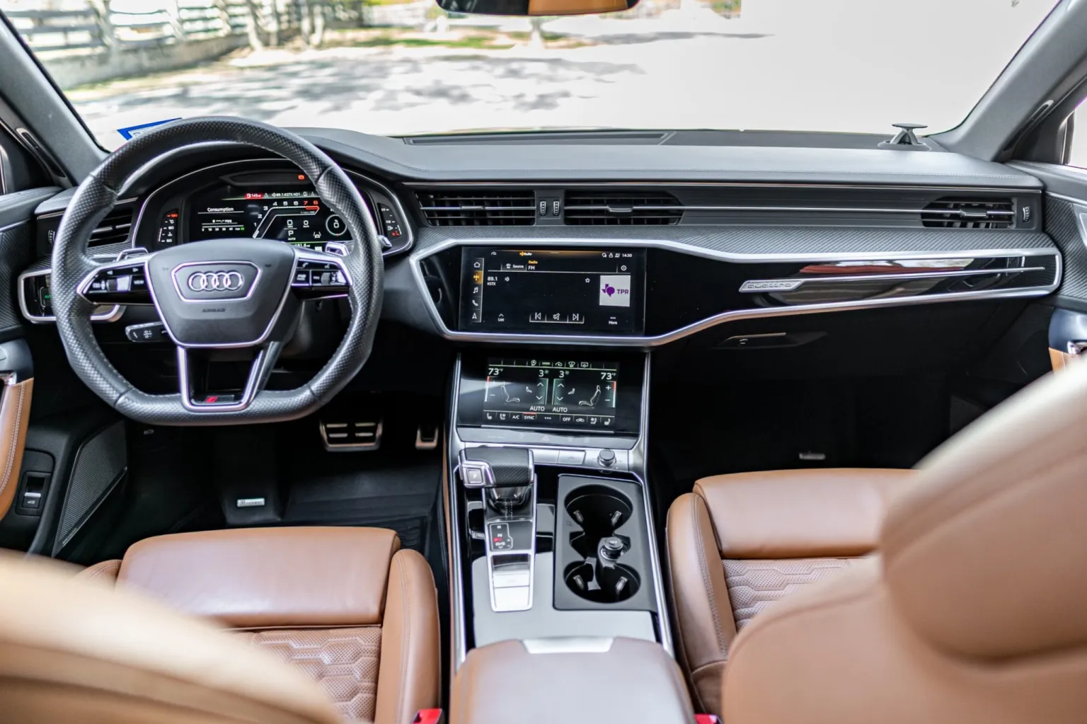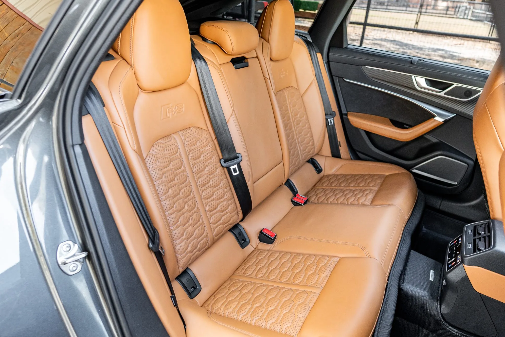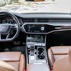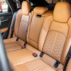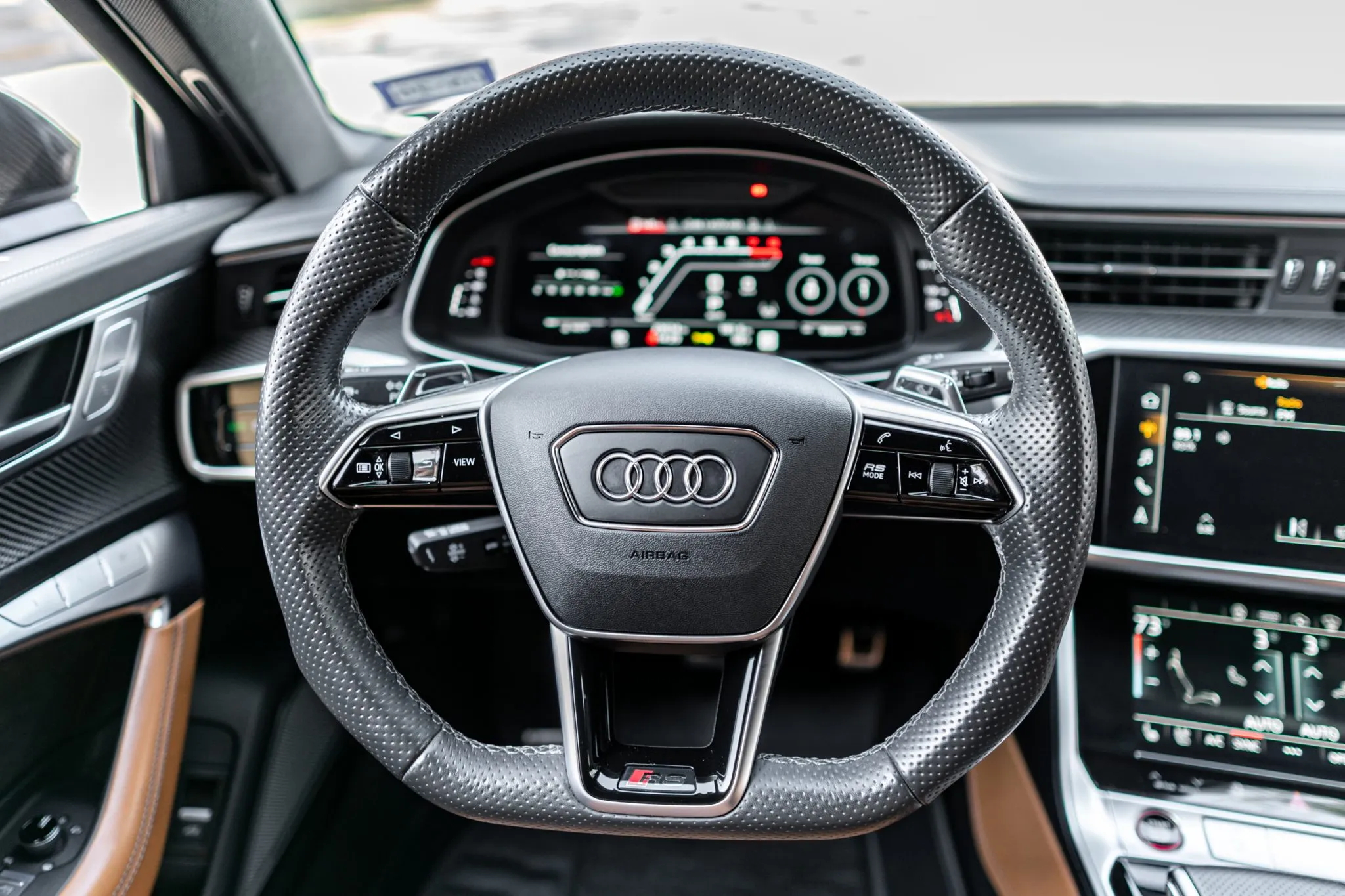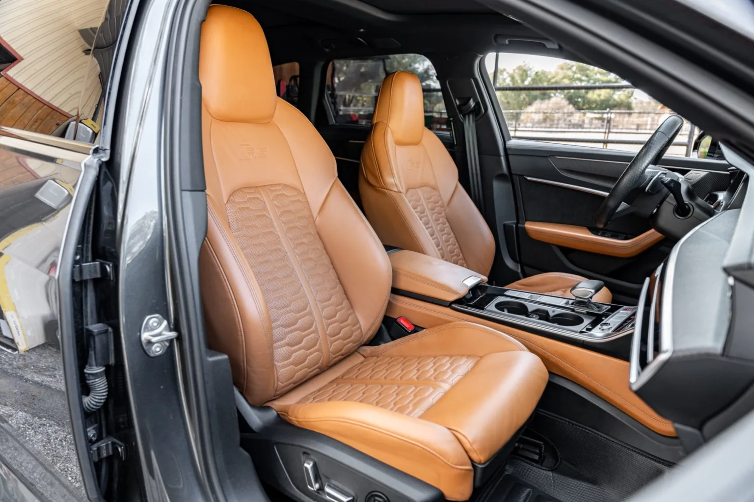 The heated and ventilated power-adjustable front RS sport seats and heated rear bench are upholstered in Cognac leather, while carbon-fiber trim accents the cabin. Debossed RS logos adorn the backrests, and additional appointments include Audi Advanced Key keyless entry, a Bang & Olufsen 3D Advanced sound system, a head-up display, night-vision assist, adaptive cruise control, an Audi Phone Box wireless charger, four-zone automatic climate control, aftermarket floor mats, rear sunshades, and Audi MMI Touch infotainment with Navigation Plus.