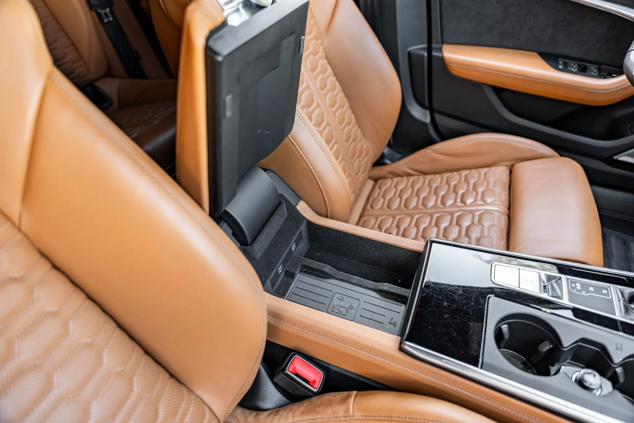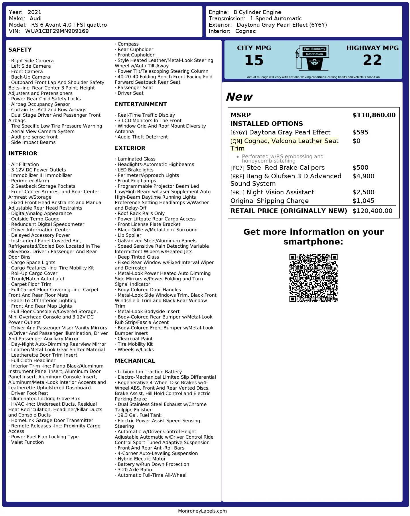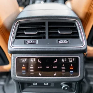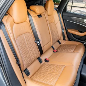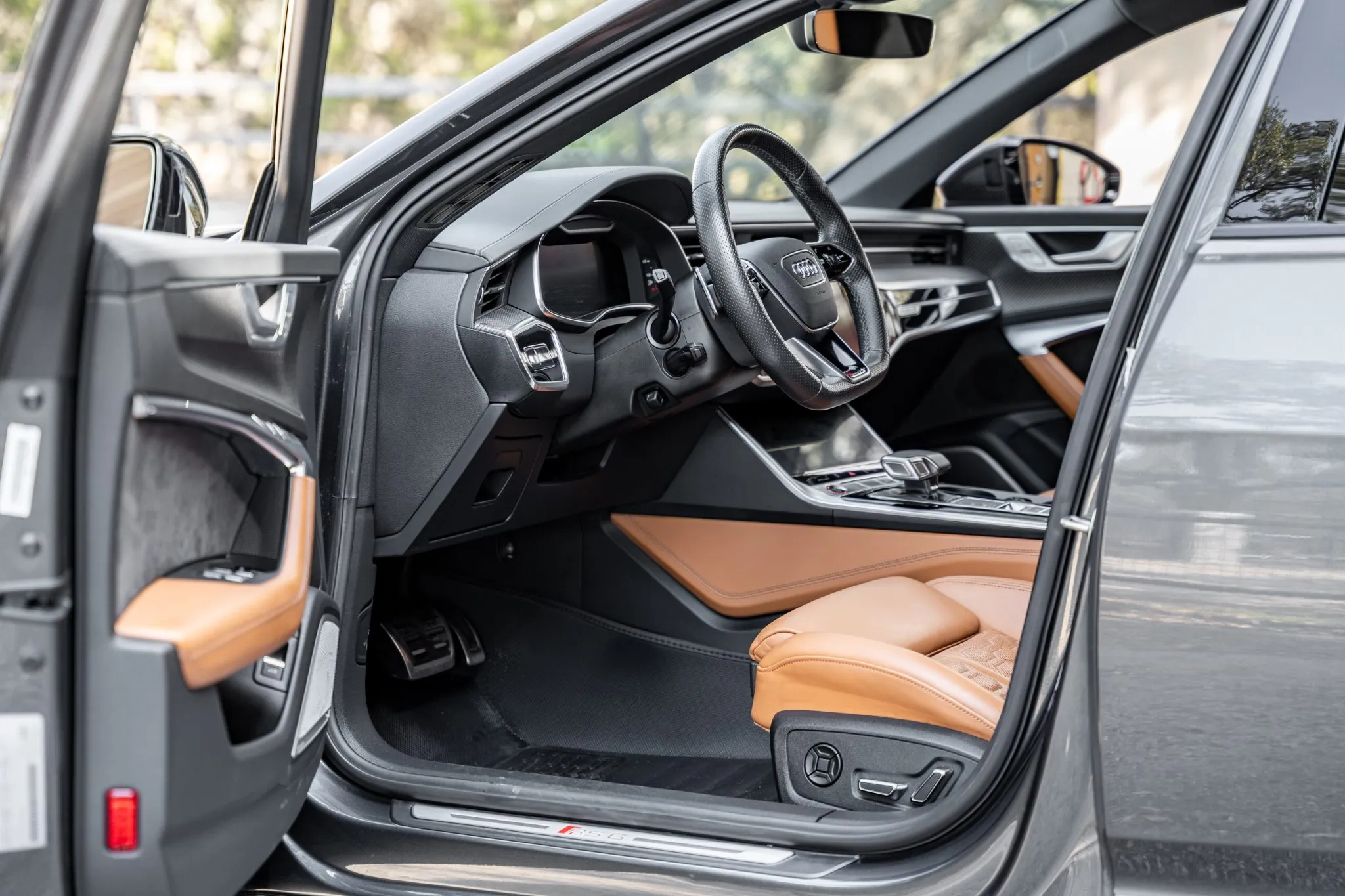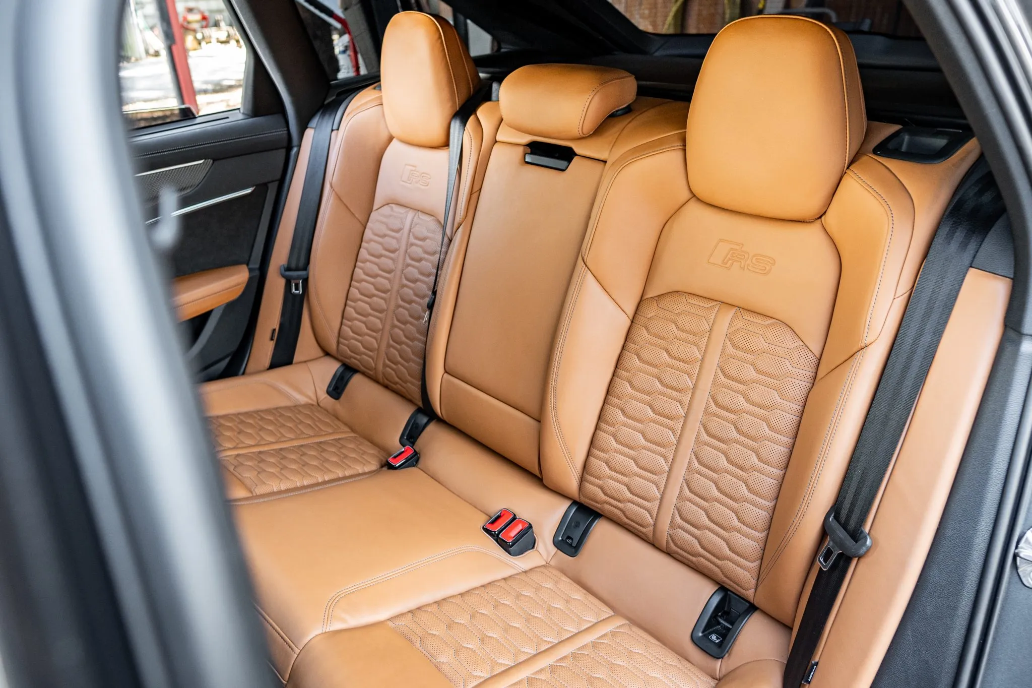The heated and ventilated power-adjustable front RS sport seats and heated rear bench are upholstered in Cognac leather, while carbon-fiber trim accents the cabin. Debossed RS logos adorn the backrests, and additional appointments include Audi Advanced Key keyless entry, a Bang & Olufsen 3D Advanced sound system, a head-up display, night-vision assist, adaptive cruise control, an Audi Phone Box wireless charger, four-zone automatic climate control, aftermarket floor mats, rear sunshades, and Audi MMI Touch infotainment with Navigation Plus.