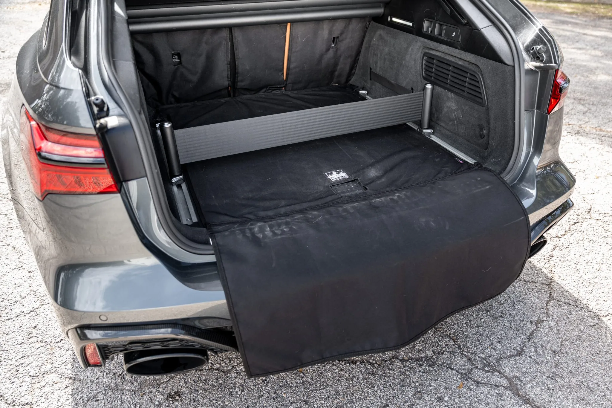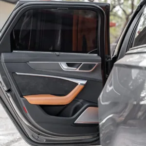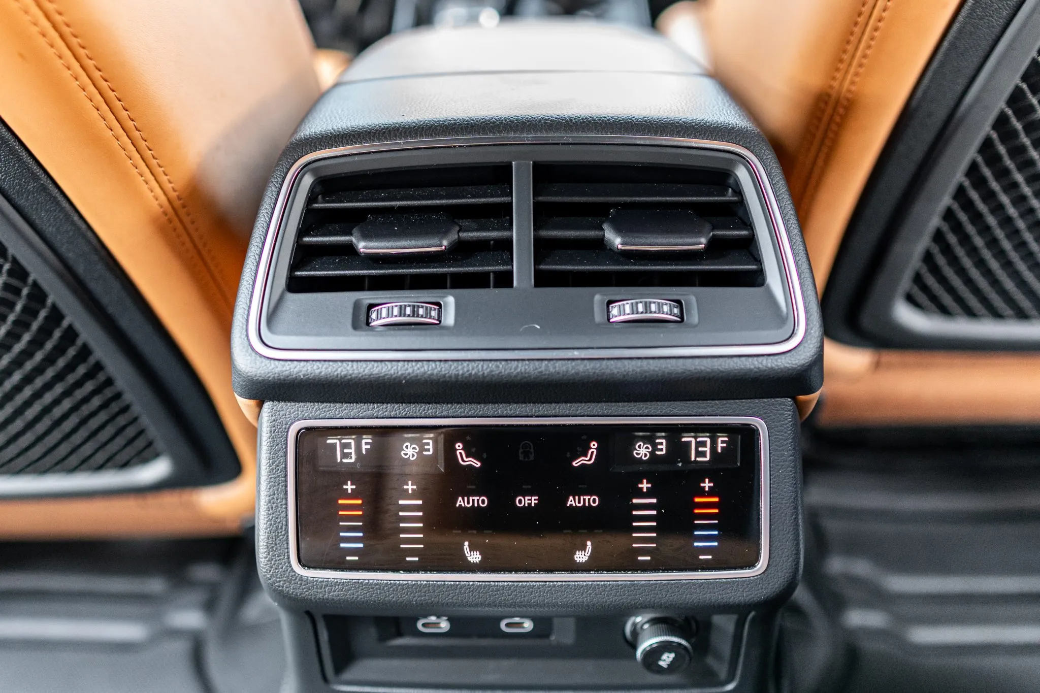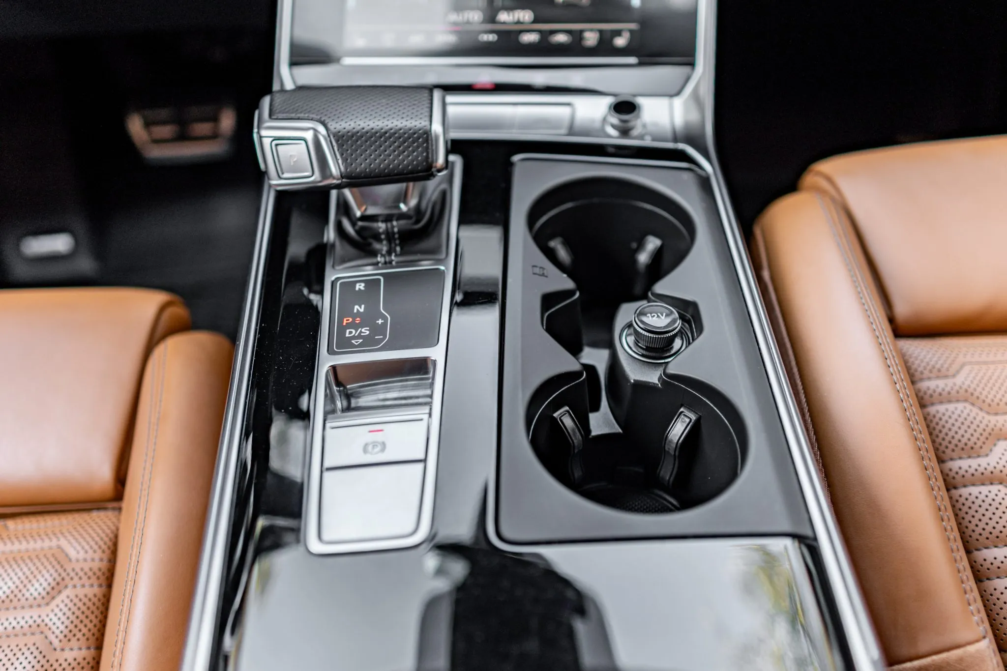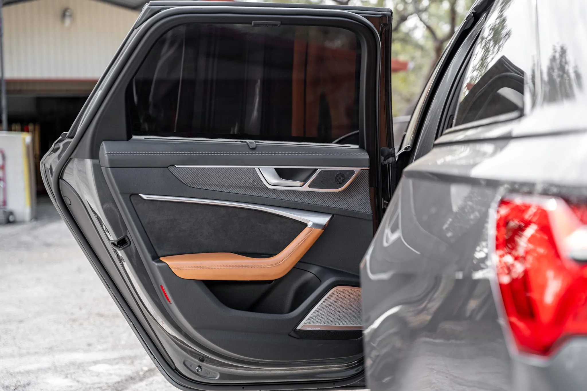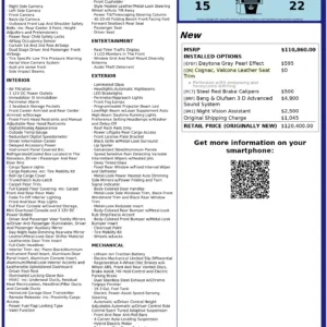 The heated and ventilated power-adjustable front RS sport seats and heated rear bench are upholstered in Cognac leather, while carbon-fiber trim accents the cabin. Debossed RS logos adorn the backrests, and additional appointments include Audi Advanced Key keyless entry, a Bang & Olufsen 3D Advanced sound system, a head-up display, night-vision assist, adaptive cruise control, an Audi Phone Box wireless charger, four-zone automatic climate control, aftermarket floor mats, rear sunshades, and Audi MMI Touch infotainment with Navigation Plus.