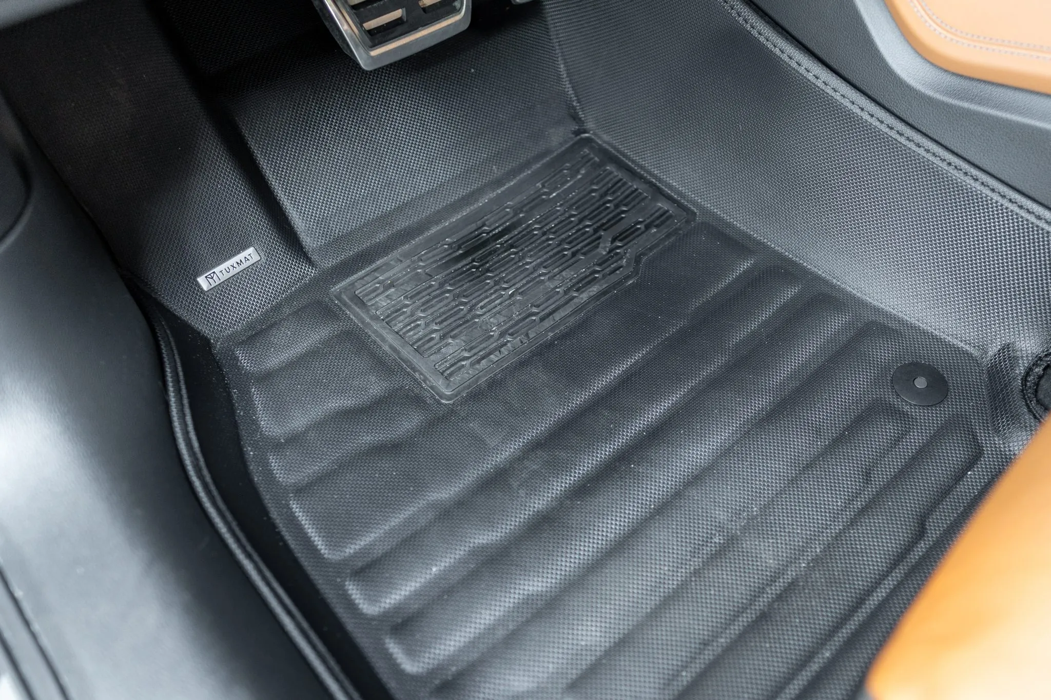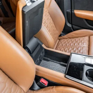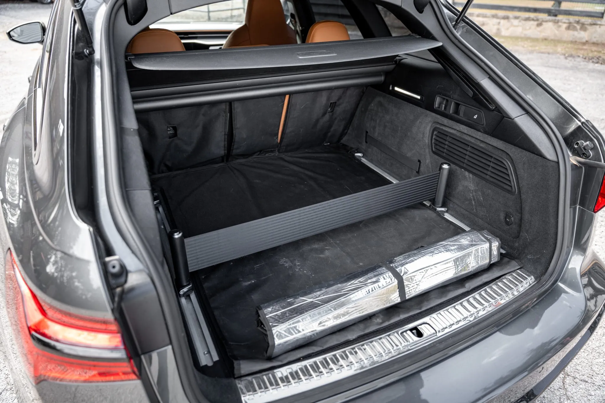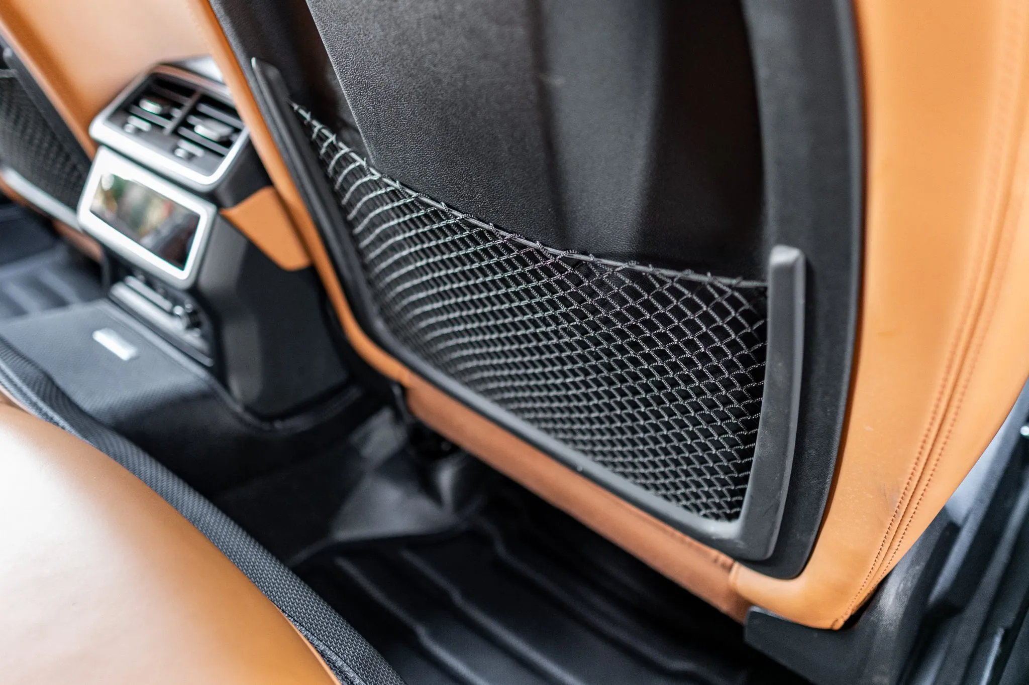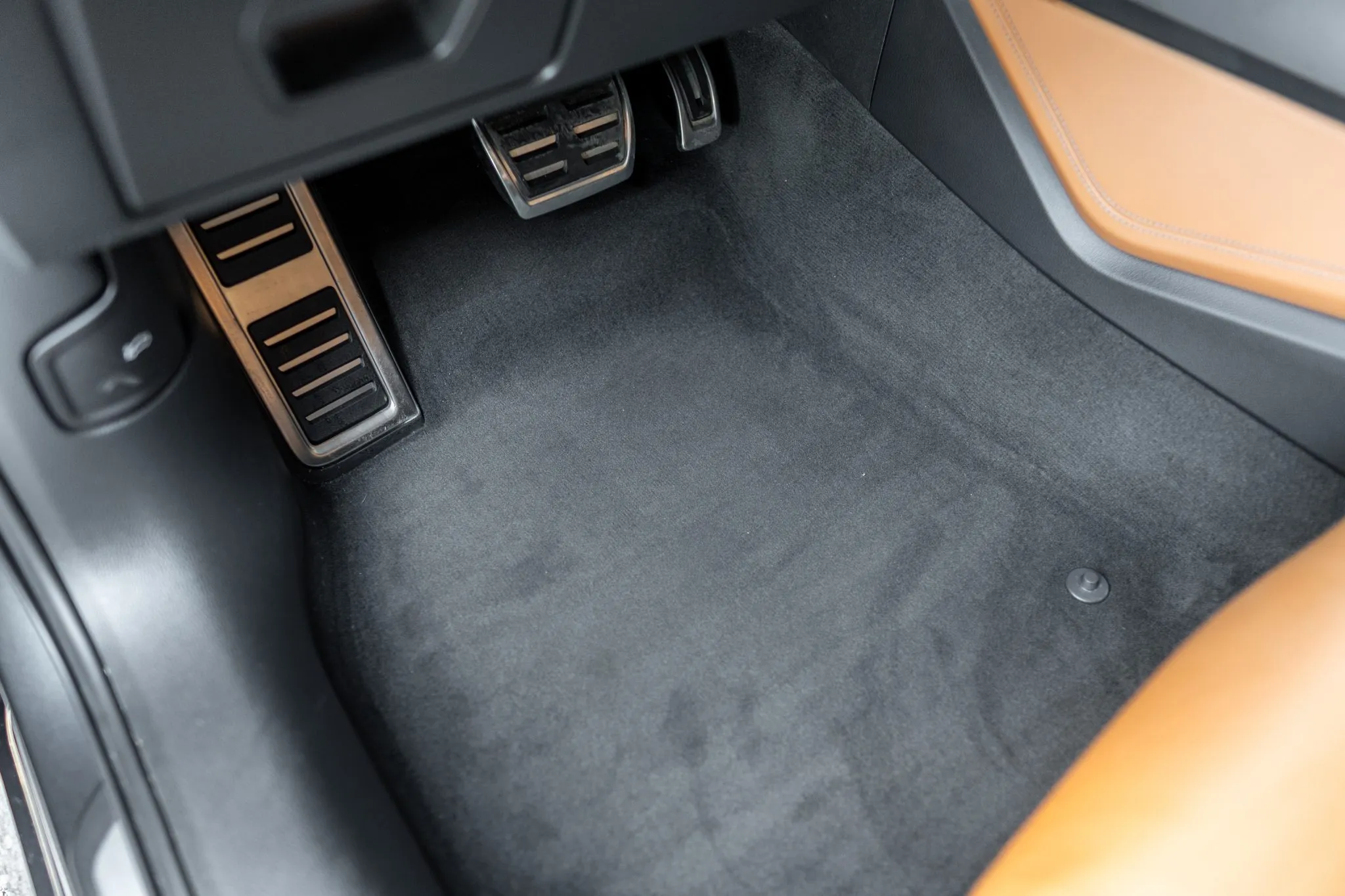 The heated and ventilated power-adjustable front RS sport seats and heated rear bench are upholstered in Cognac leather, while carbon-fiber trim accents the cabin. Debossed RS logos adorn the backrests, and additional appointments include Audi Advanced Key keyless entry, a Bang & Olufsen 3D Advanced sound system, a head-up display, night-vision assist, adaptive cruise control, an Audi Phone Box wireless charger, four-zone automatic climate control, aftermarket floor mats, rear sunshades, and Audi MMI Touch infotainment with Navigation Plus.