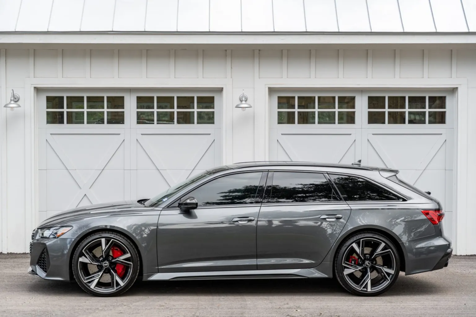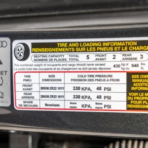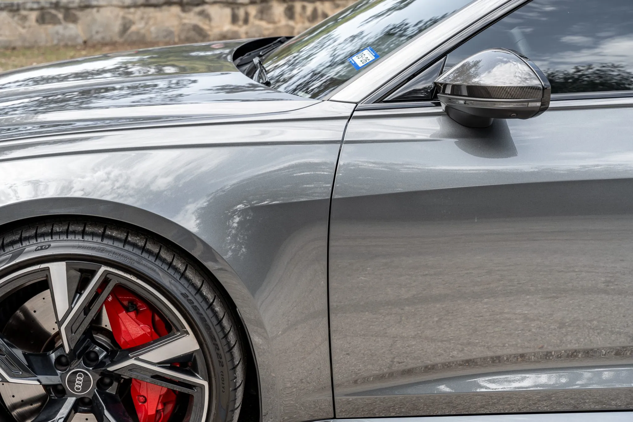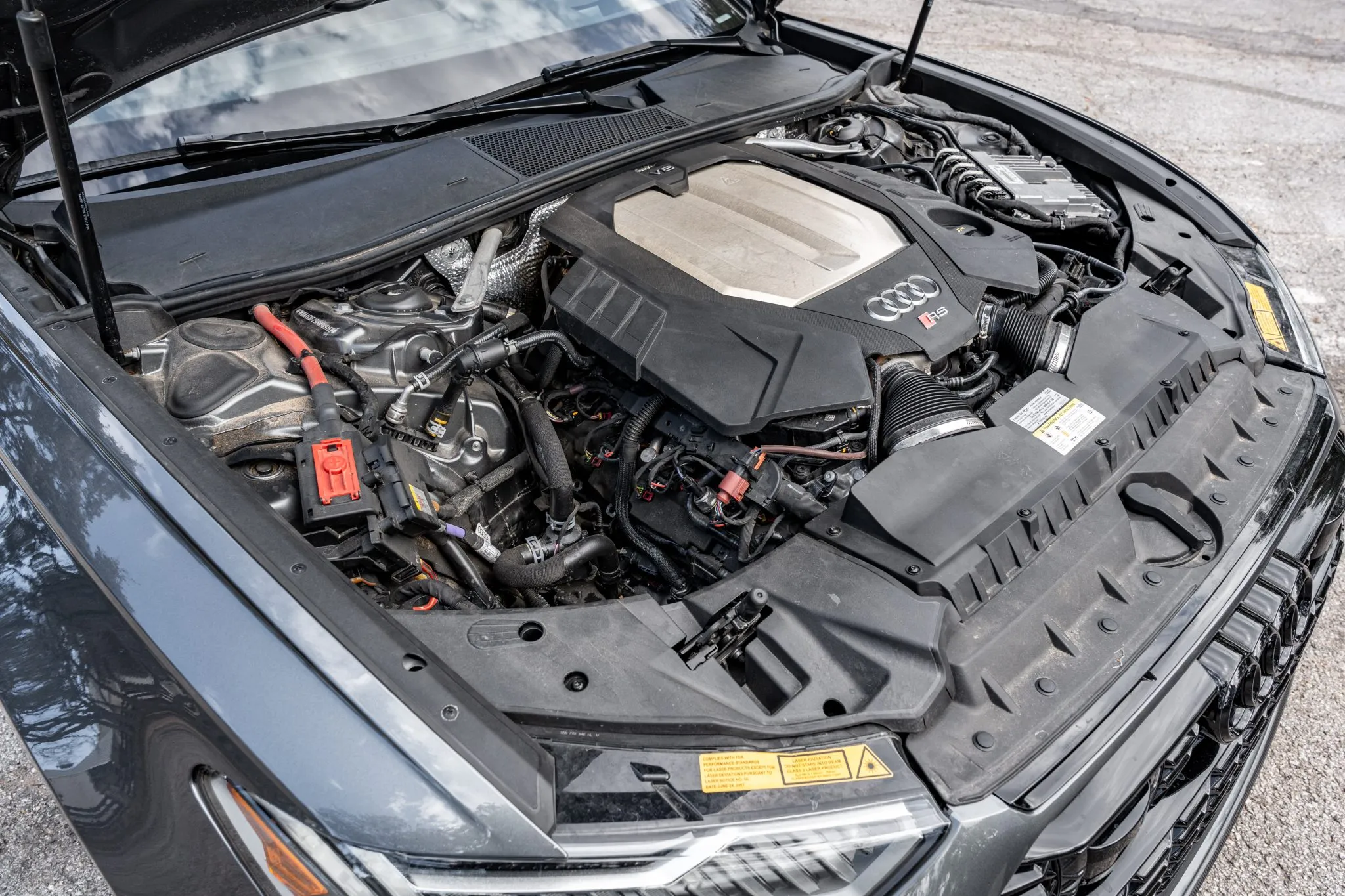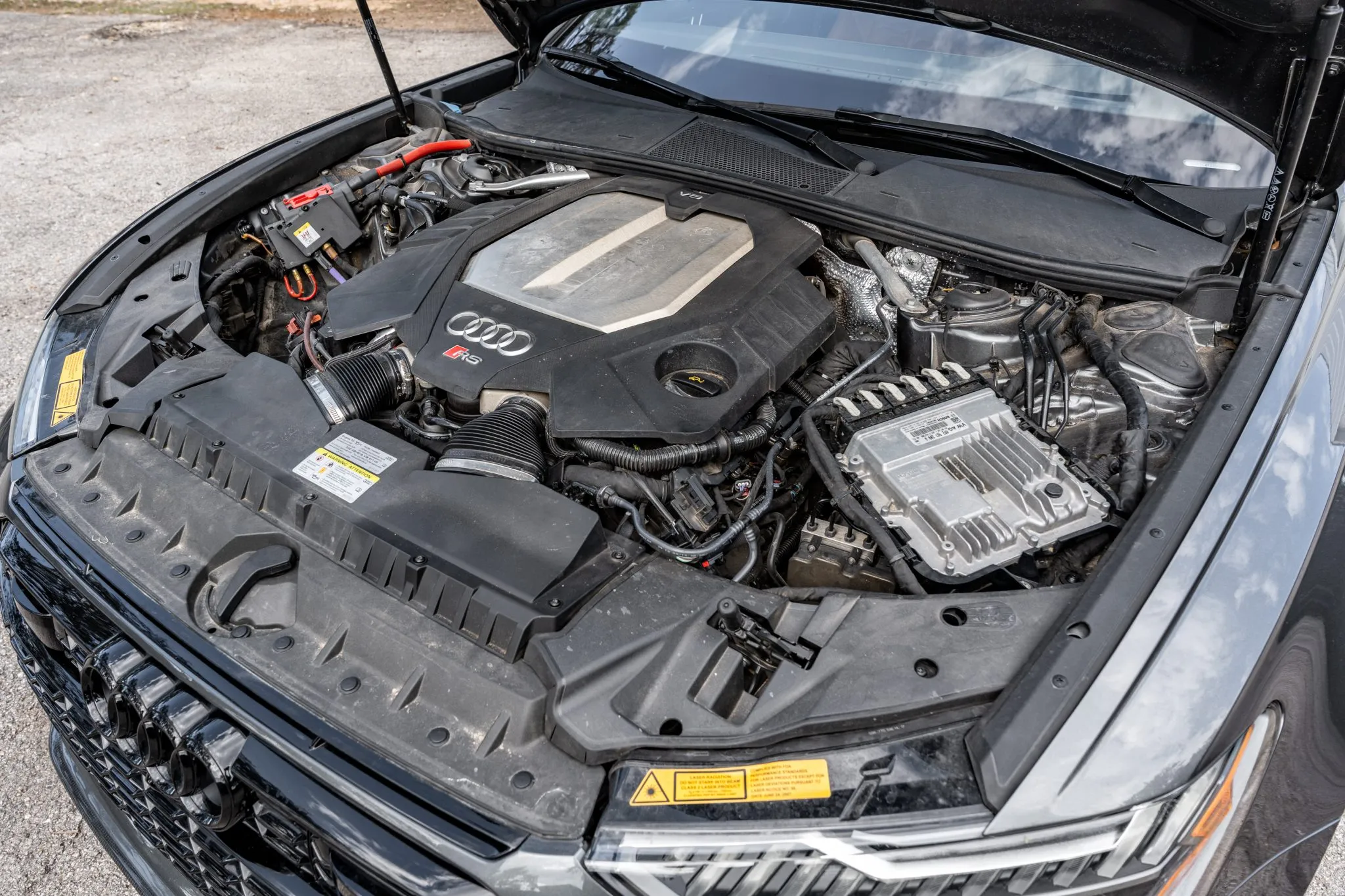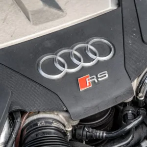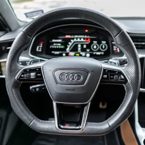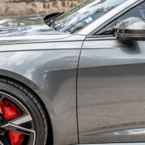 Black and silver 22″ Audi Sport V-spoke alloy wheels are mounted with Pirelli tires, and the left-front wheel has curb damage. The car is equipped with all-wheel steering and an RS-tuned adaptive air suspension. Braking is handled by Steel Red-finished RS-logo calipers mounted over cross-drilled and ventilated rotors that measure 16.5″ up front and 14.6″ out back. A brake fluid flush was performed in May 2025.