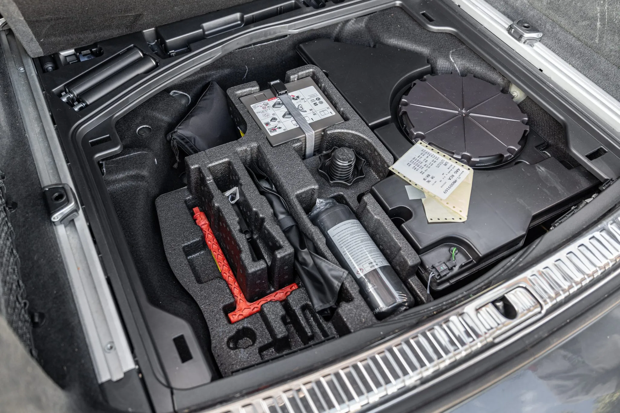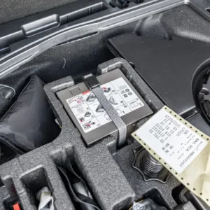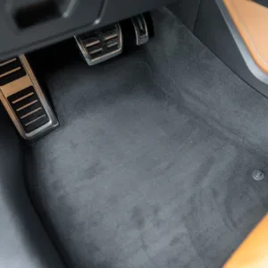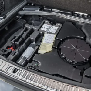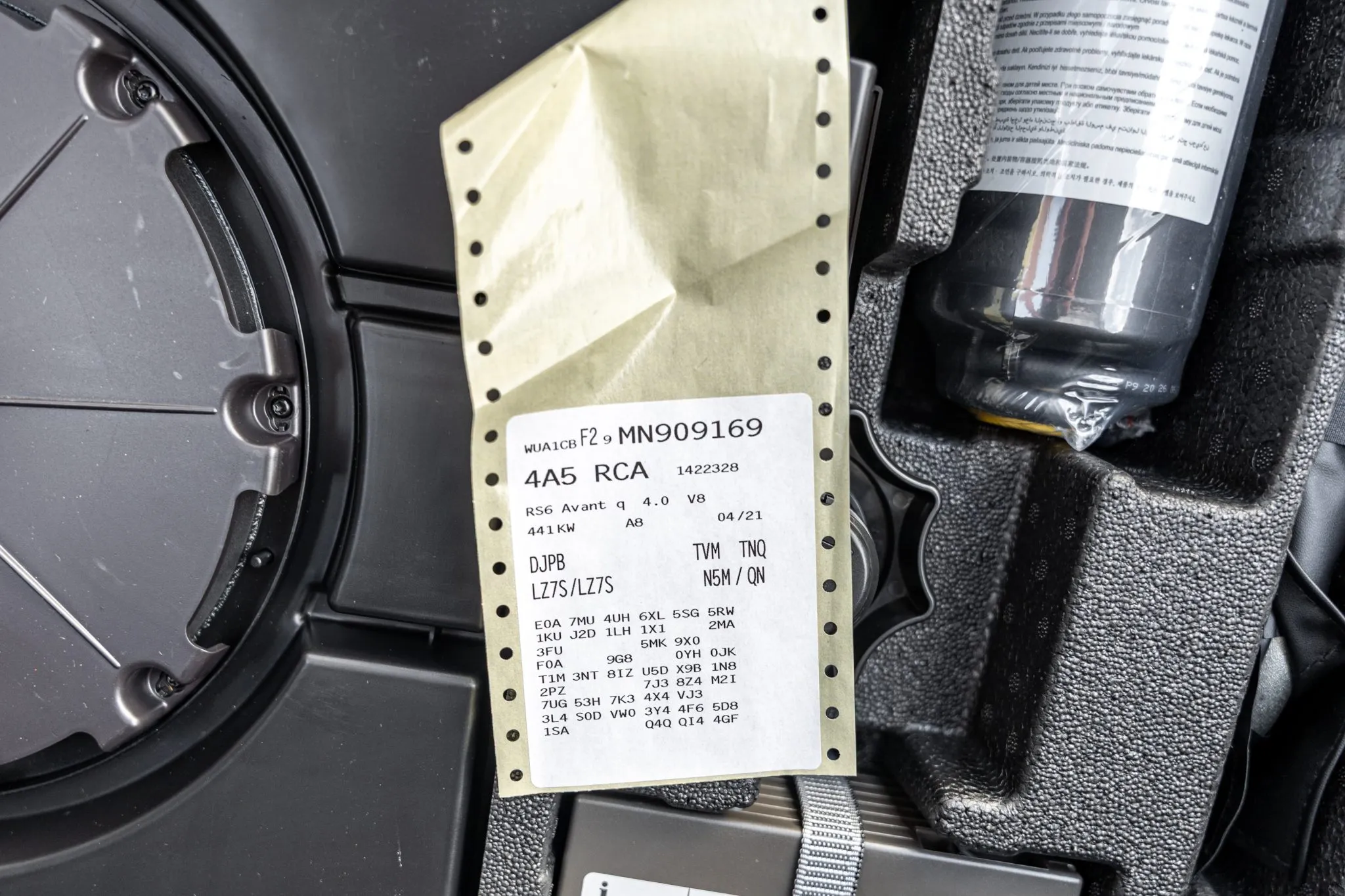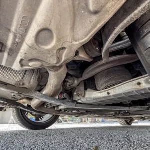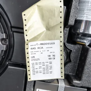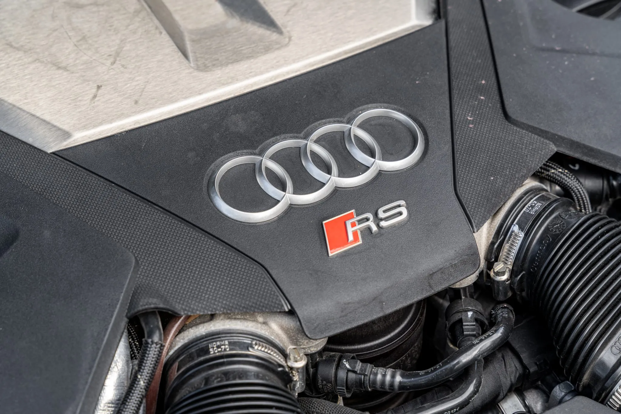 Black and silver 22″ Audi Sport V-spoke alloy wheels are mounted with Pirelli tires, and the left-front wheel has curb damage. The car is equipped with all-wheel steering and an RS-tuned adaptive air suspension. Braking is handled by Steel Red-finished RS-logo calipers mounted over cross-drilled and ventilated rotors that measure 16.5″ up front and 14.6″ out back. A brake fluid flush was performed in May 2025.