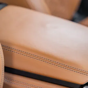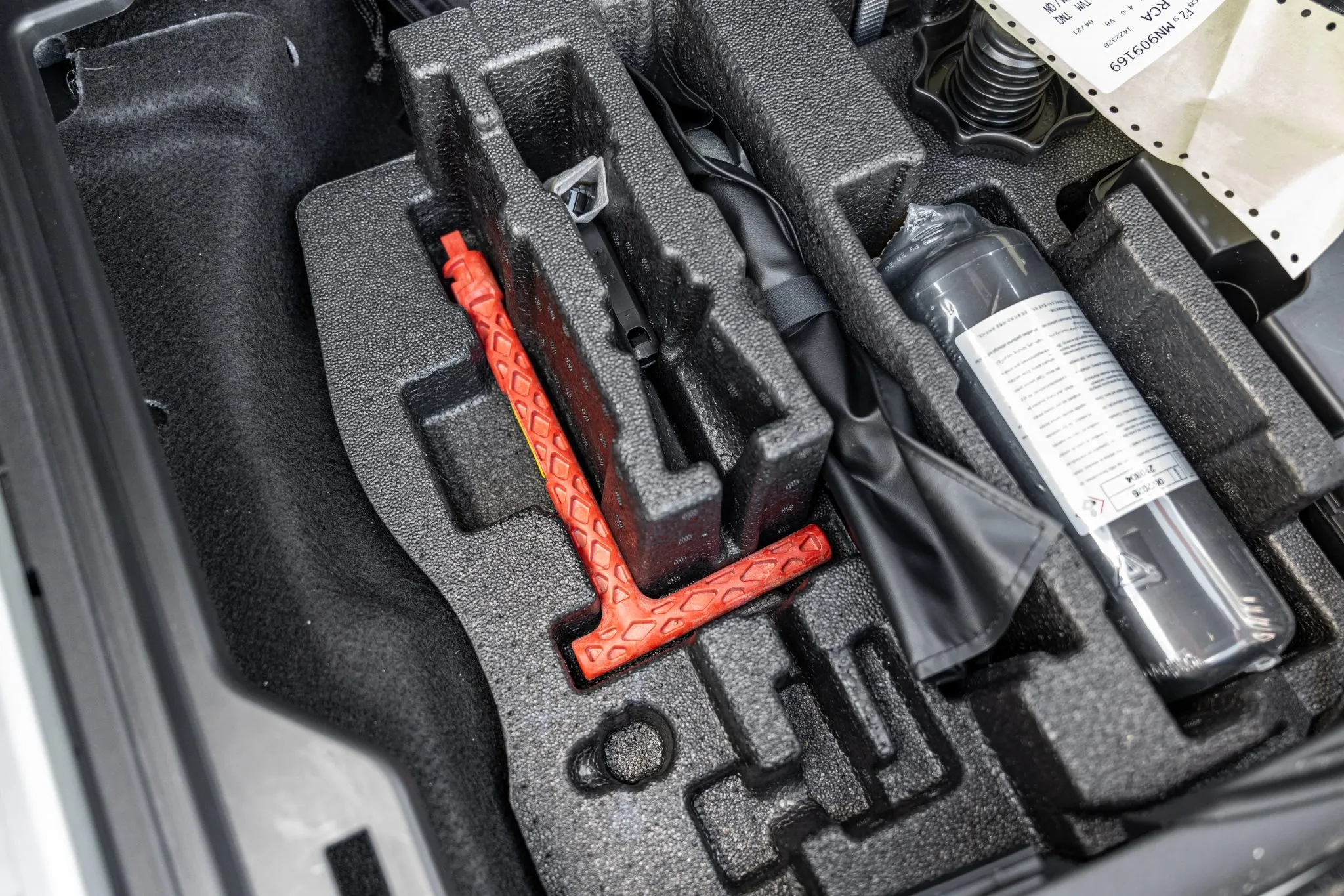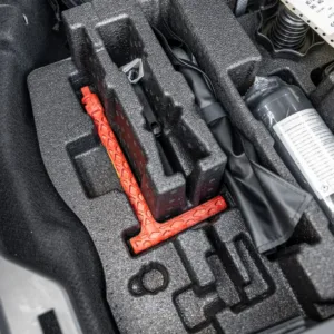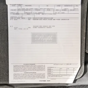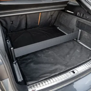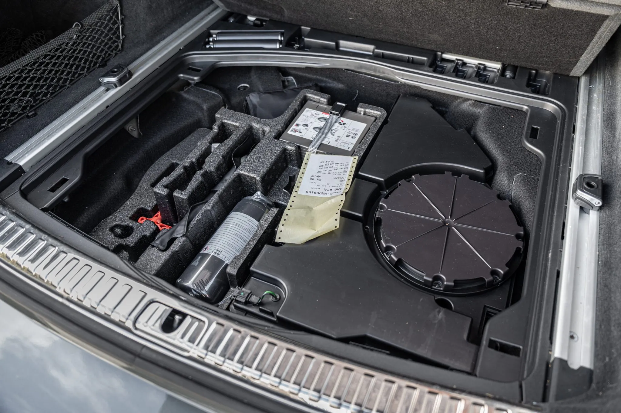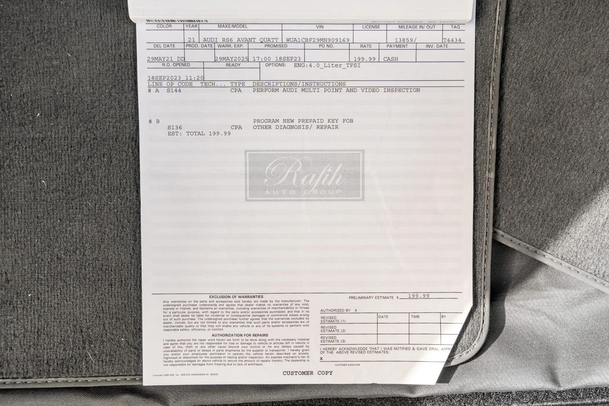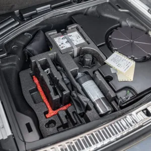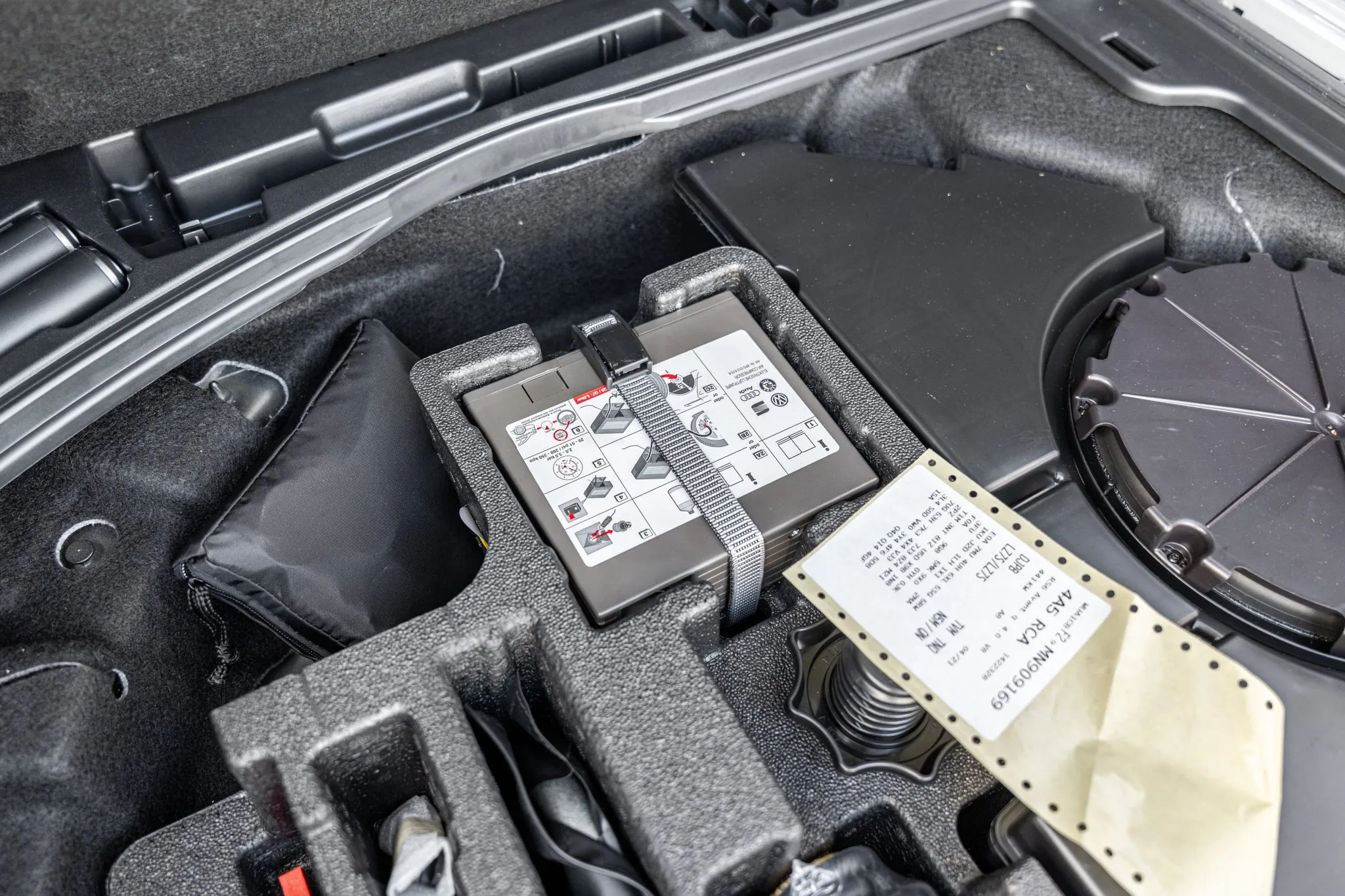 Black and silver 22″ Audi Sport V-spoke alloy wheels are mounted with Pirelli tires, and the left-front wheel has curb damage. The car is equipped with all-wheel steering and an RS-tuned adaptive air suspension. Braking is handled by Steel Red-finished RS-logo calipers mounted over cross-drilled and ventilated rotors that measure 16.5″ up front and 14.6″ out back. A brake fluid flush was performed in May 2025.