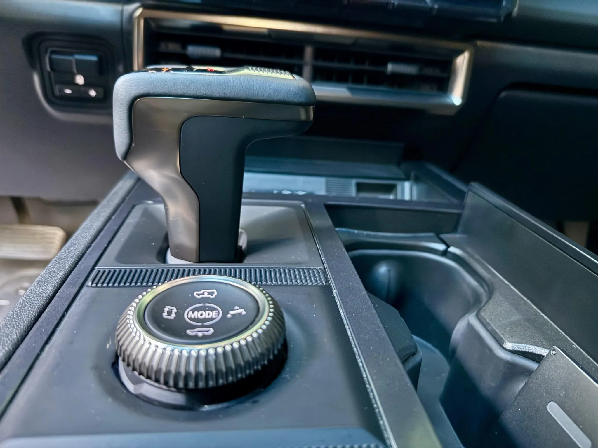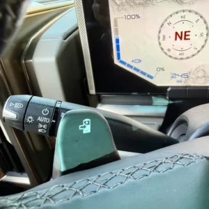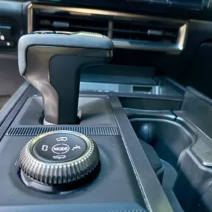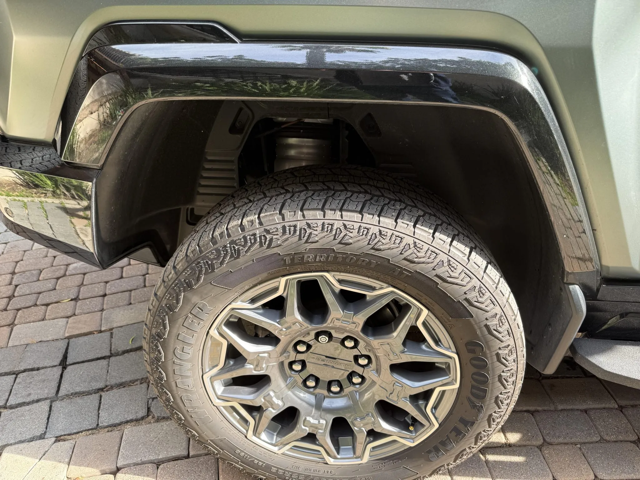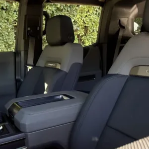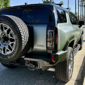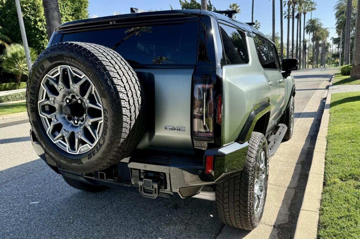 The 22″ eight Y-spoke alloy wheels are mounted with 305/55 Goodyear Wrangler Territory AT tires, and a matching spare is secured to the swing-out tailgate. The CrabWalk four-wheel steering system allows the rear wheels to turn up to 10°, enabling the truck to travel diagonally at low speeds. Additional features include regenerative braking and a four-wheel adaptive air suspension.
