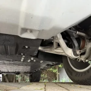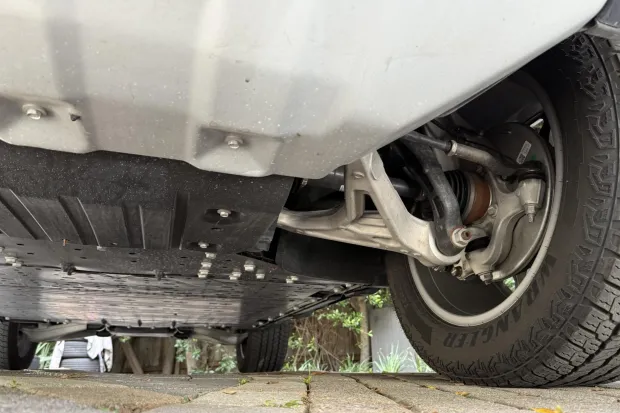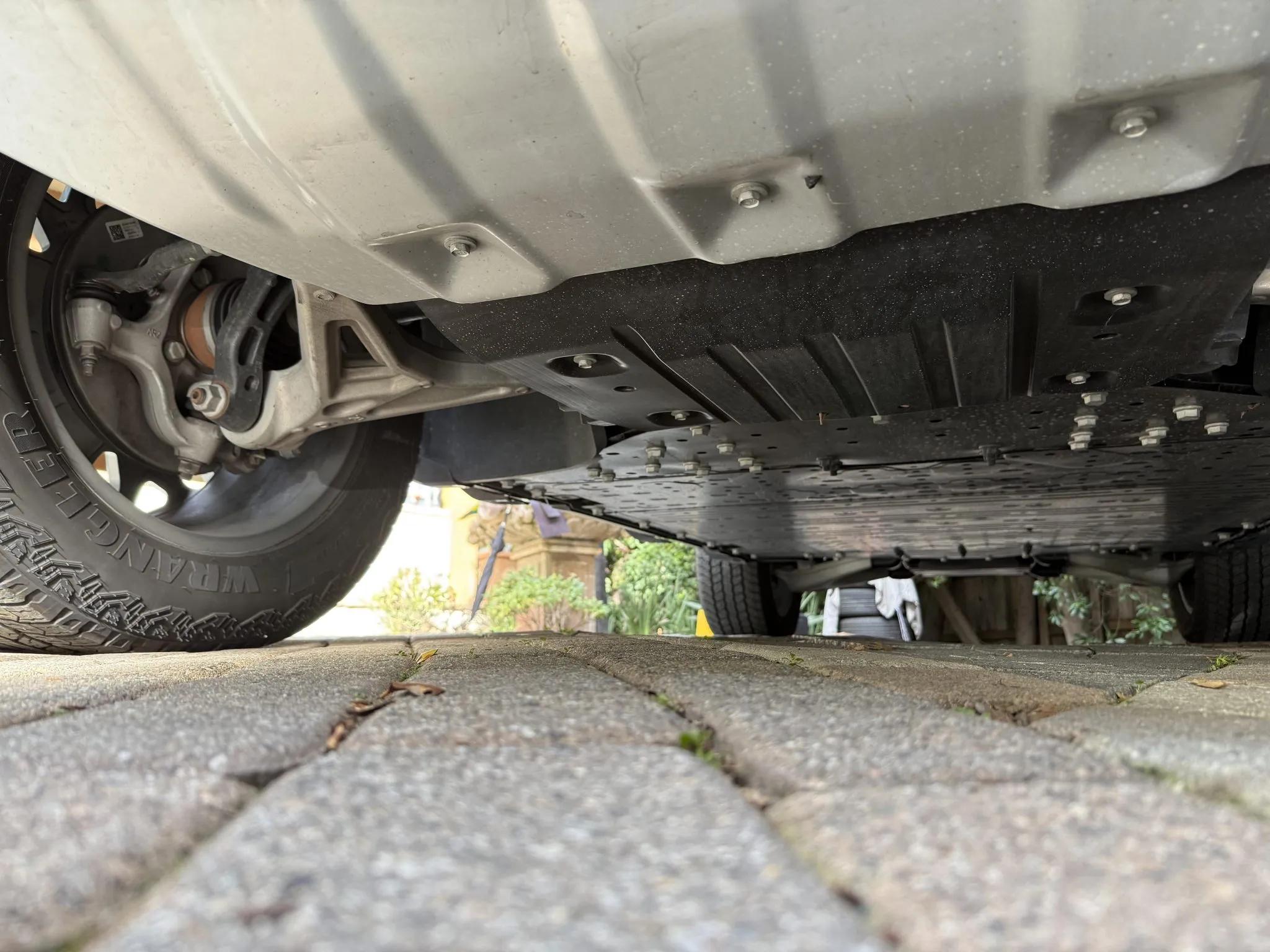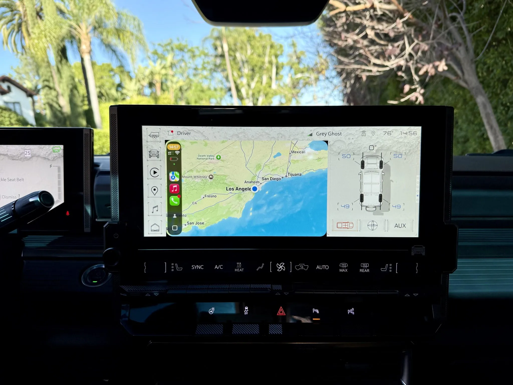The 22″ eight Y-spoke alloy wheels are mounted with 305/55 Goodyear Wrangler Territory AT tires, and a matching spare is secured to the swing-out tailgate. The CrabWalk four-wheel steering system allows the rear wheels to turn up to 10°, enabling the truck to travel diagonally at low speeds. Additional features include regenerative braking and a four-wheel adaptive air suspension.
