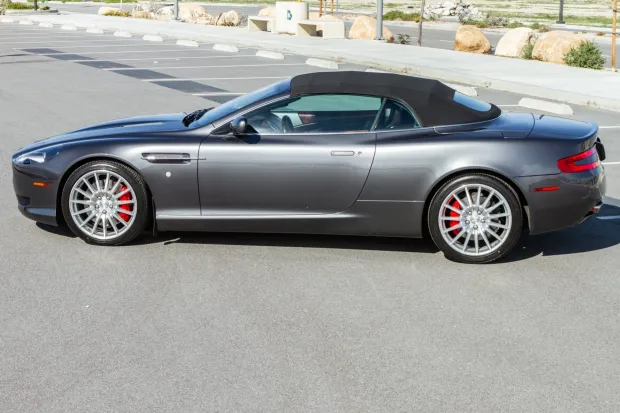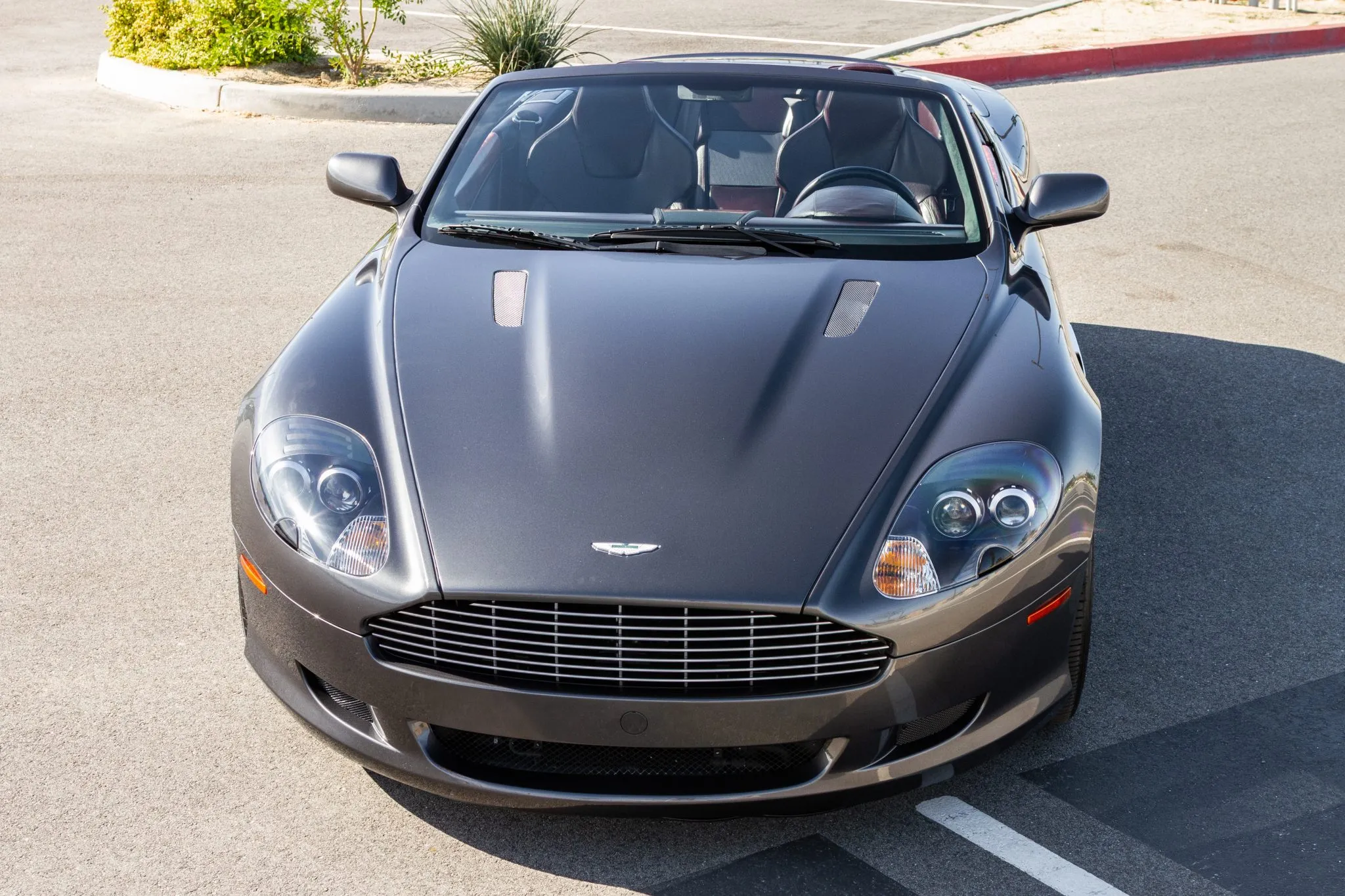 The DB9 featured a mix of aluminum and composite body panels installed over an extruded aluminum spaceframe. This example is finished in Meteorite Silver and features a power-operated black soft top, a Tungsten grille, hood vents, fender vents, rear parking sensors, LED taillights, and dual exhaust outlets.