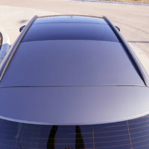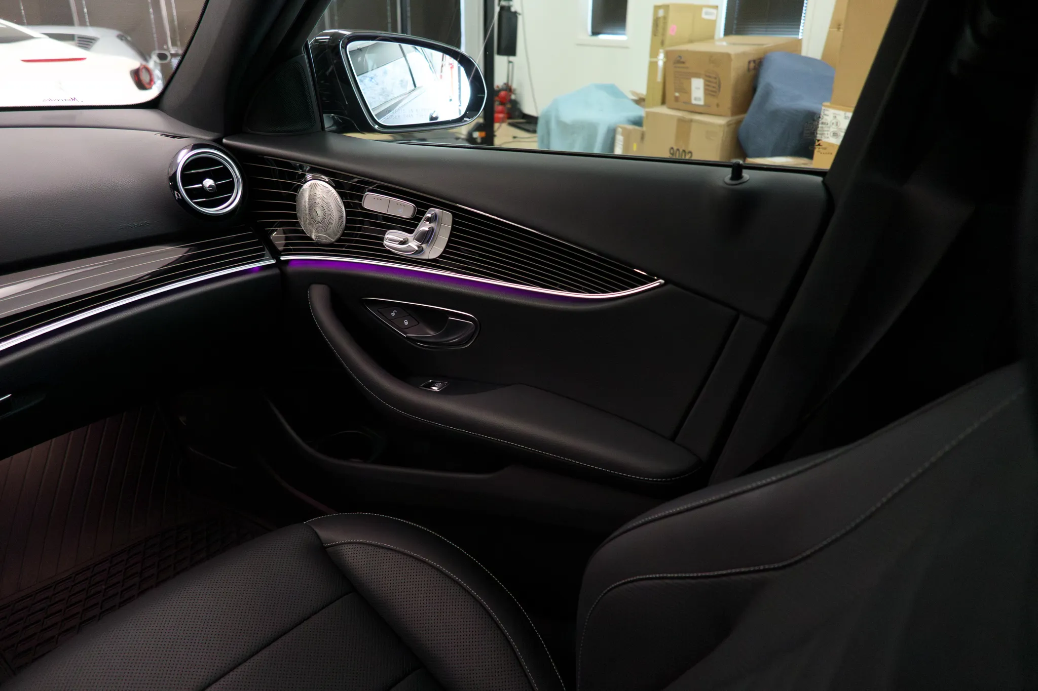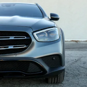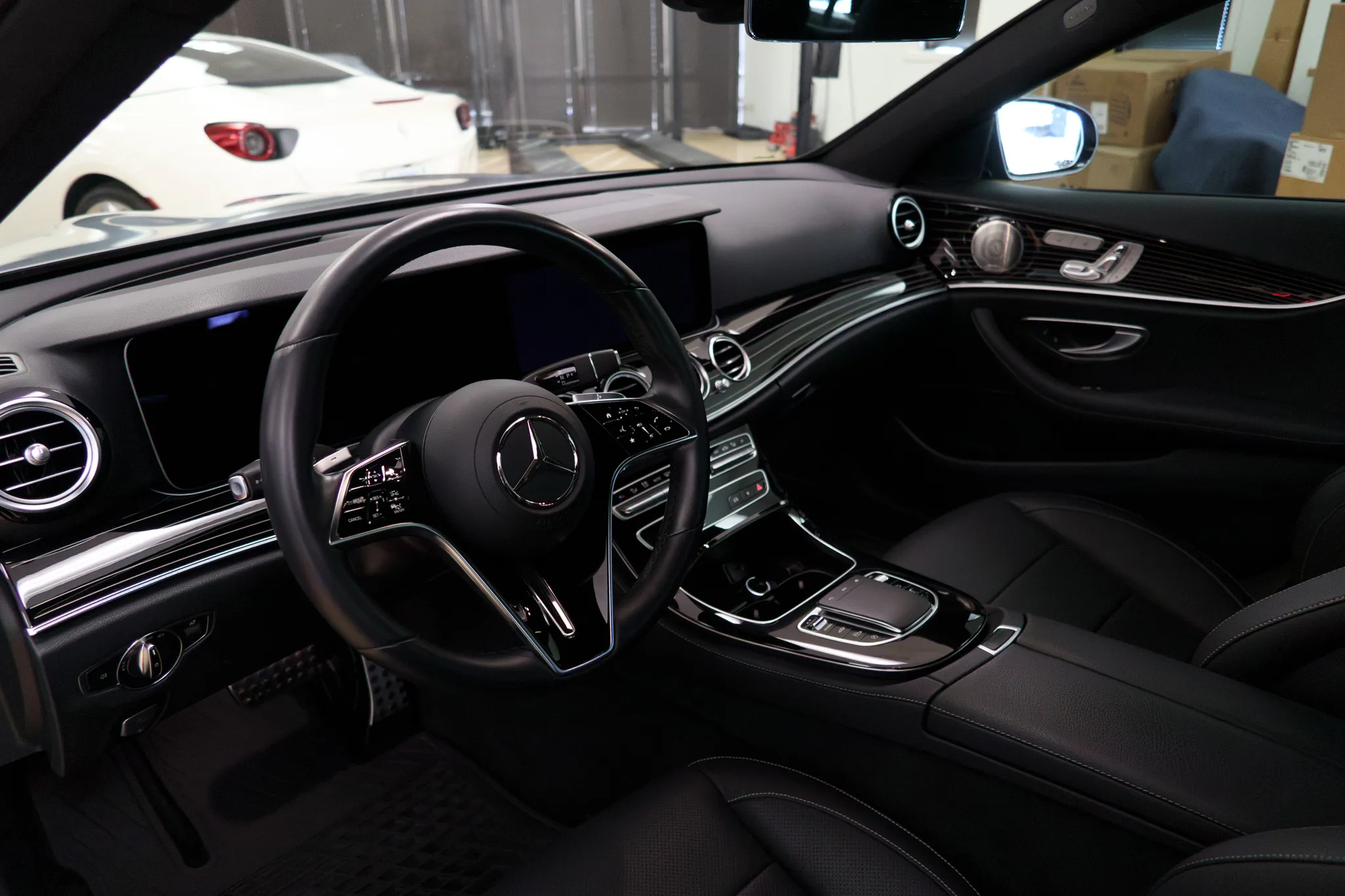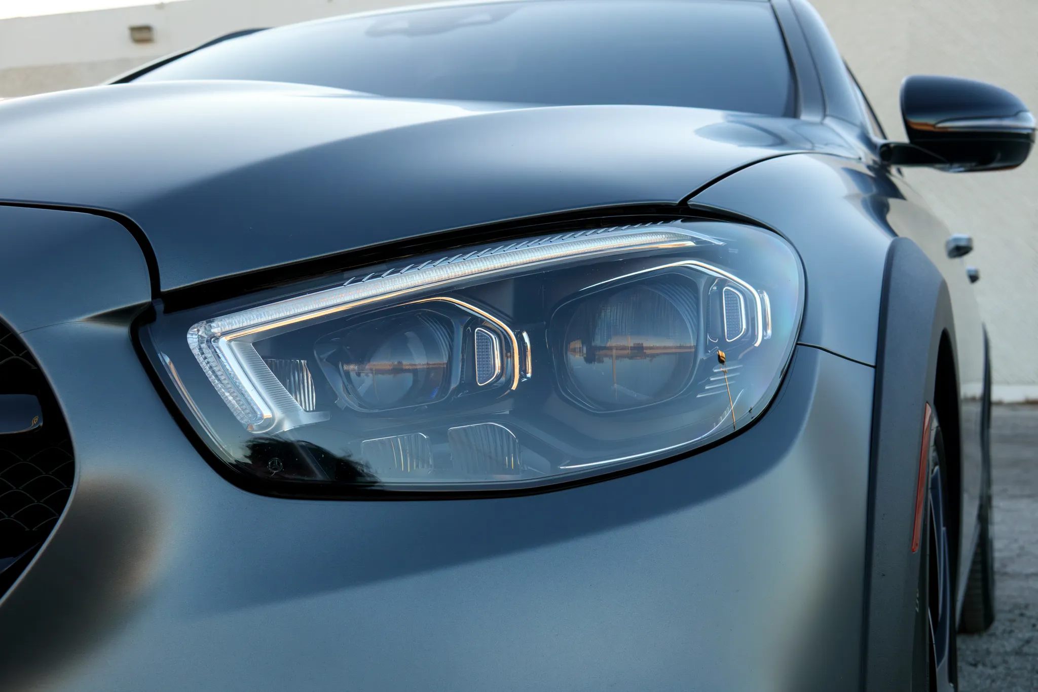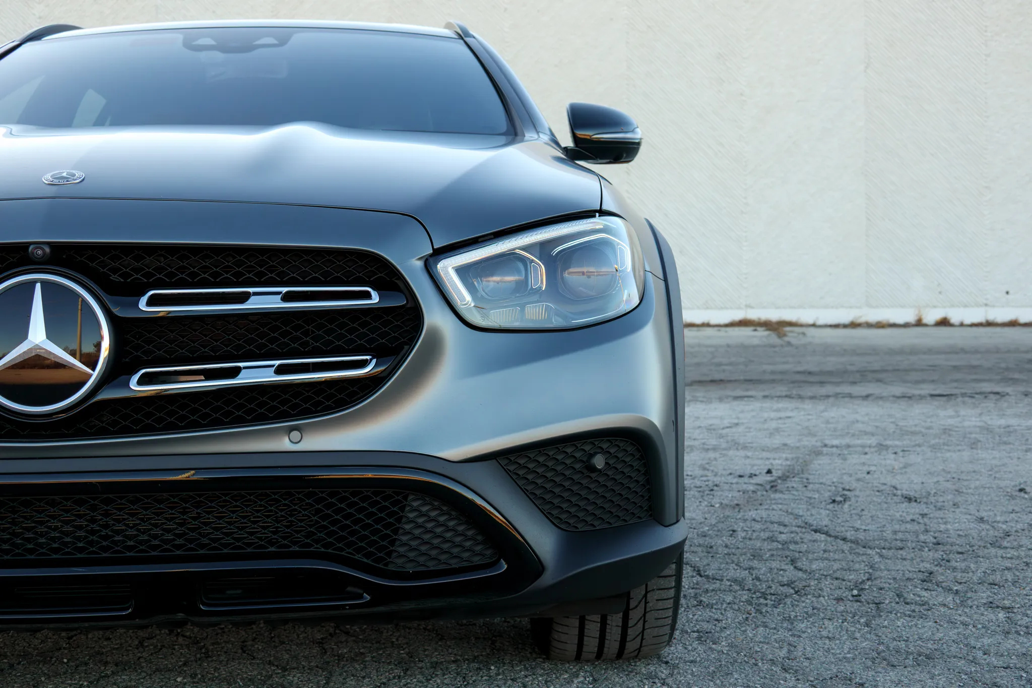 The car is finished in Designo Selenite Gray Magno (297) with high-gloss black accents on the grille, bumper covers, mirror caps, roof rails, and window trim as part of the Night Package. Further exterior appointments include a panoramic sunroof, the LED Intelligent Light System, Adaptive Highbeam Assist, Parktronic parking sensors, soft-close doors, LED logo projectors, noise-reducing laminated windshield and front-door glass, and window tint. The All-Terrain wagon featured extra lower cladding compared to standard S213 wagons. Paint-protection film has been applied to the front bumper cover.
