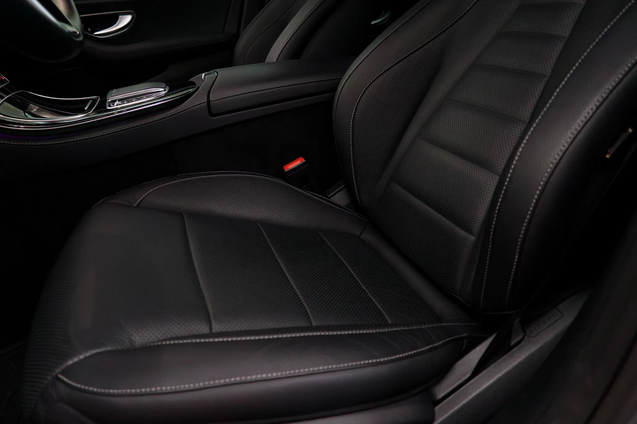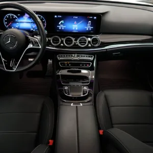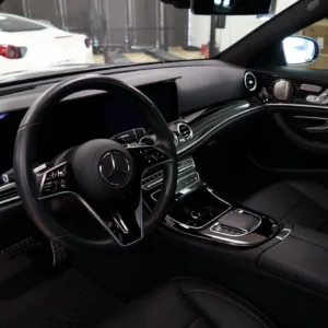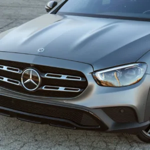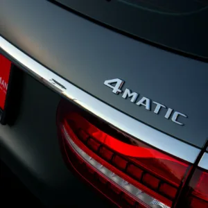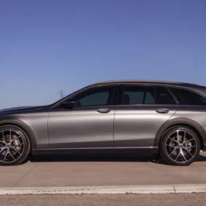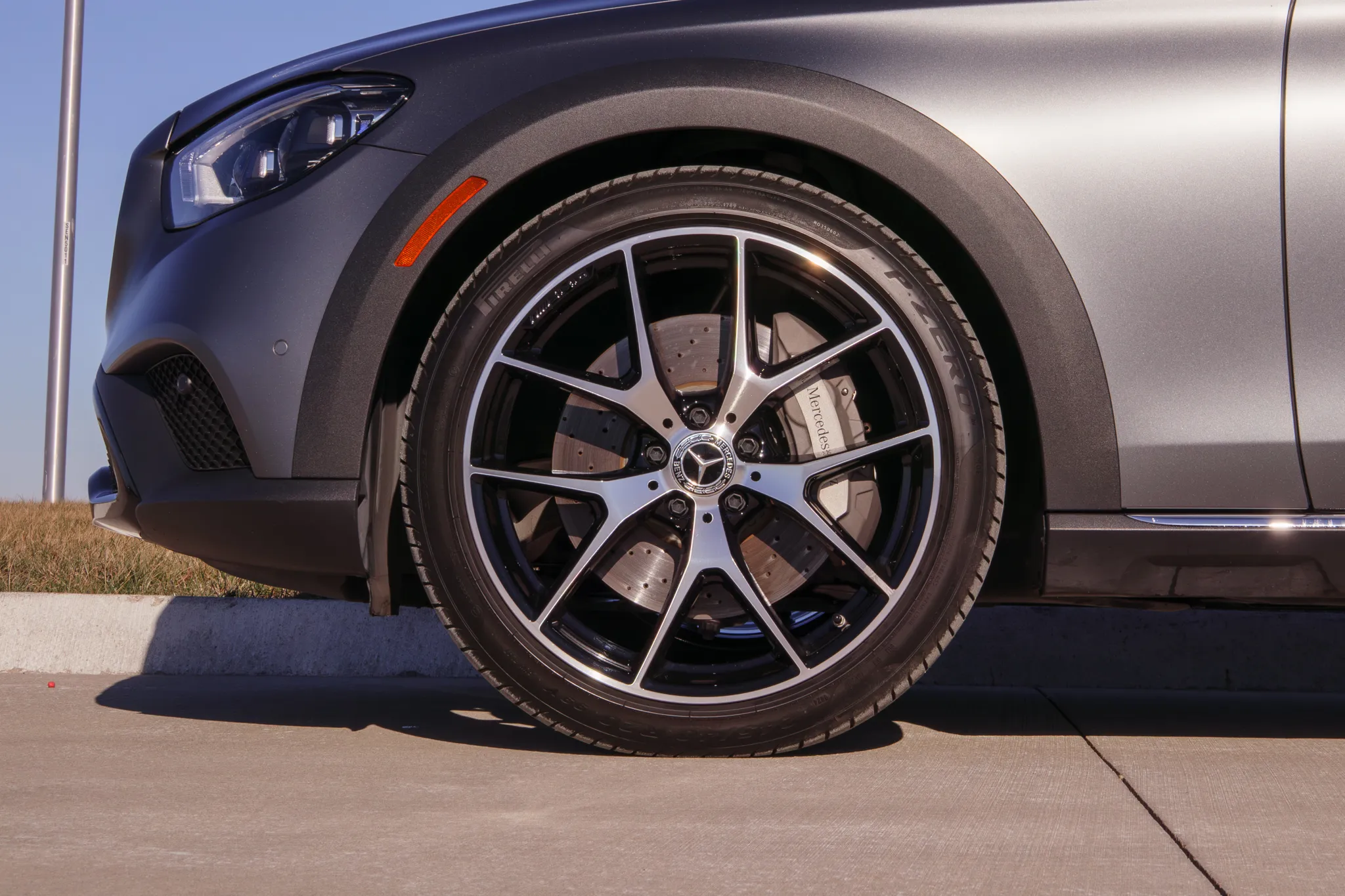 The 20″ AMG twin five-spoke wheels have black accents and are mounted with 245/40 front and 275/35 rear Pirelli P Zero tires. The car features a comfort-tuned suspension that includes a self-leveling air suspension system at the rear, with the All-Terrain wagon featuring an increased ride height compared to other S213 wagons. Stopping power is provided by four-wheel disc brakes with Mercedes-branded calipers over cross-drilled rotors up front.