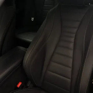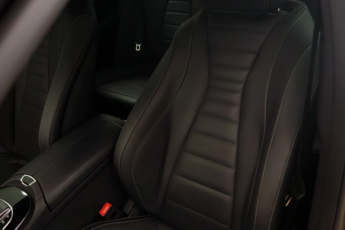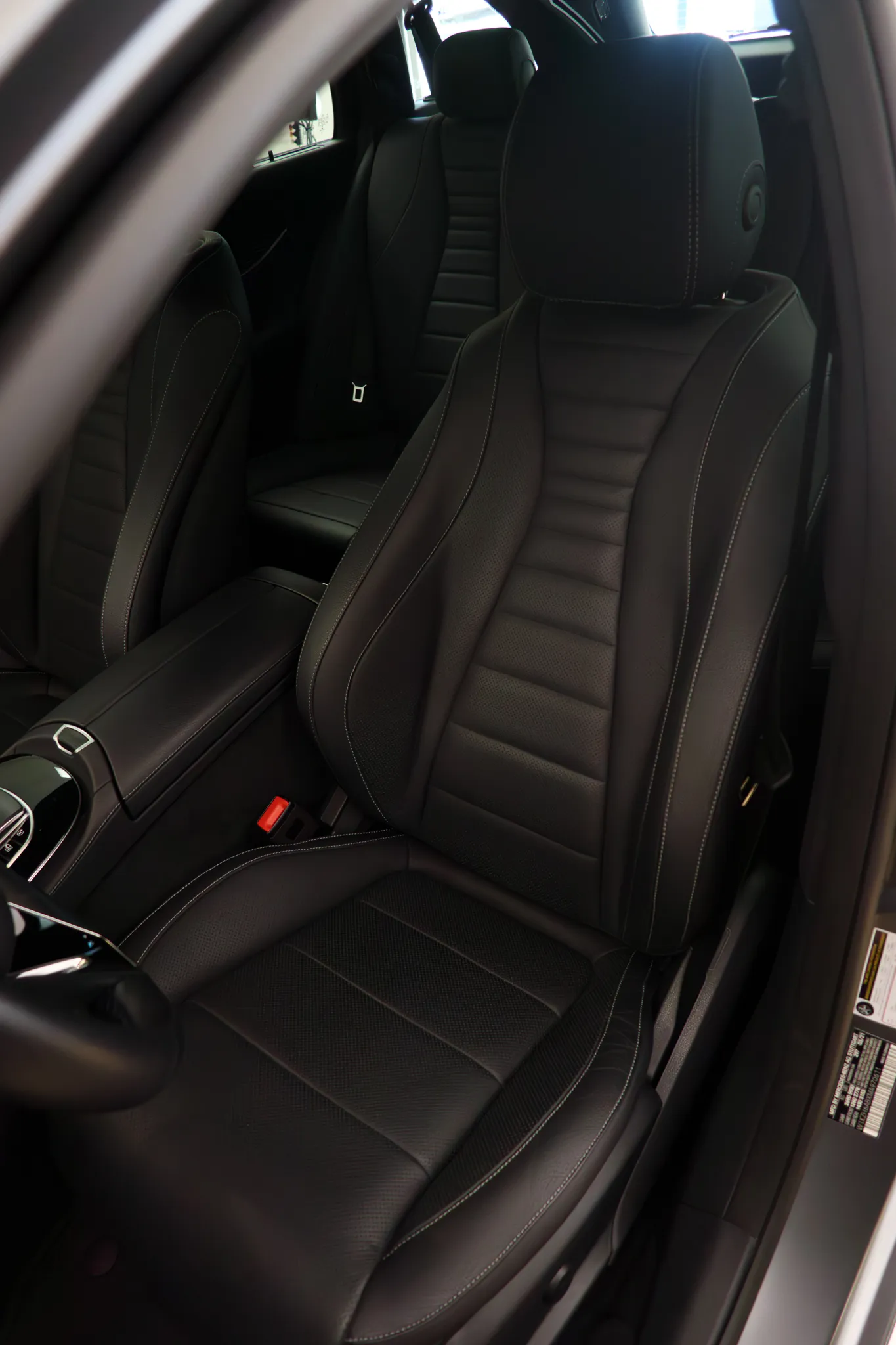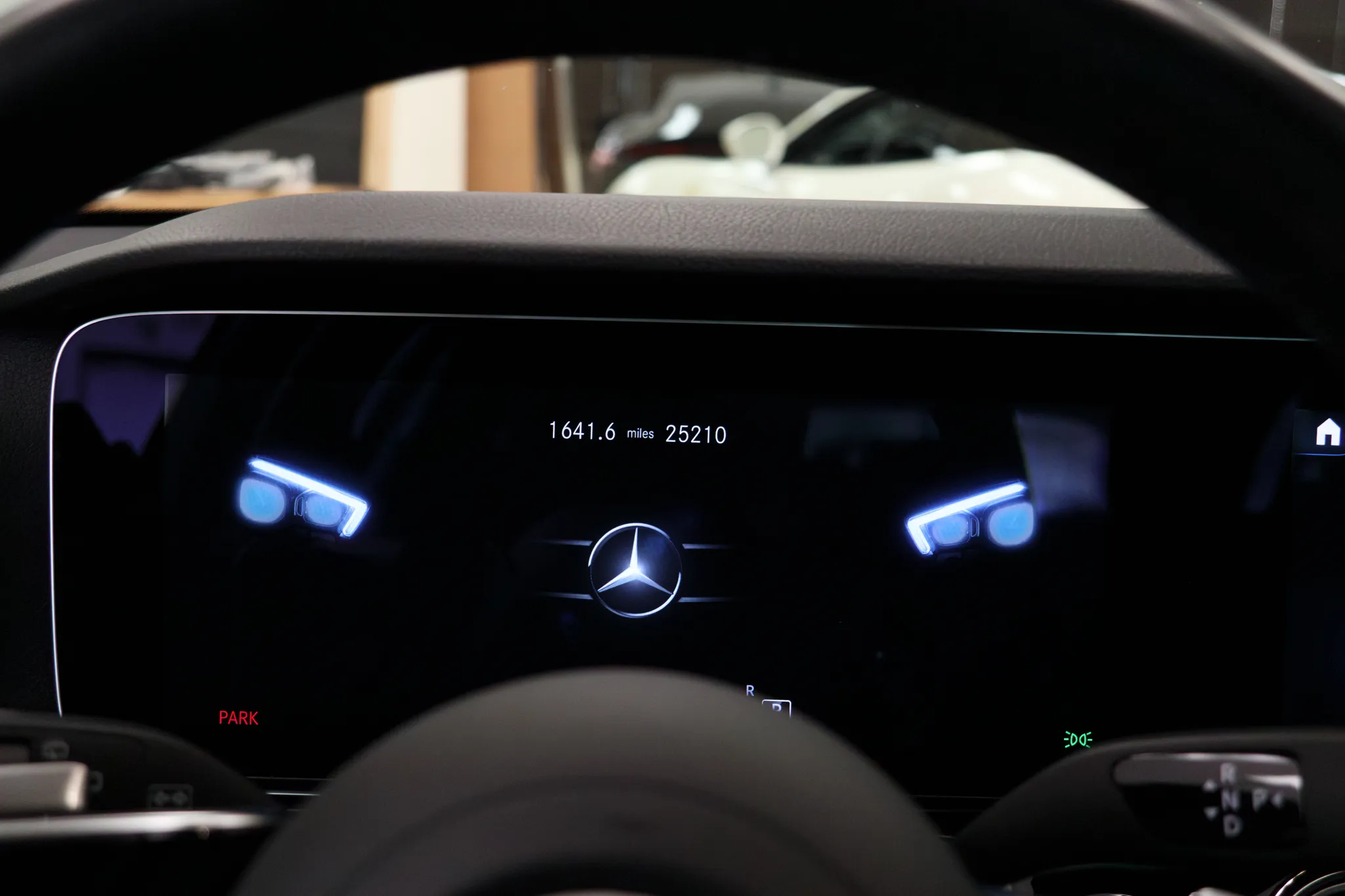The heated leather-trimmed steering wheel is equipped with paddle shifters and frames a 12.3″ configurable digital instrument display. The Driver Assistance Package added Active Distance Assist Distronic, Active Steering Assist, Active Lane Change Assist, Active Emergency Stop Assist, Active Speed Limit Assist, Active Brake Assist, Evasive Steering Assist, Active Lane Keeping Assist, Active Blind Spot Assist, and Pre-Safe Plus. The driver is further aided by a surround-view camera system and Active Parking Assist as part of the Premium Package along with an optional head-up display. The digital odometer indicates 25k miles.