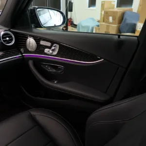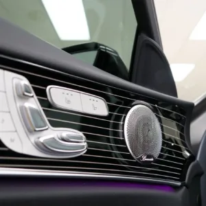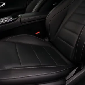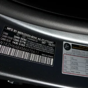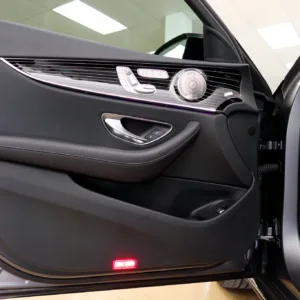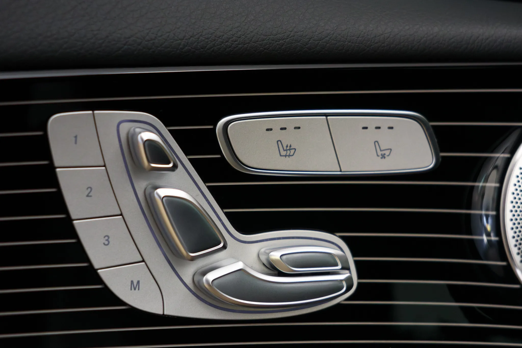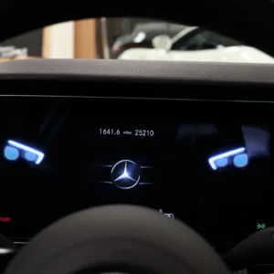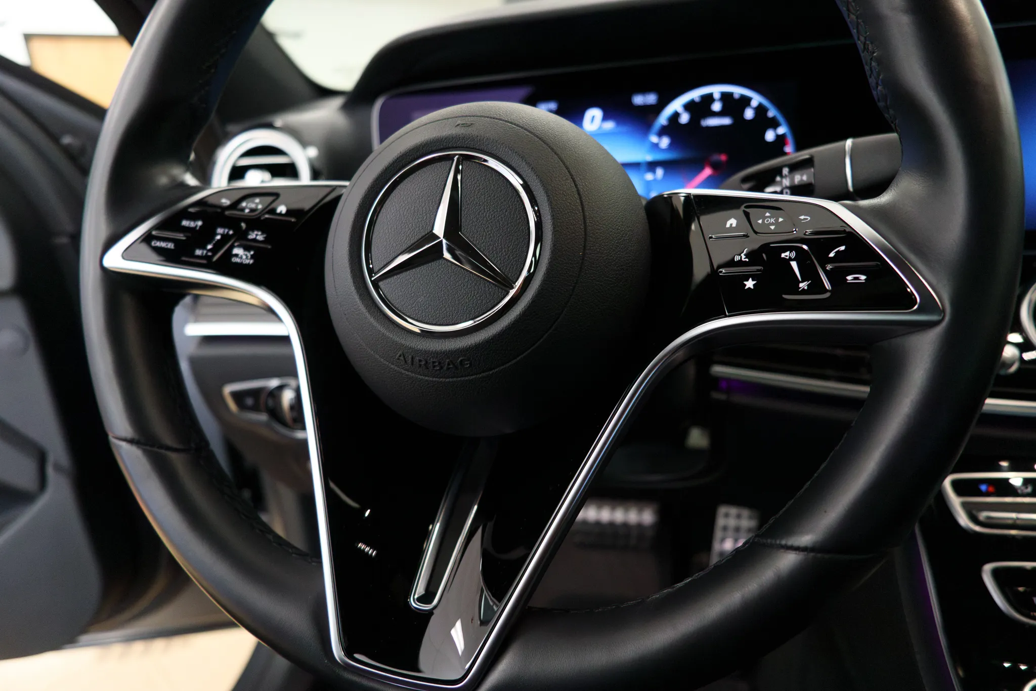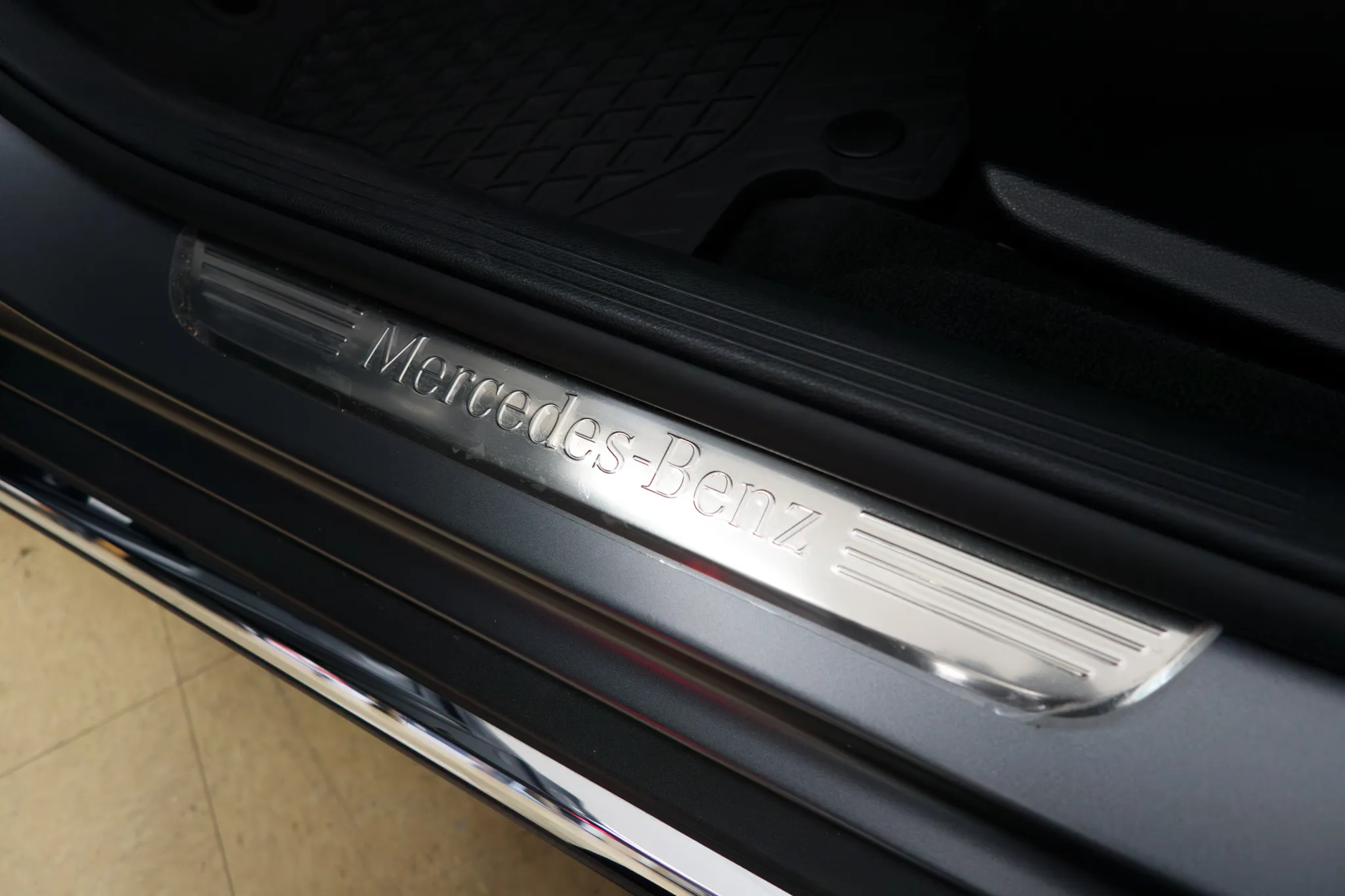 The heated leather-trimmed steering wheel is equipped with paddle shifters and frames a 12.3″ configurable digital instrument display. The Driver Assistance Package added Active Distance Assist Distronic, Active Steering Assist, Active Lane Change Assist, Active Emergency Stop Assist, Active Speed Limit Assist, Active Brake Assist, Evasive Steering Assist, Active Lane Keeping Assist, Active Blind Spot Assist, and Pre-Safe Plus. The driver is further aided by a surround-view camera system and Active Parking Assist as part of the Premium Package along with an optional head-up display. The digital odometer indicates 25k miles.