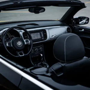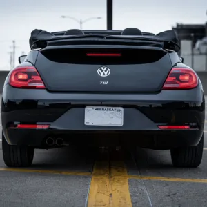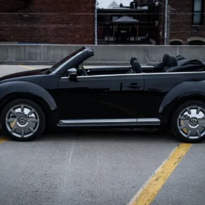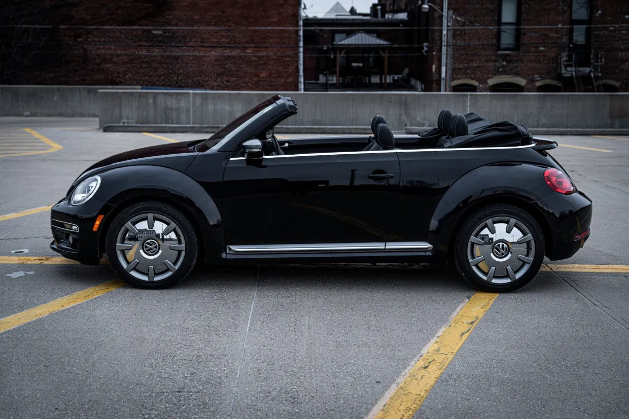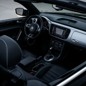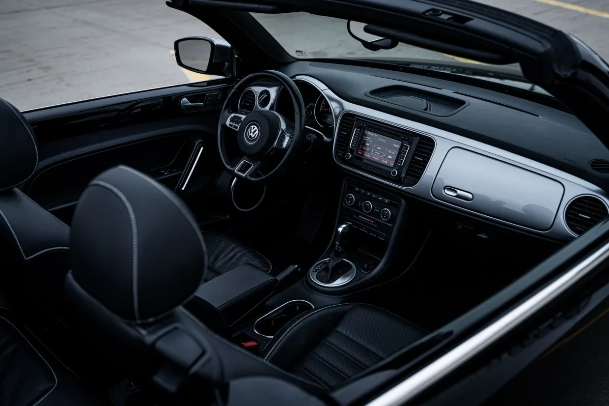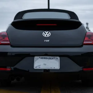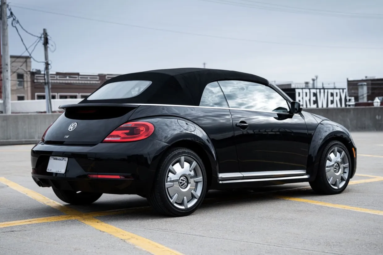 This 2014 Volkswagen Beetle TDI convertible has 42k miles, and it is powered by a 2.0-liter turbodiesel inline-four paired with a six-speed DSG dual-clutch automatic transaxle. The Black-finished bodywork has a power-operated black soft top, a rear spoiler, and xenon headlights, while the black leather-trimmed cabin contains heated front seats, a Käferfach glovebox, a Premium VIII touchscreen infotainment system, navigation, a Fender sound system, and automatic climate control. The car also has 18″ Disc alloy wheels, Electronic Differential Lock, and Intelligent Crash Response System. Purchased in 2023 by the seller, this A5 Beetle convertible is now offered with a clean Carfax report and a clean Nebraska.