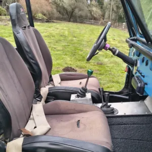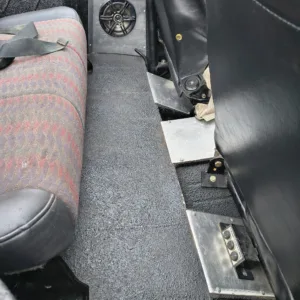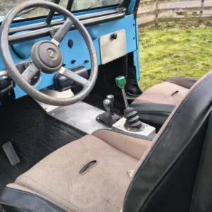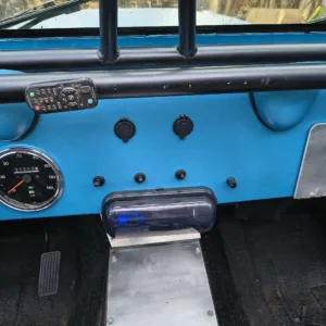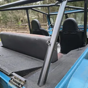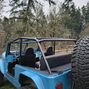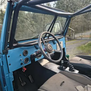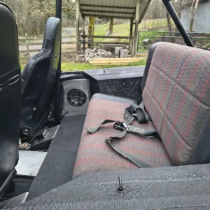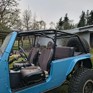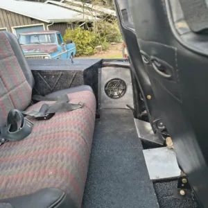 The cabin is equipped with Smittybilt XRC front suspension seats, a fold-and-tumble rear bench, a roll bar, and an aftermarket stereo. The carpets have been removed, and the floors have been coated with bedliner material.