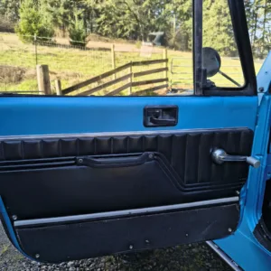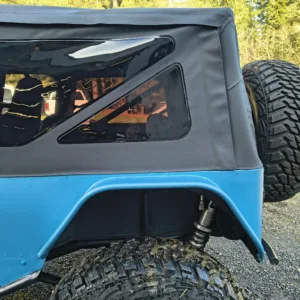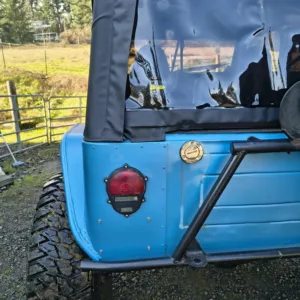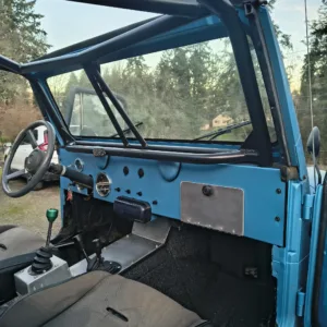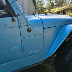 The seller notes the body was stretched and reworked under current ownership, at which time the tailgate was removed and high-clearance fenders were installed. The truck is finished in matte blue, and equipment includes a black Bestop soft top, full metal doors, a Warn winch, and rock sliders. The window felts are worn. The Carfax report lists an accident with “minor damage” in September 2009 as well as an additional accident with no further information provided in December 2012.