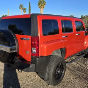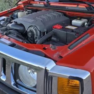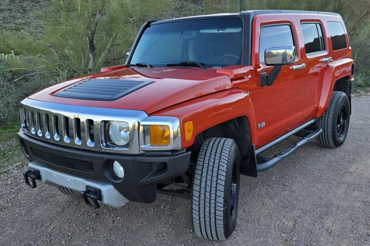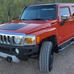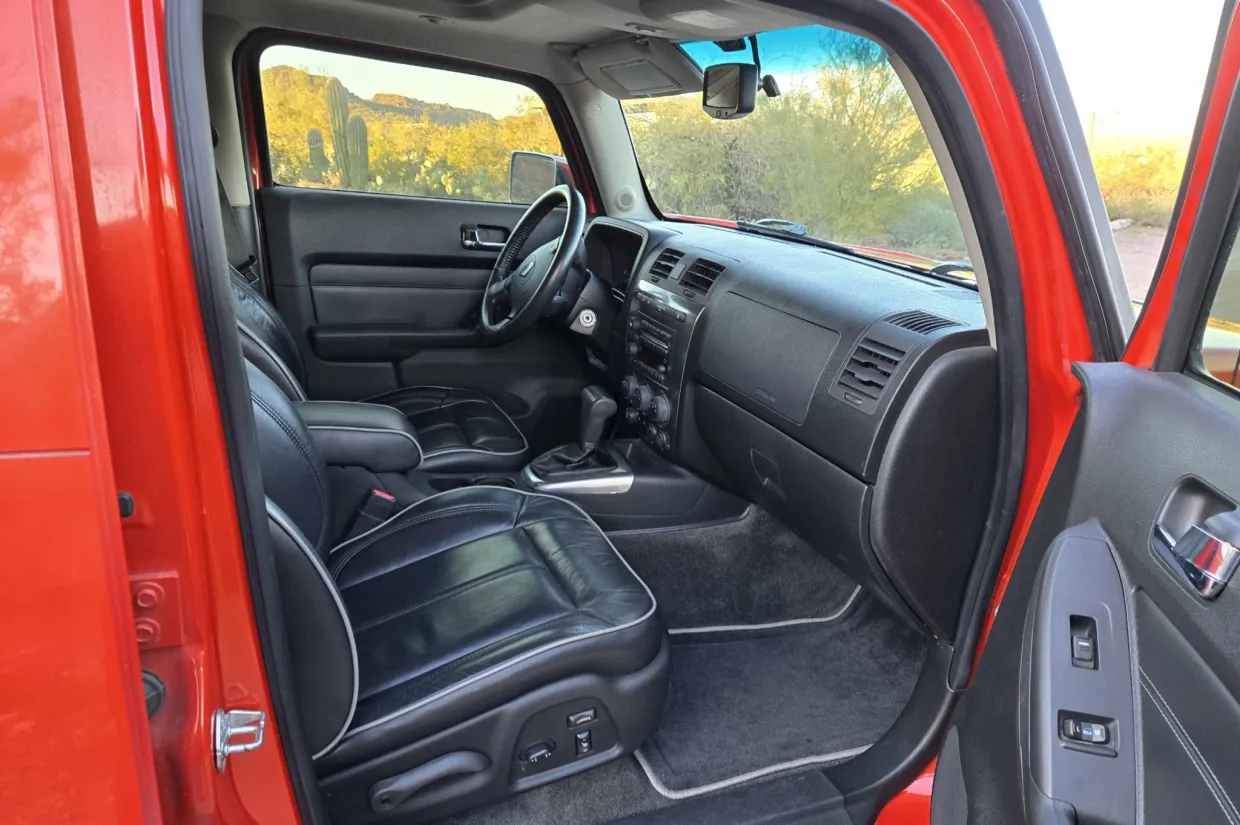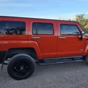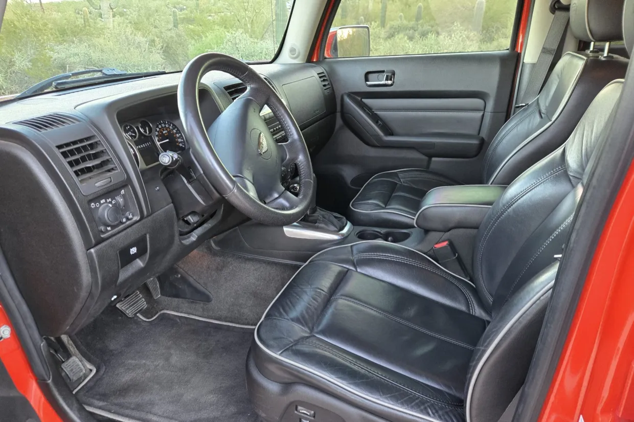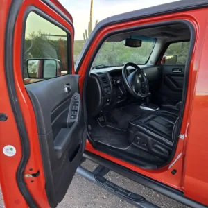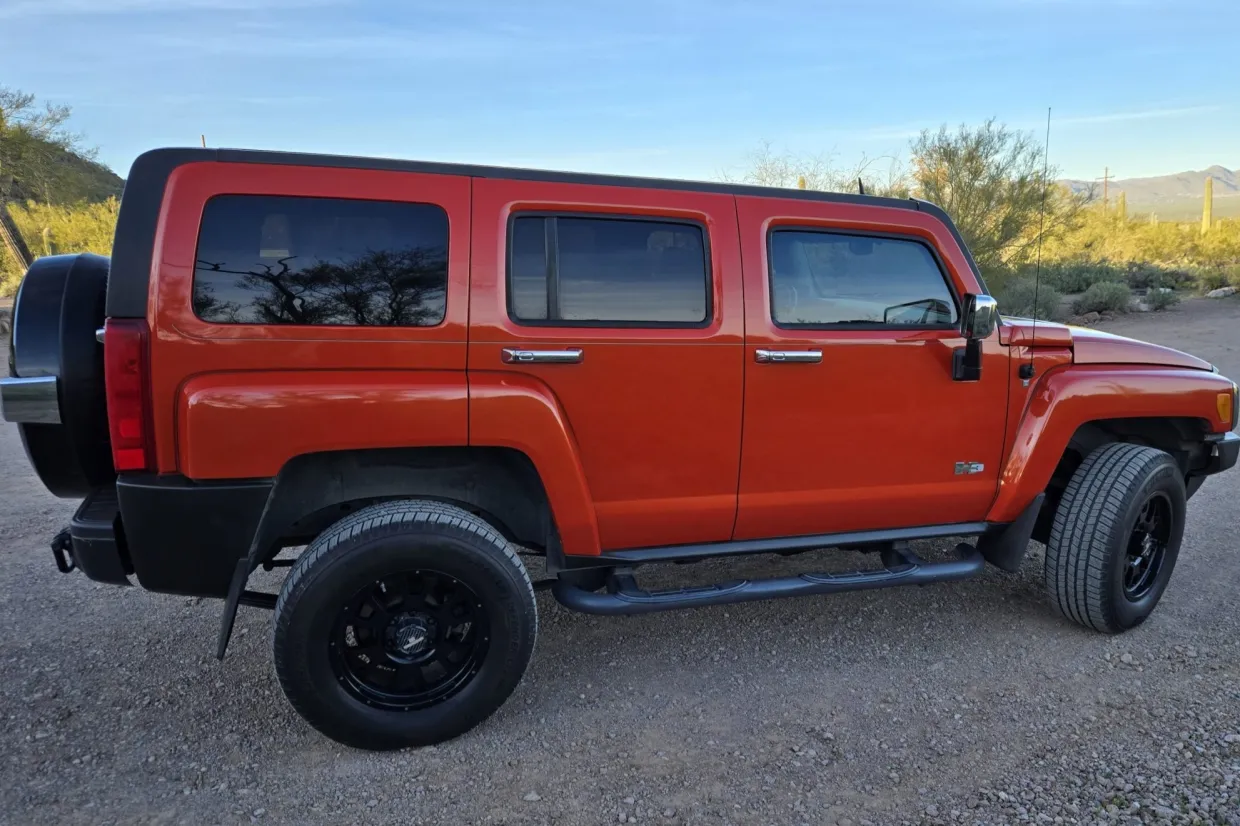 This 2008 Hummer H3 Alpha was purchased new by the seller in Colorado and later relocated to Arizona. It is finished in Solar Flare Metallic over Ebony leather with Morocco inserts and piping, and it is powered by a 5.3-liter Vortec V8 linked with a four-speed automatic transmission and a dual-range transfer case. Features include the Chrome Appearance Package, black 17″ Level 8 wheels, a glass sunroof, a receiver hitch, steel skid plates, heated power-adjustable front seats, a Monsoon sound system, an in-dash six-disc CD changer, keyless entry, a rear-view camera, and air conditioning. This H3 Alpha has 183k miles, and it is now offered at no reserve with a window sticker, the owner’s manual, service records, spare parts, a clean Carfax report, and a clean Arizona title in the seller’s name.