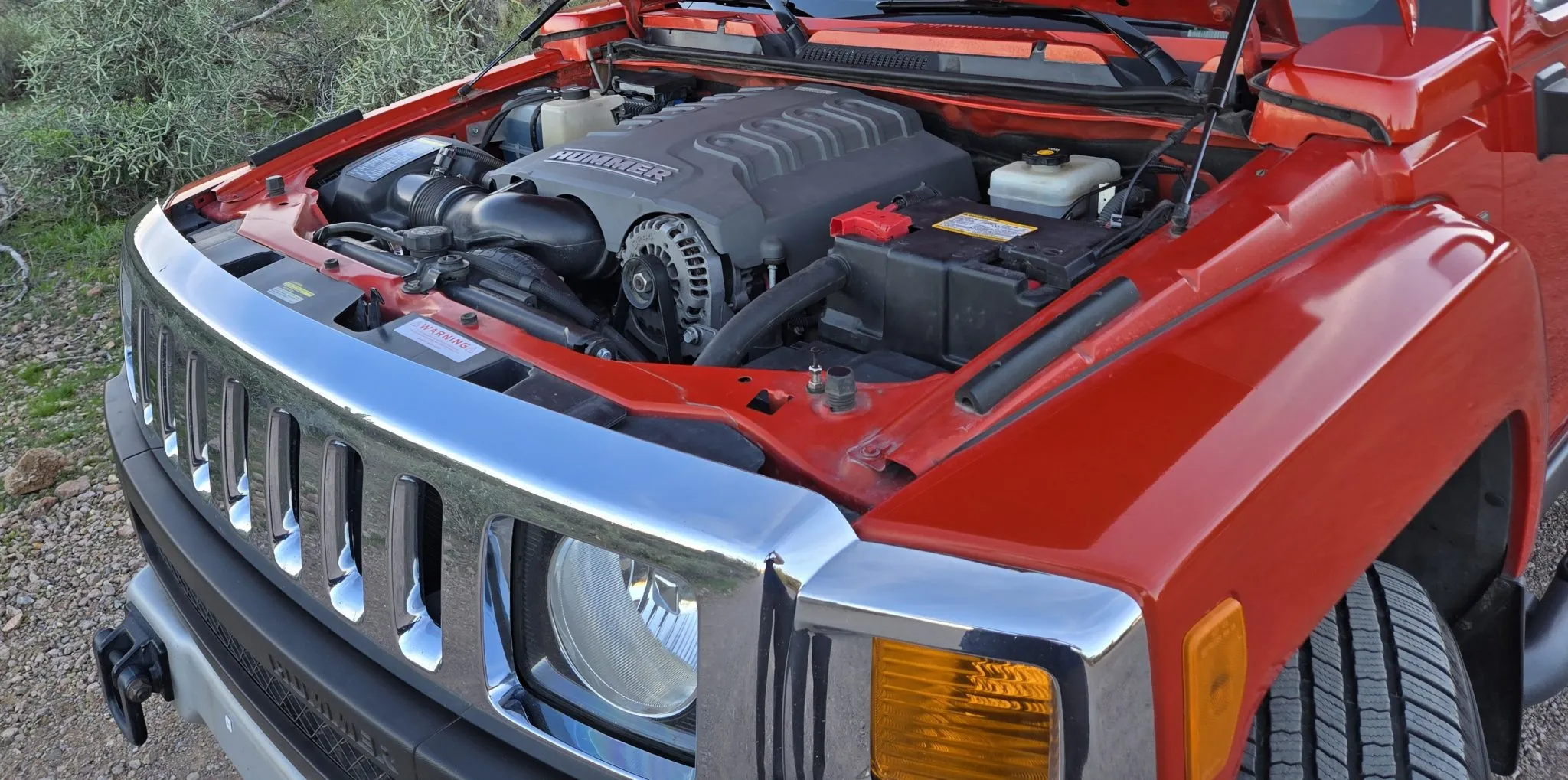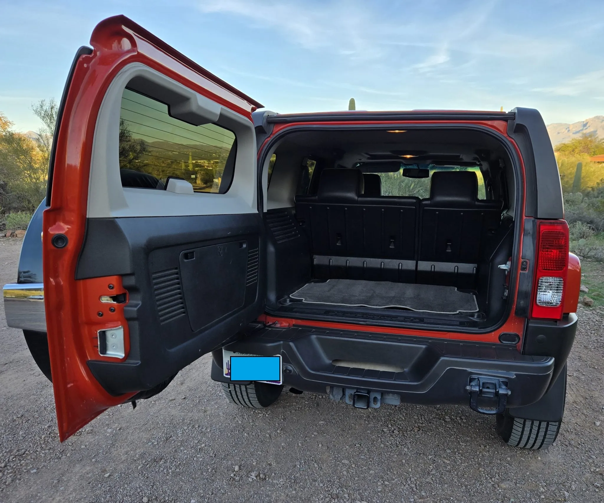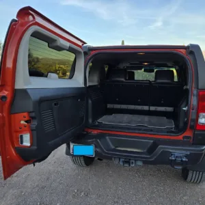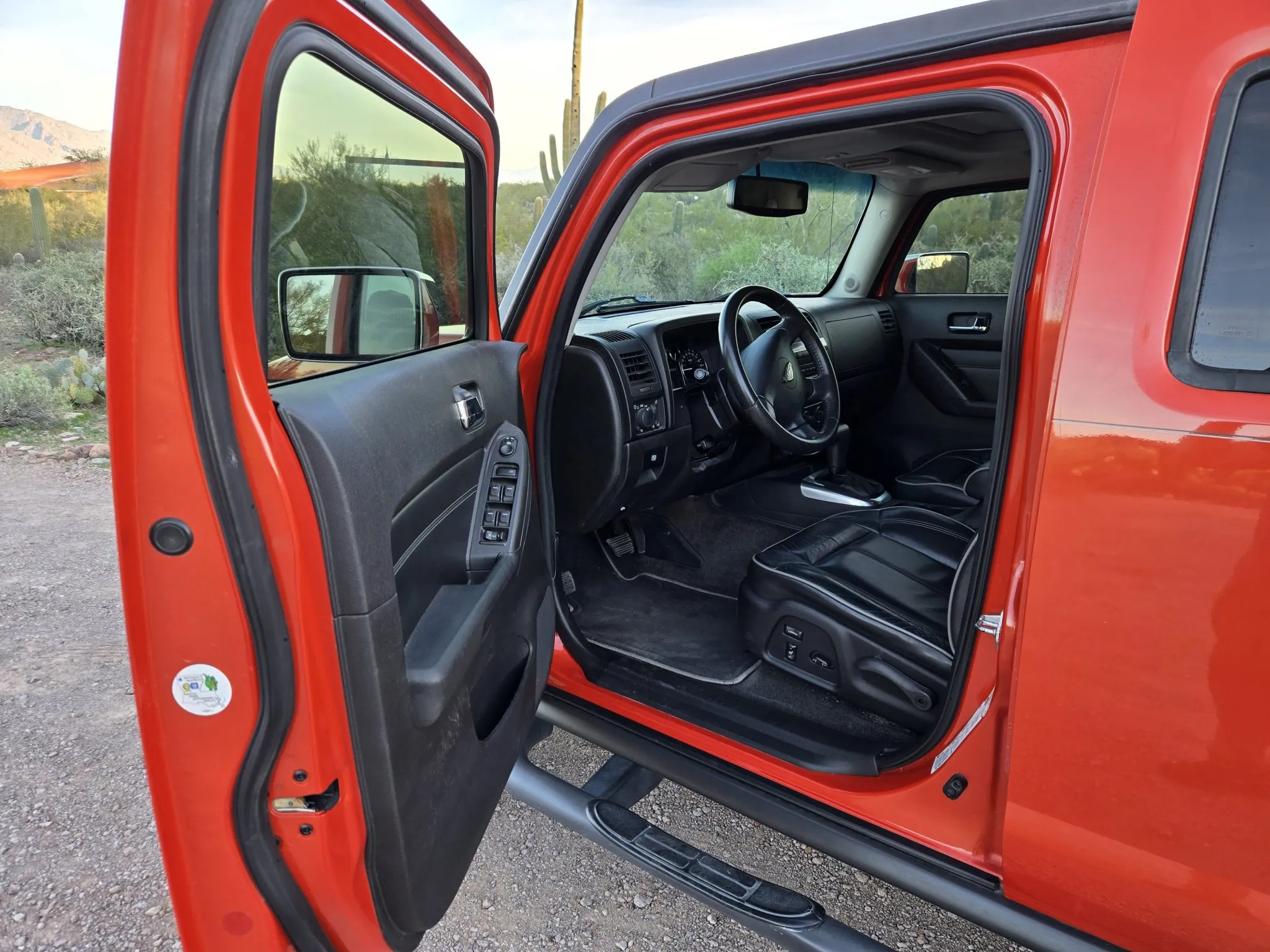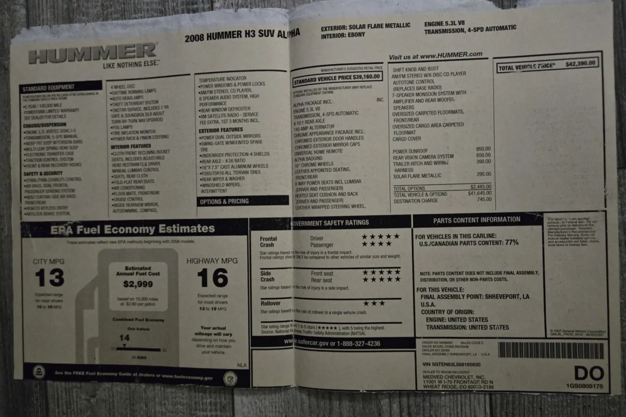This 2008 Hummer H3 Alpha was purchased new by the seller in Colorado and later relocated to Arizona. It is finished in Solar Flare Metallic over Ebony leather with Morocco inserts and piping, and it is powered by a 5.3-liter Vortec V8 linked with a four-speed automatic transmission and a dual-range transfer case. Features include the Chrome Appearance Package, black 17″ Level 8 wheels, a glass sunroof, a receiver hitch, steel skid plates, heated power-adjustable front seats, a Monsoon sound system, an in-dash six-disc CD changer, keyless entry, a rear-view camera, and air conditioning. This H3 Alpha has 183k miles, and it is now offered at no reserve with a window sticker, the owner’s manual, service records, spare parts, a clean Carfax report, and a clean Arizona title in the seller’s name.