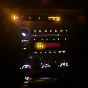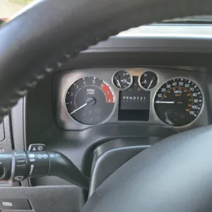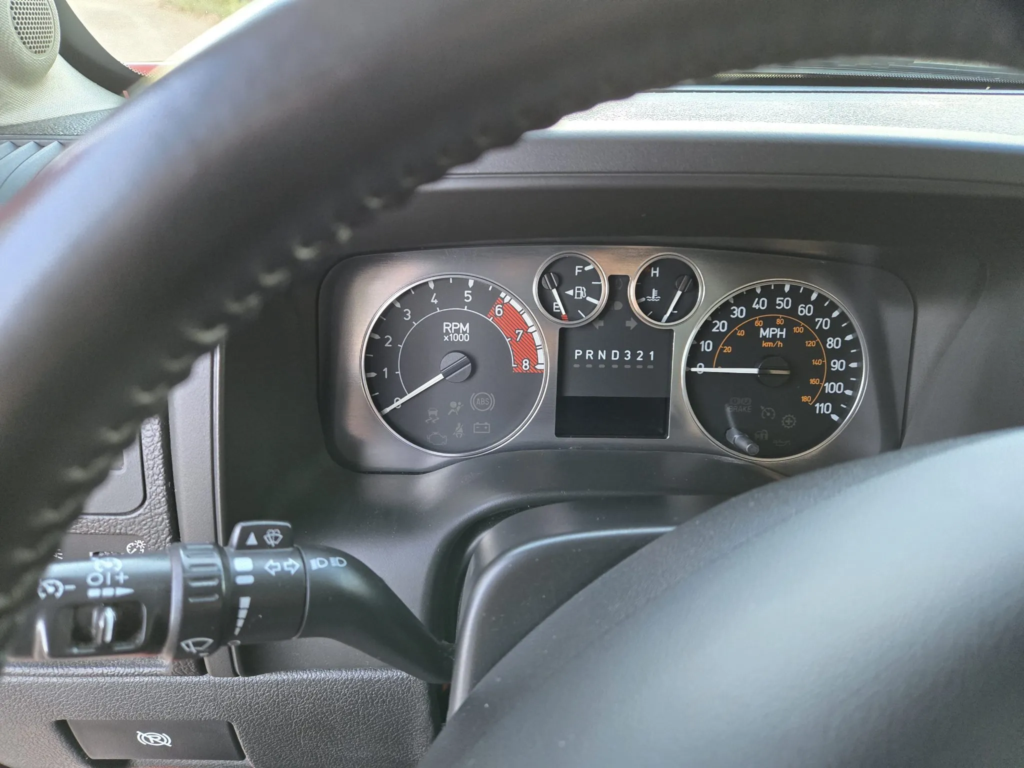 The four-spoke leather-wrapped steering wheel frames a 110-mph speedometer and an 8k-rpm tachometer as well as gauges for fuel level and coolant temperature. The digital odometer indicates 183k miles.