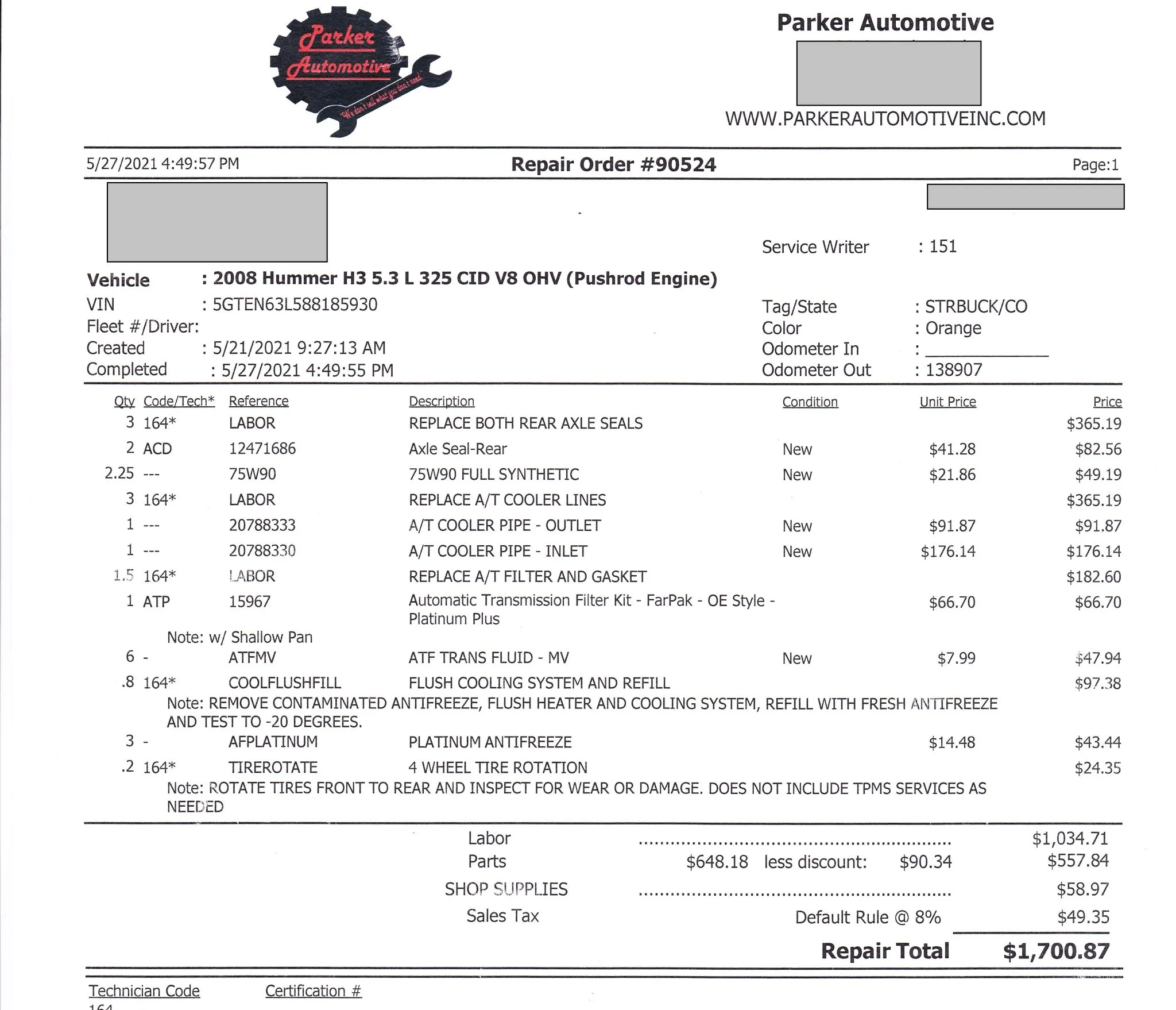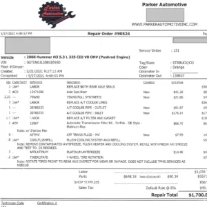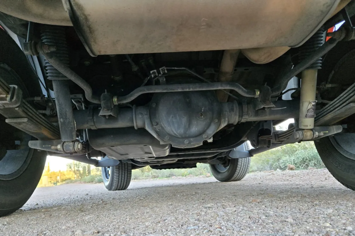 Power is routed to all four wheels through a 4L60-E four-speed automatic transmission and a dual-range transfer case. The rear axle features a 4.10:1 gear ratio. The transmission fluid was changed in June 2023. A replacement axle shaft and three output shaft seals were fitted in December 2024.